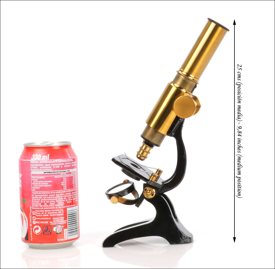 De sencillo diseño y original de época, este antiguo microscopio de estudiante brillará en la mesa de un científico o un aficionado a las antigüedades técnicas.