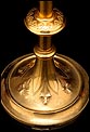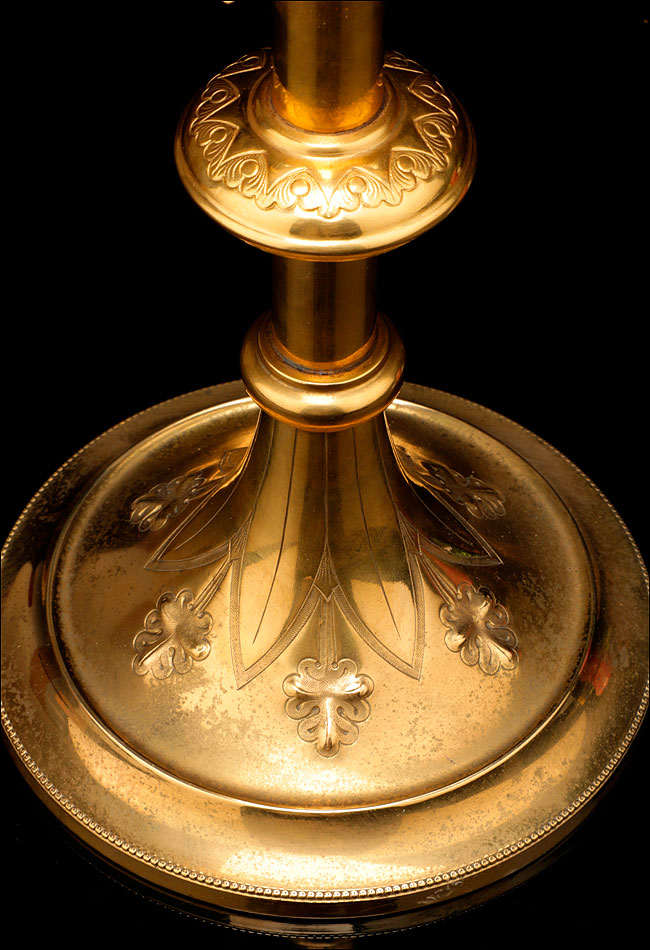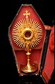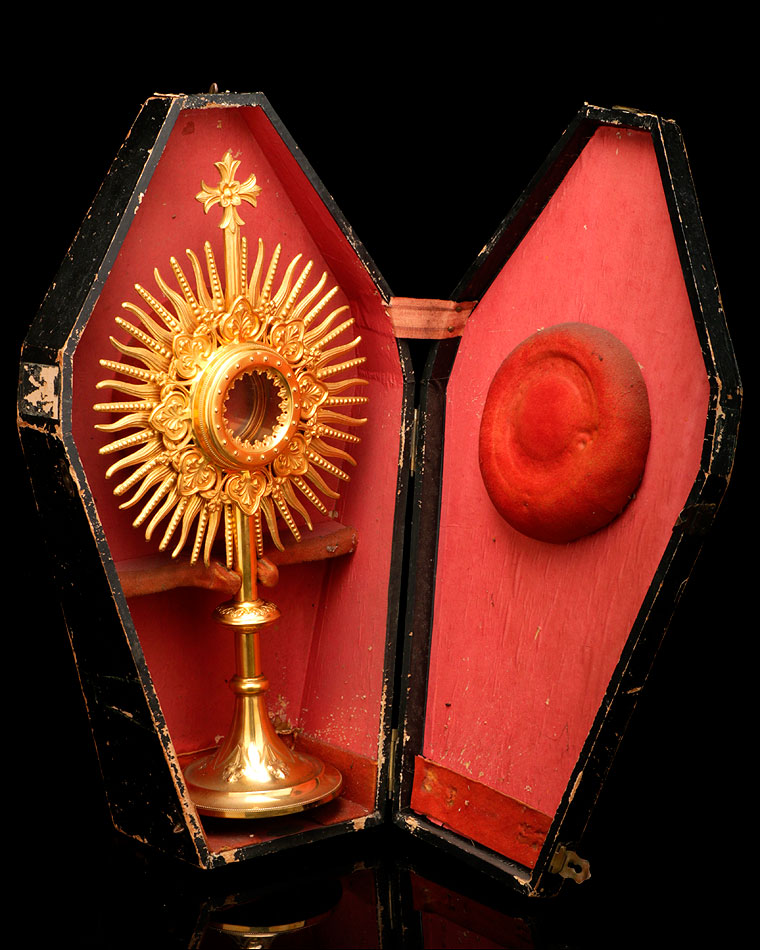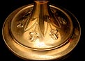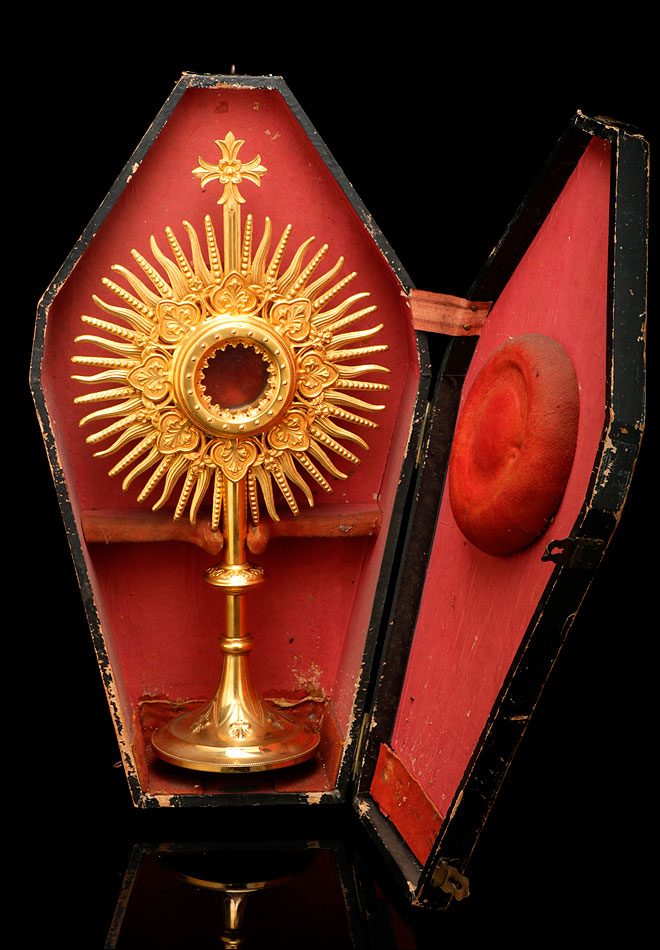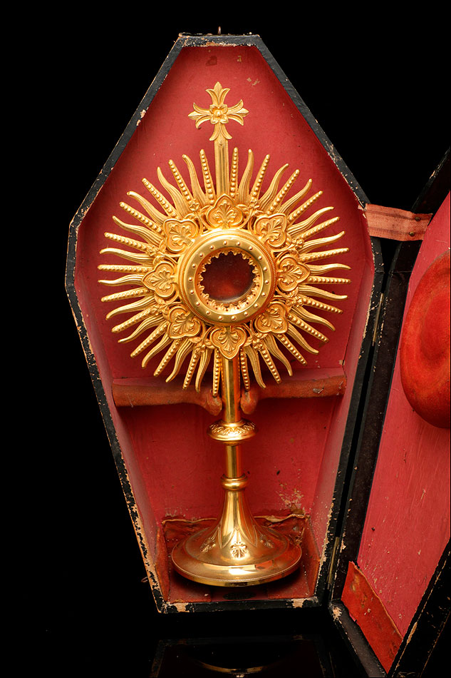 Por su belleza y estilizado diseño, esta custodia antigua de latón dorado merece un lugar muy especial en una vitrina o estantería dedicada al arte religioso.