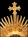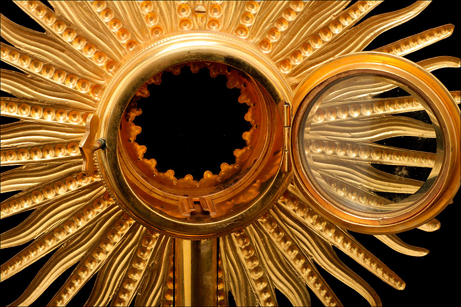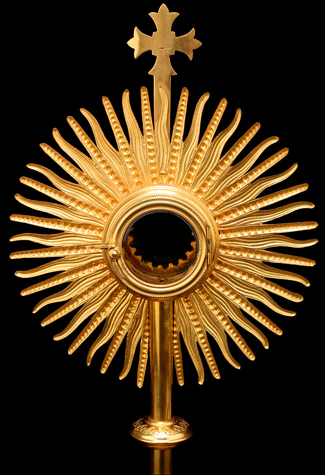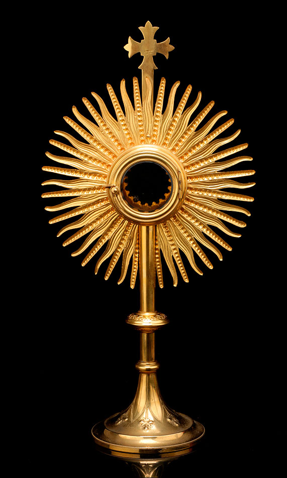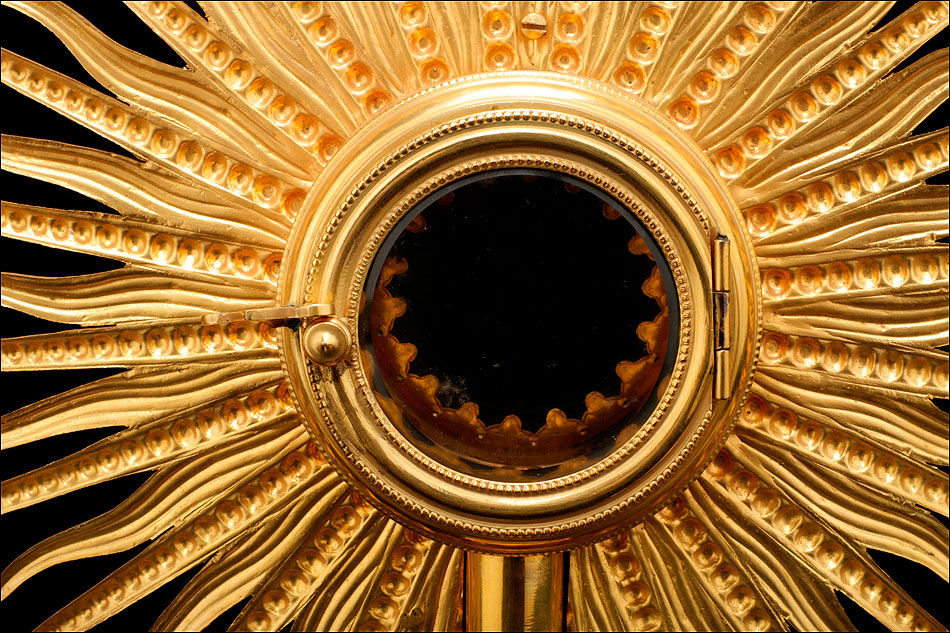El sol es una gran pieza de latón dorado de forma circular, con un hueco en el centro destinado a albergar el viril o luna. El hueco está cerrado por una portezuela de cristal unida al metal mediante una bisagra. A su alrededor se reparte una decoración formada por picas de latón simétricas, decoradas con hojas. De ellas surgen los rayos que dan nombre a esta parte de la custodia: formas triangulares estilizadas, decoradas con franjas o esferas de forma alterna y que crean el efecto de un sol radiante. En la parte superior y coronando la pieza se alza una cruz sencilla, de diseño claramente medieval. El estuche de guardado todavía cumple su función, aunque le falta un elemento de cierre y no cierra del todo bien (debido a su gran antigüedad, la madera se ha combado ligeramente).