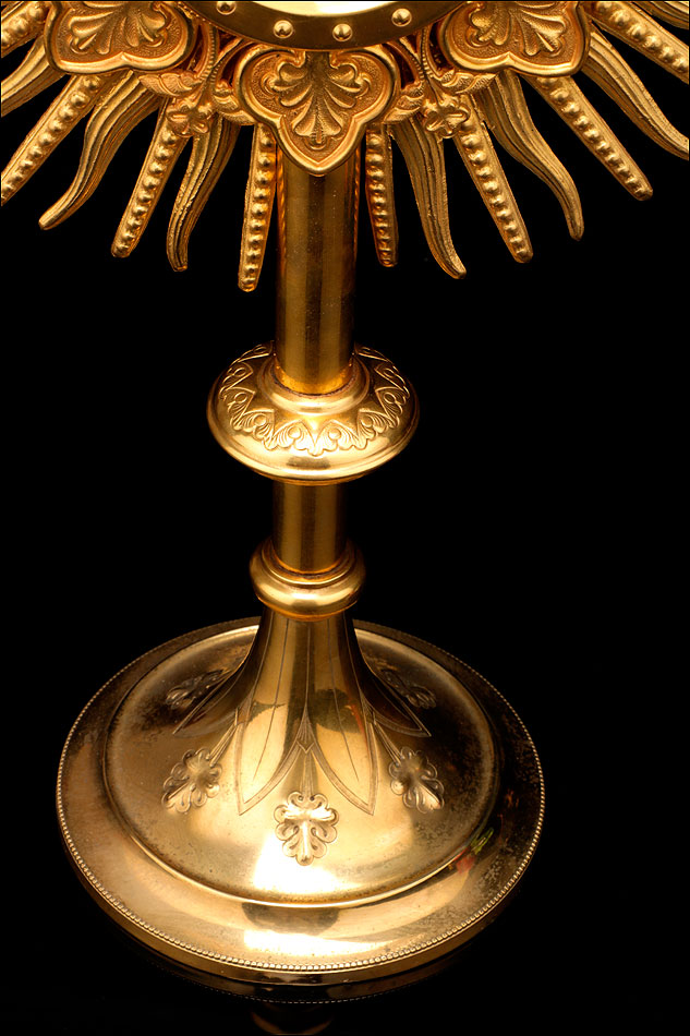La custodia tiene base o pie circular, con forma cónica y superficie lisa. En el punto donde empieza la caña o astil (pieza central que une la base con el sol) hay una delicada decoración grabada de estilo neogótico. Sobre esta zona decorada aparece el nudo secundario; encima de él surge el principal, adornado con una cenefa también de inspiración medieval. Sobre el nudo principal, el astil se conecta con el sol: esta pieza es desmontable y constituye la parte más llamativa e importante de toda la custodia.