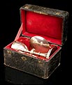 Estilizado y hermoso cáliz de plata maciza dorada, acompañado de una patena y en su estuche original de guardado. Se trata de un artículo fabricado en Francia circa 1900 y en muy buen estado de conservación. El cáliz lleva el contraste de los orfebres Berger & Nesme y el de la plata francesa, siendo una pieza original de época y de calidad garantizada. Está decorado con grabados realizados a mano, sencillos y elegantes; junto con su airoso diseño, esta decoración convierte a este cáliz en un artículo de gran belleza que destacará en cualquier colección o vitrina.