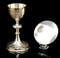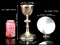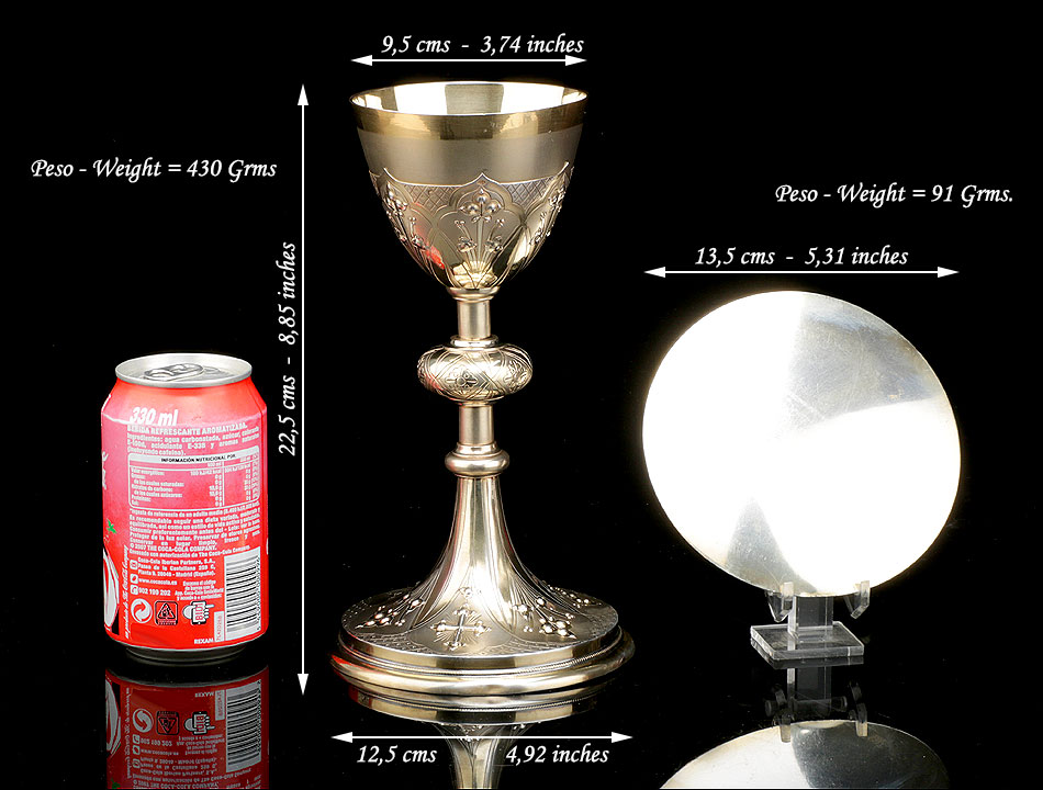 Medidas: Cáliz: Ancho de la Base: 12,5 cm. Ancho de la Copa: 9,5 cm. Alto: 22,5 cm. Peso: 430 g. Patena: Diámetro: 13,5 cm. Peso: 91 g.