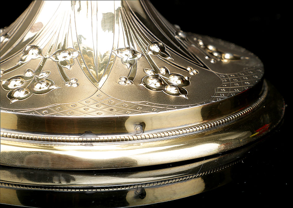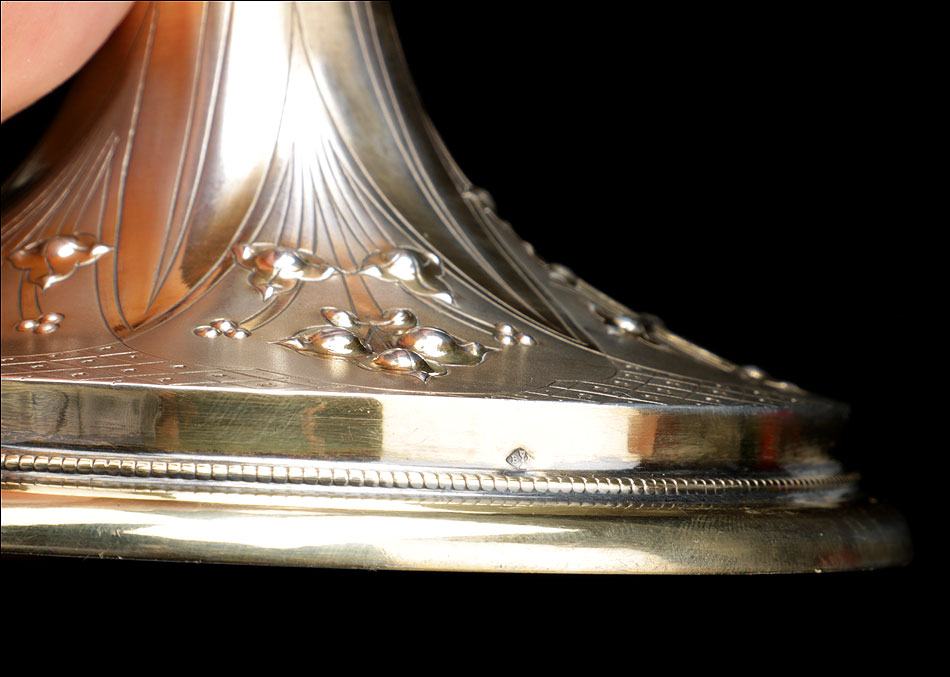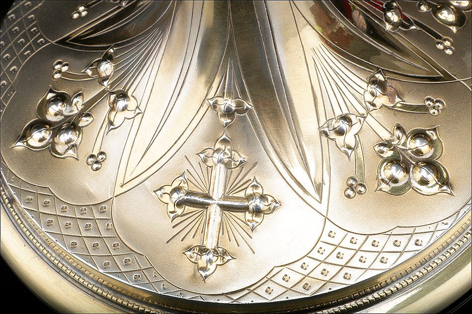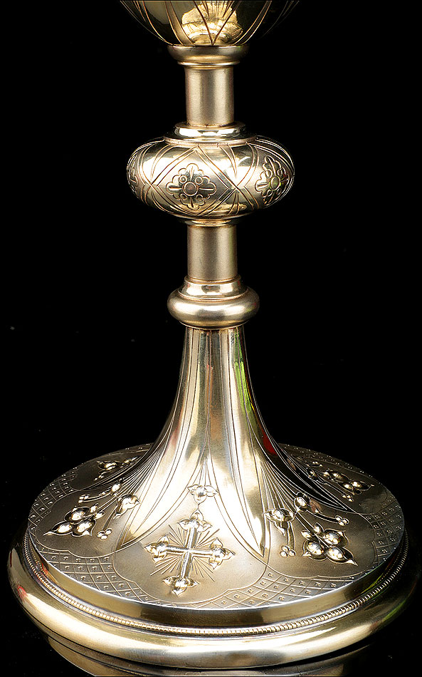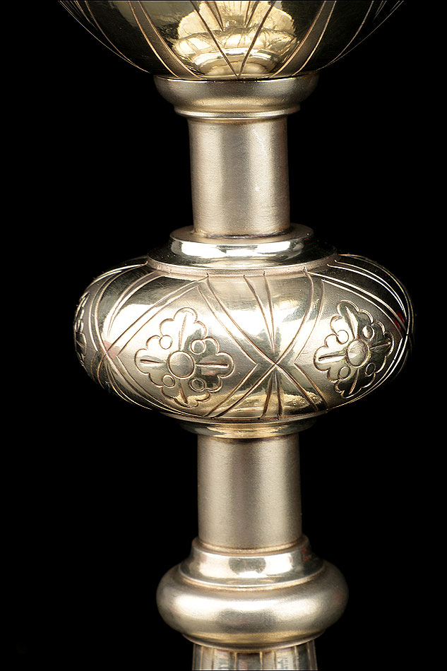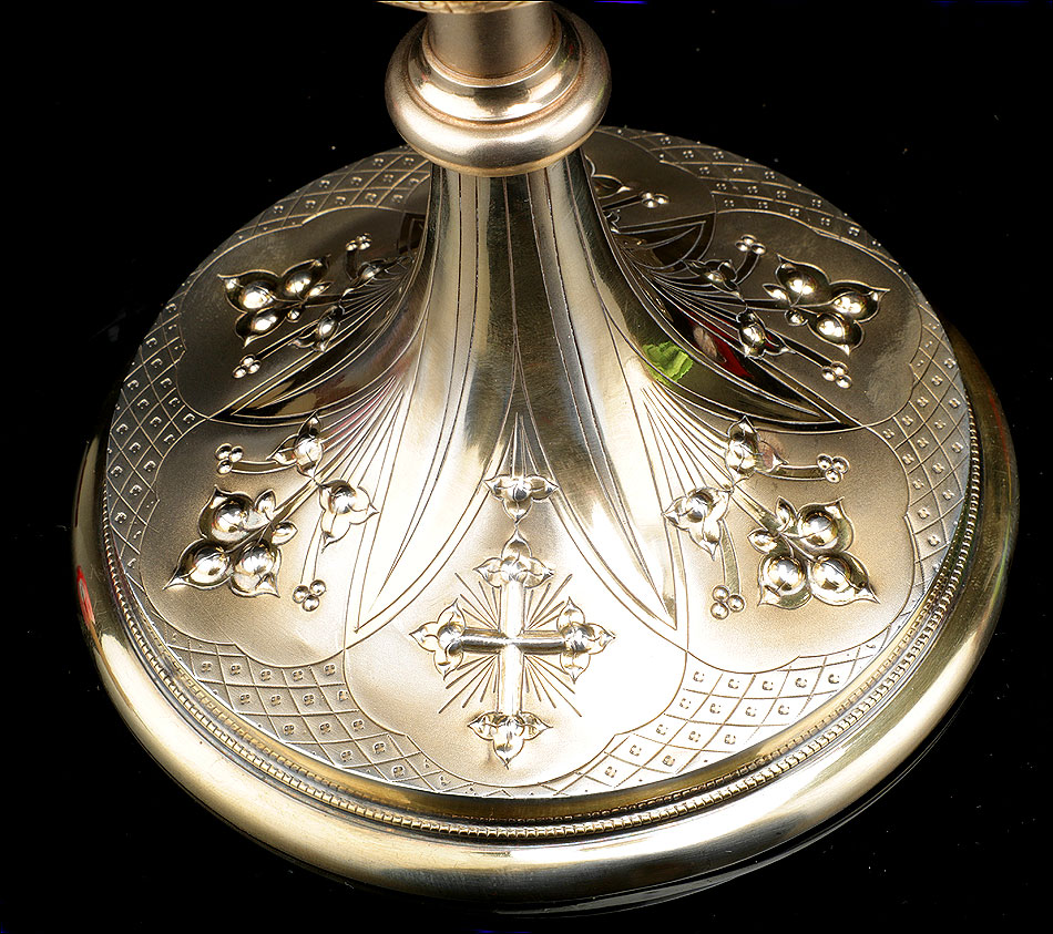 La base es circular y se afina hacia el tallo, creando una forma cónica. En el borde encontramos los contrastes antes mencionados. El correspondiente a los orfebres representa un cáliz situado entre las iniciales B y N, dentro de un rombo. La firma Berger & Nesme corresponde a Charles-Frédéric Berger y Henri Nesme, orfebres especializados en platería religiosa y artículos de mesa. Su taller estaba en el número 122 de la rue Saint-Georges de Lyon, y se mantuvo en activo entre 1897 y 1910. La superficie de la base está decorada con cruces en relieve rodeadas de finas líneas grabadas que crean formas de flores, rayos y hojas. Sobre la base, el nudo reproduce esta misma decoración.