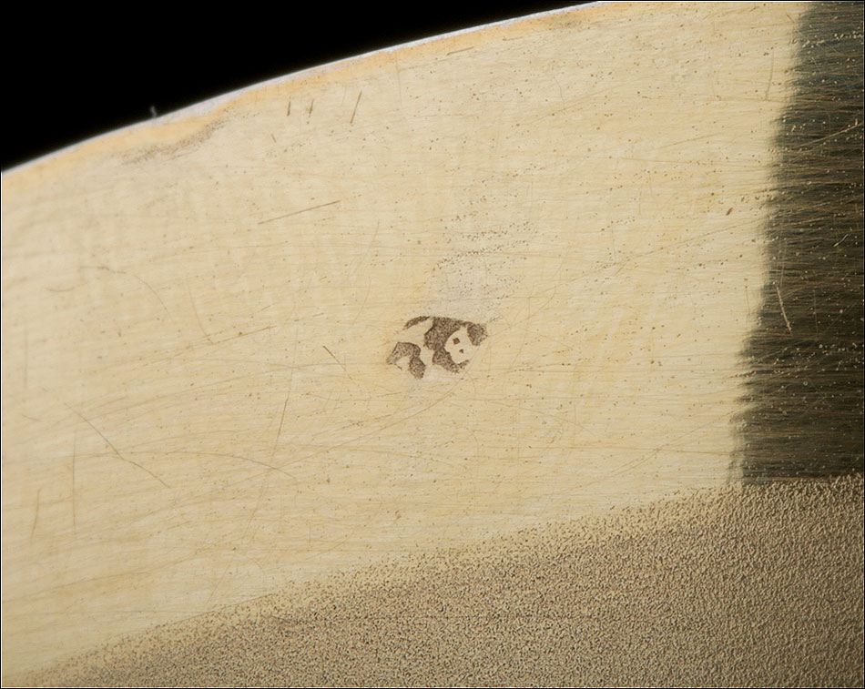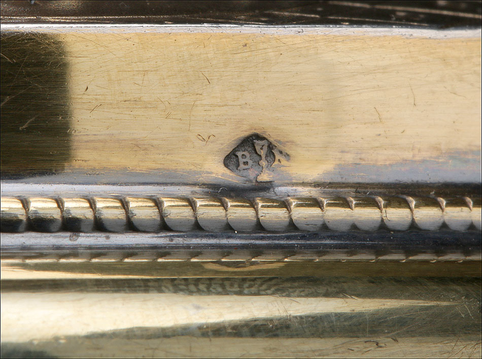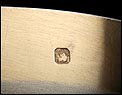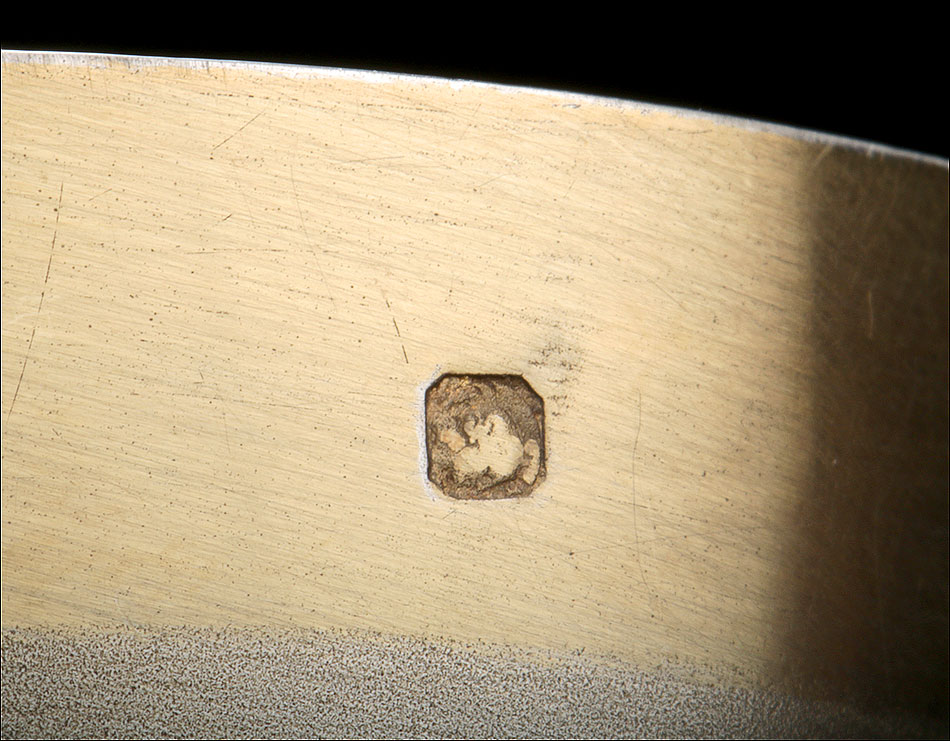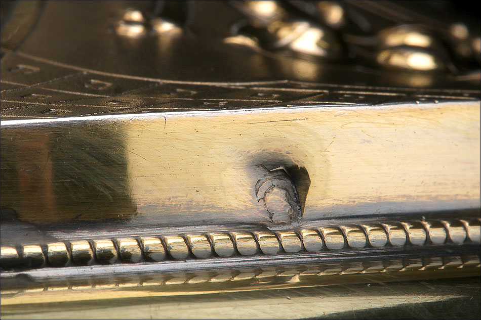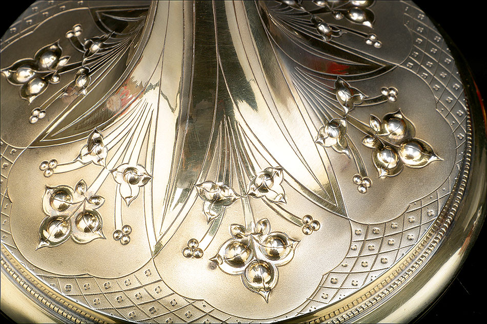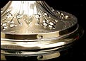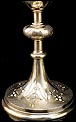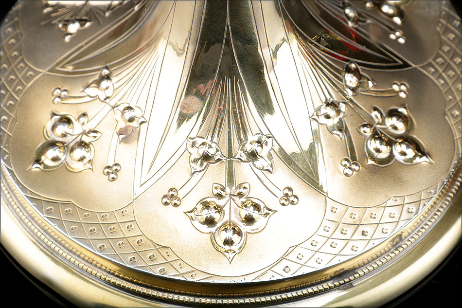 La base es circular y se afina hacia el tallo, creando una forma cónica. En el borde encontramos los contrastes antes mencionados. El correspondiente a los orfebres representa un cáliz situado entre las iniciales B y N, dentro de un rombo. La firma Berger & Nesme corresponde a Charles-Frédéric Berger y Henri Nesme, orfebres especializados en platería religiosa y artículos de mesa. Su taller estaba en el número 122 de la rue Saint-Georges de Lyon, y se mantuvo en activo entre 1897 y 1910. La superficie de la base está decorada con cruces en relieve rodeadas de finas líneas grabadas que crean formas de flores, rayos y hojas. Sobre la base, el nudo reproduce esta misma decoración.