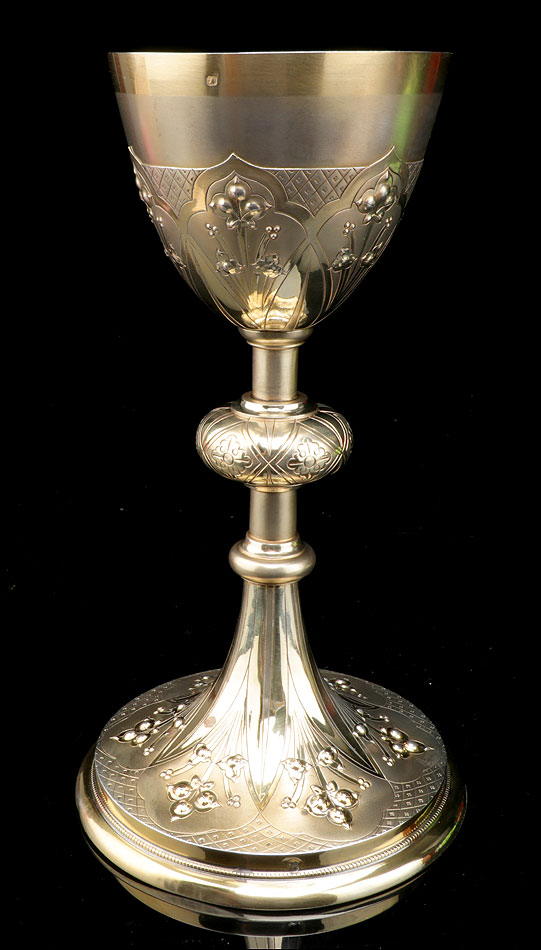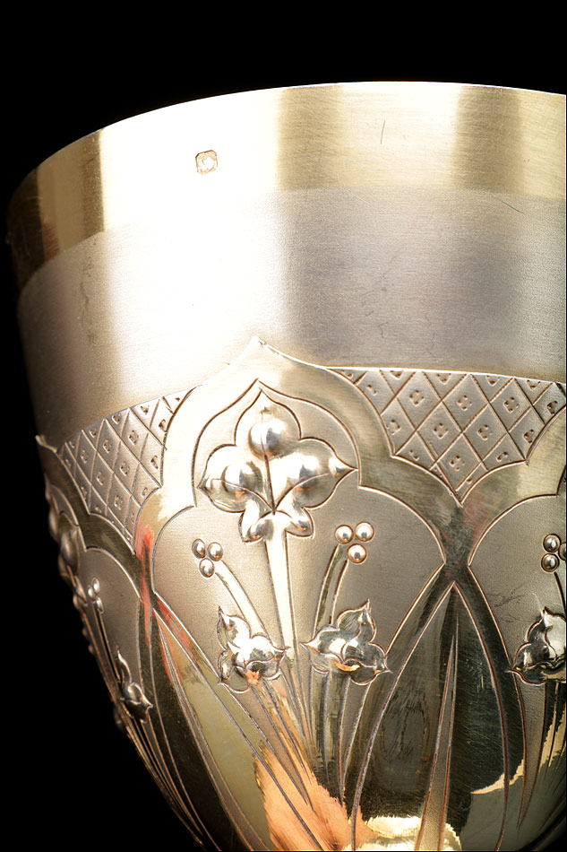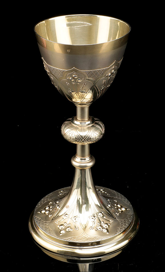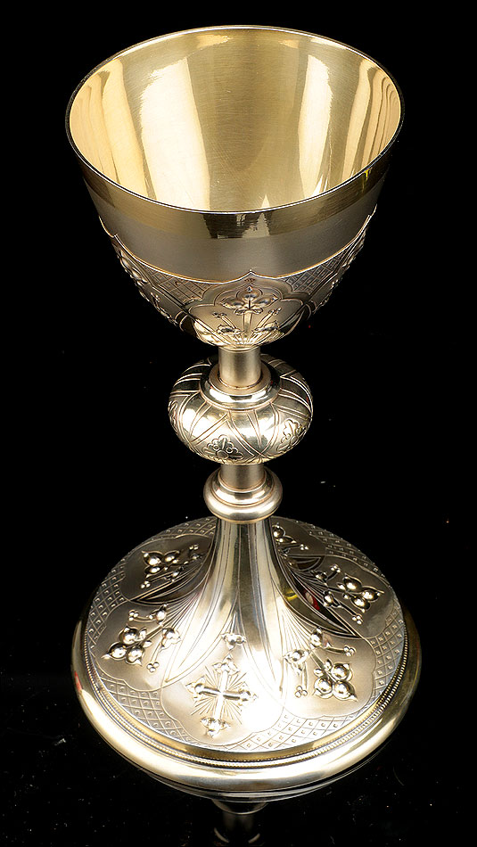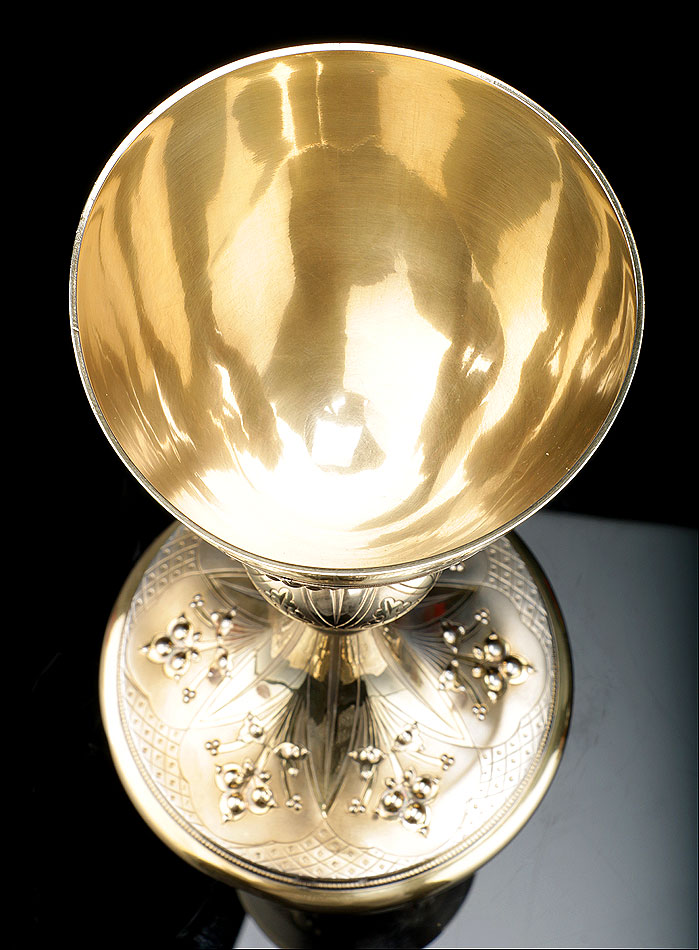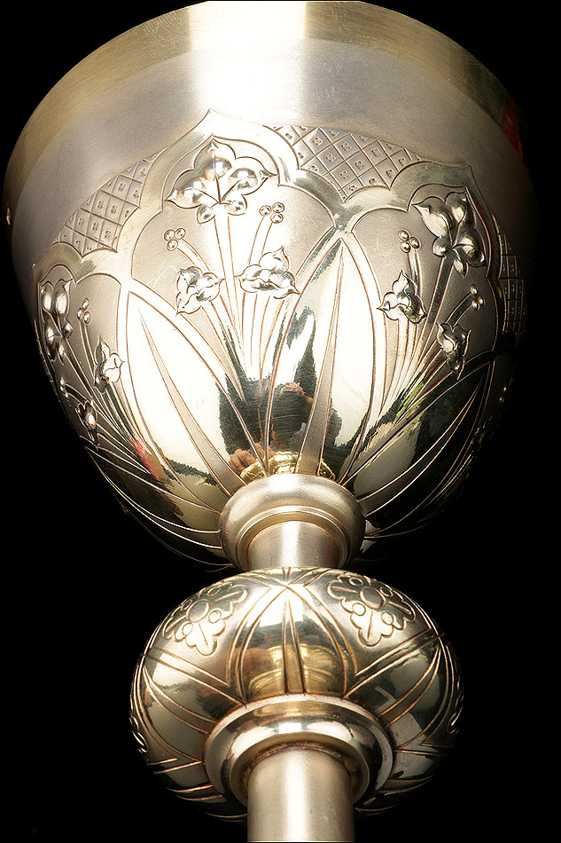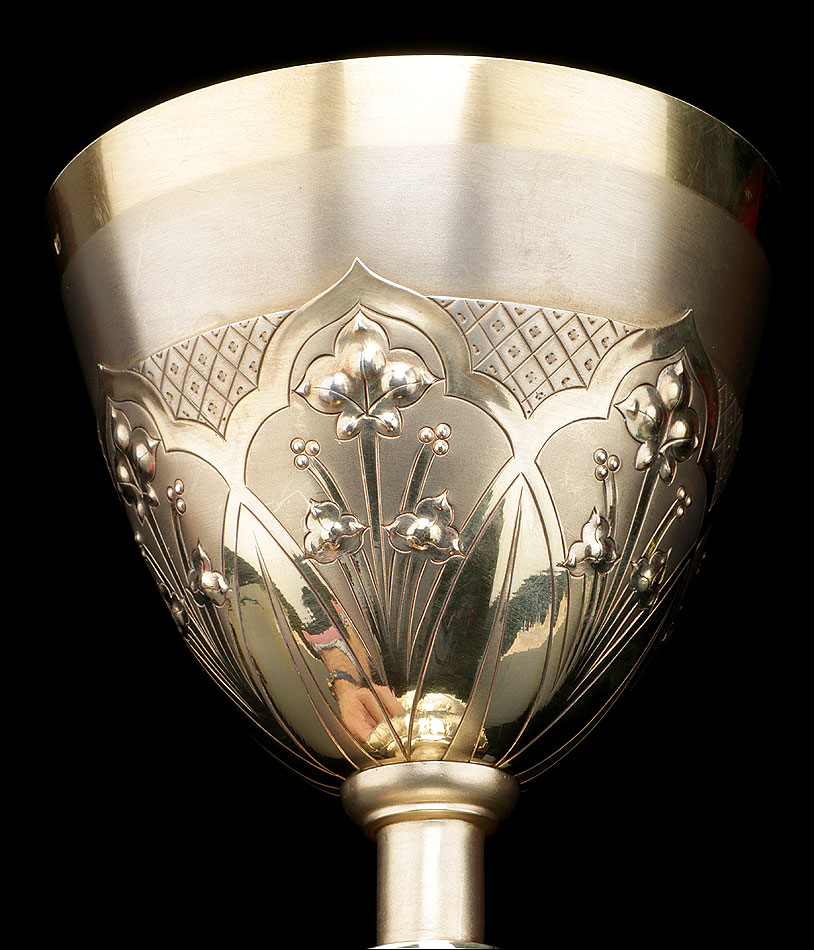 En la copa continúa la misma estética y los mismos motivos ornamentales, tanto en relieve como grabados. En este caso, en lugar de cruces encontramos estilizadas flores de largos tallos situadas bajo arcos góticos. Junto al borde de la copa están grabados los mismos contrastes que aparecen en la base. Acompañando al cáliz hay una sencilla patena de plata, sin contrastes ni decoración grabada alguna. El conjunto se puede guardar en el estuche original de época, algo deteriorado por el exterior pero todavía eficaz para proteger y transportar el cáliz.