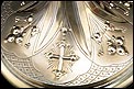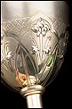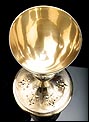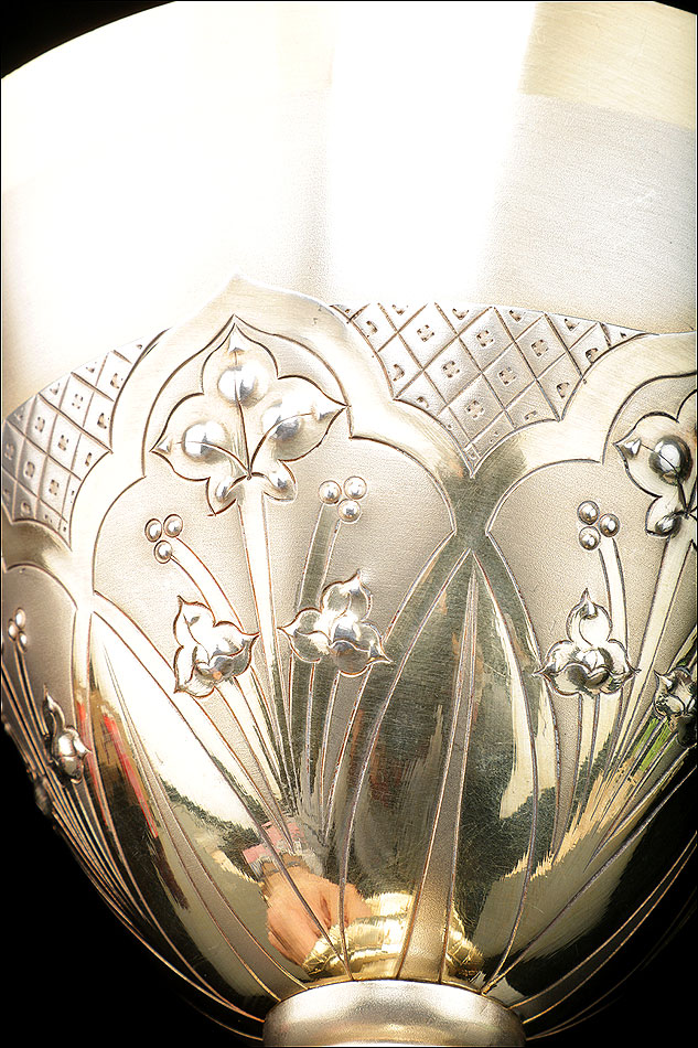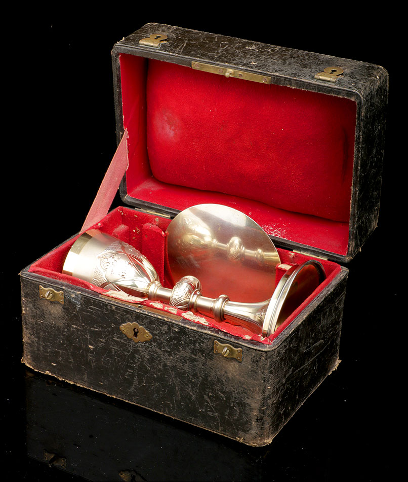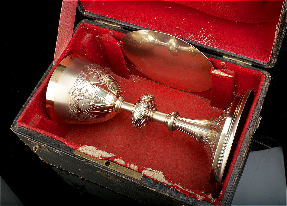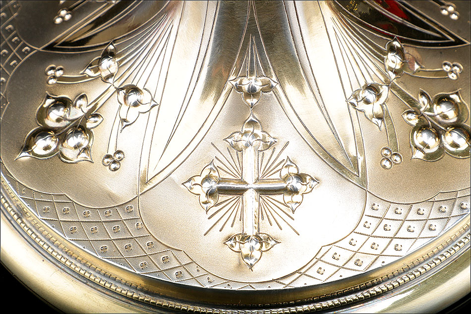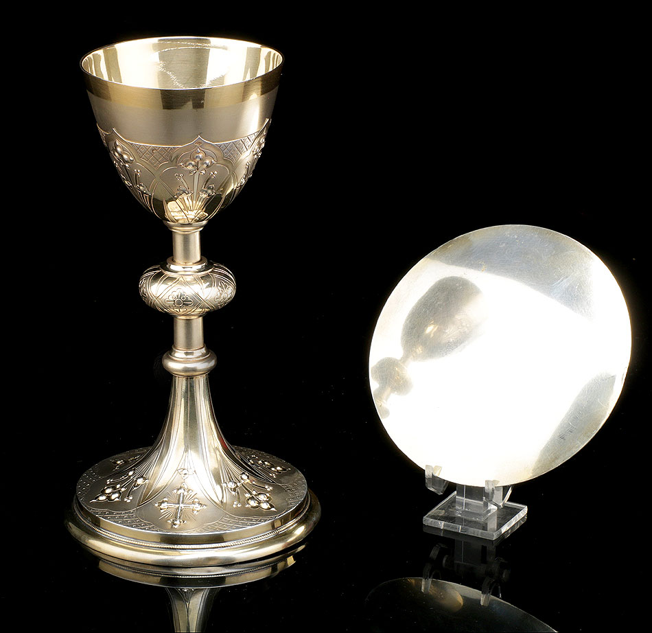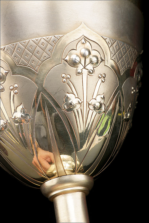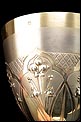 En la copa continúa la misma estética y los mismos motivos ornamentales, tanto en relieve como grabados. En este caso, en lugar de cruces encontramos estilizadas flores de largos tallos situadas bajo arcos góticos. Junto al borde de la copa están grabados los mismos contrastes que aparecen en la base. Acompañando al cáliz hay una sencilla patena de plata, sin contrastes ni decoración grabada alguna. El conjunto se puede guardar en el estuche original de época, algo deteriorado por el exterior pero todavía eficaz para proteger y transportar el cáliz.