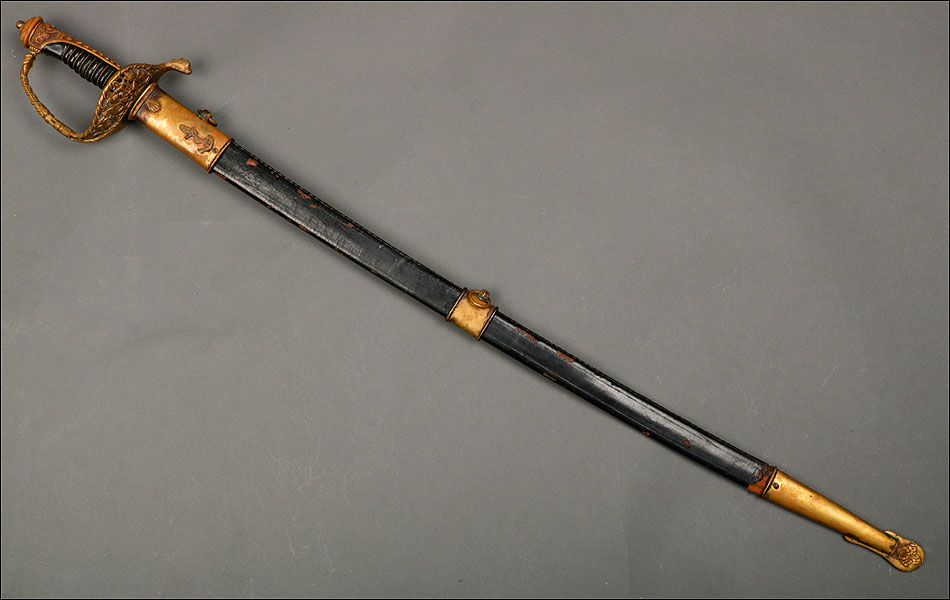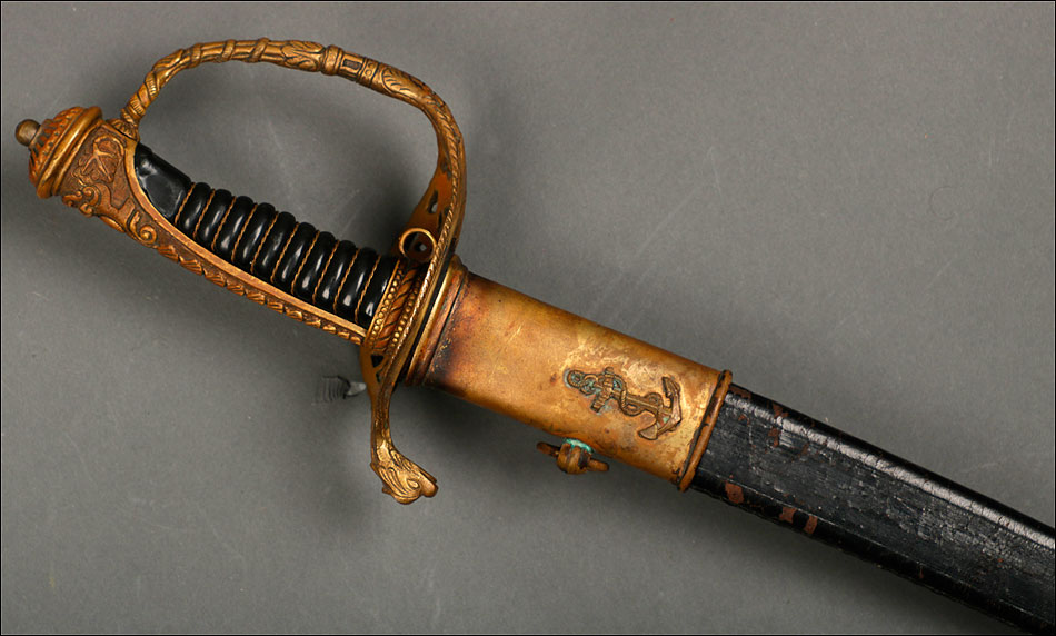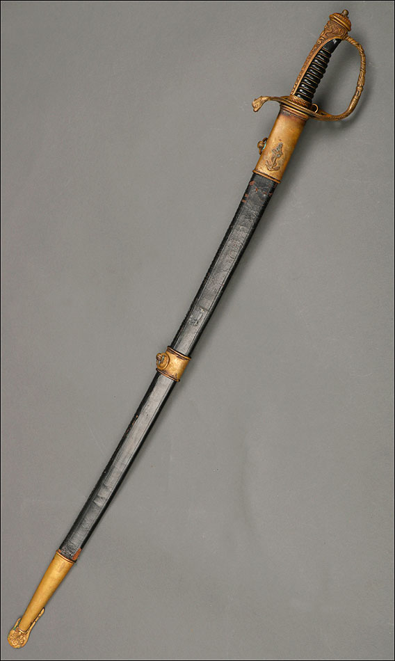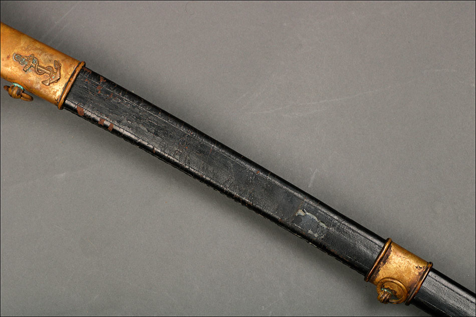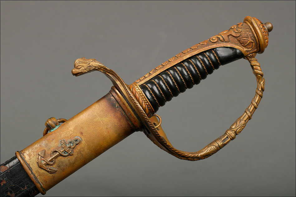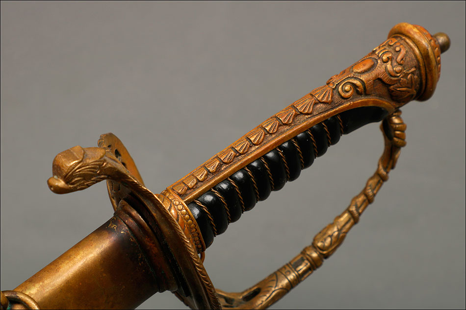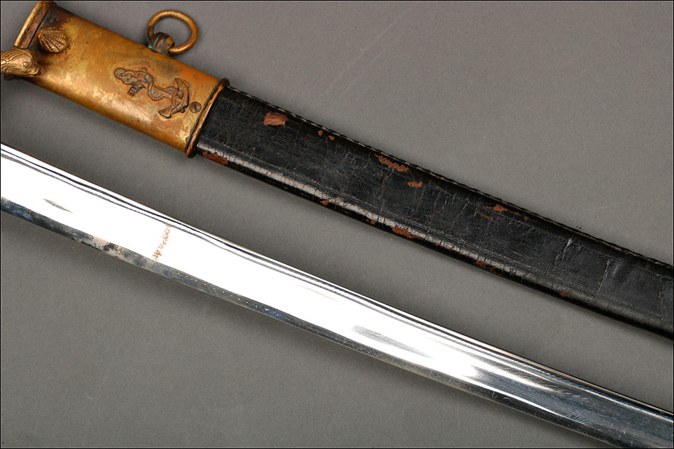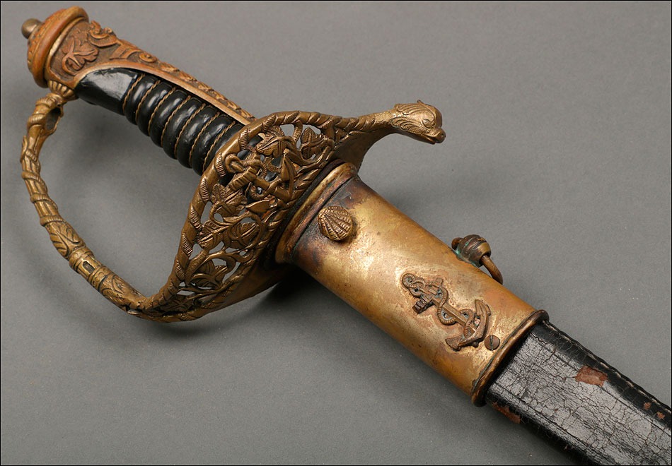Soberbia y antigua espada de oficial de la marina francesa, fabricada a principios del siglo XX y en buenas condiciones. La espada tiene hoja de acero con dos pequeños contrastes situados cerca de la empuñadura. También lleva una inscripción grabada en el metal (Coulaux & Cie Klingenthal). La montura lleva puño de madera ebonizada con torzal de latón, en muy buen estado de conservación. La cara exterior del puño está cubierta por una pieza de latón con decoración grabada que se une al pomo, fabricado del mismo metal. Del pomo sale el extremo más estrecho del guardamano de latón, una hermosa pieza con trabajo en celosía en la que podemos distinguir ramas con hojas y un ancla. El extremo libre del guardamano tiene la forma de una cabeza de ave. La espada se presenta con su vaina original de época, de cuero negro con boquilla, batiente y refuerzo central de latón. La boquilla lleva un ancla en relieve, símbolo del cuerpo de la marina al que perteneció esta espada.