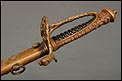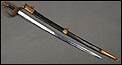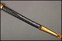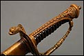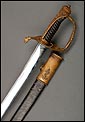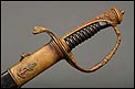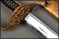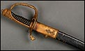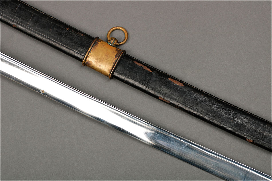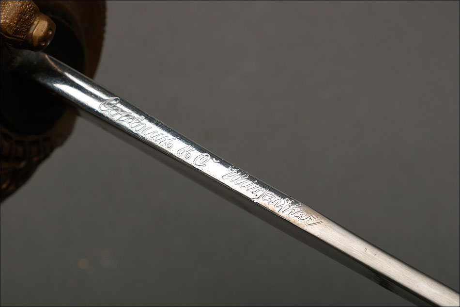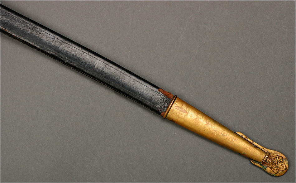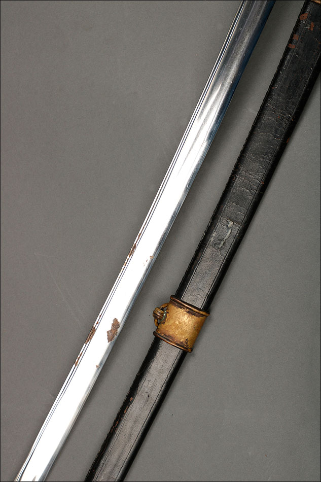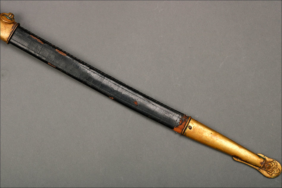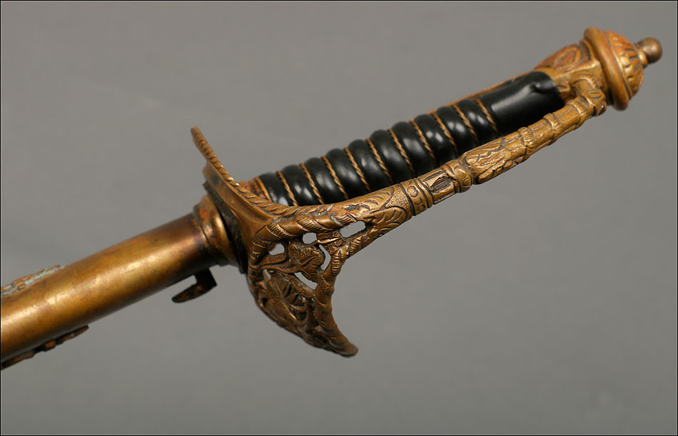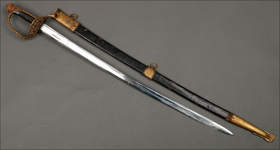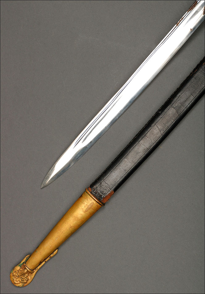 Soberbia y antigua espada de oficial de la marina francesa, fabricada a principios del siglo XX y en buenas condiciones. La espada tiene hoja de acero con dos pequeños contrastes situados cerca de la empuñadura. También lleva una inscripción grabada en el metal (Coulaux & Cie Klingenthal). La montura lleva puño de madera ebonizada con torzal de latón, en muy buen estado de conservación. La cara exterior del puño está cubierta por una pieza de latón con decoración grabada que se une al pomo, fabricado del mismo metal. Del pomo sale el extremo más estrecho del guardamano de latón, una hermosa pieza con trabajo en celosía en la que podemos distinguir ramas con hojas y un ancla. El extremo libre del guardamano tiene la forma de una cabeza de ave. La espada se presenta con su vaina original de época, de cuero negro con boquilla, batiente y refuerzo central de latón. La boquilla lleva un ancla en relieve, símbolo del cuerpo de la marina al que perteneció esta espada.