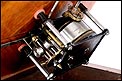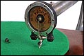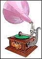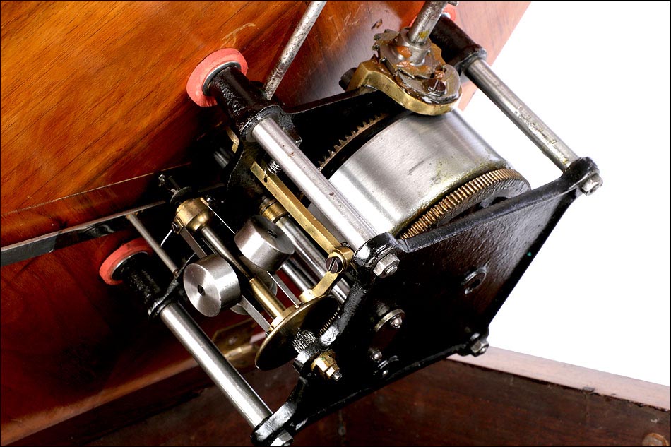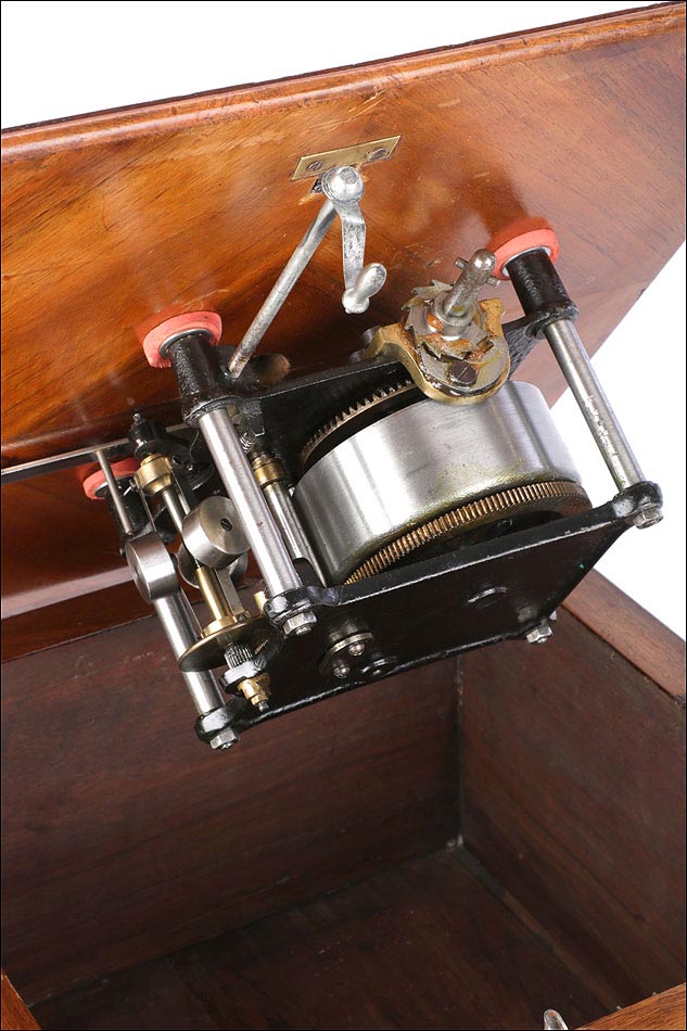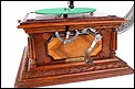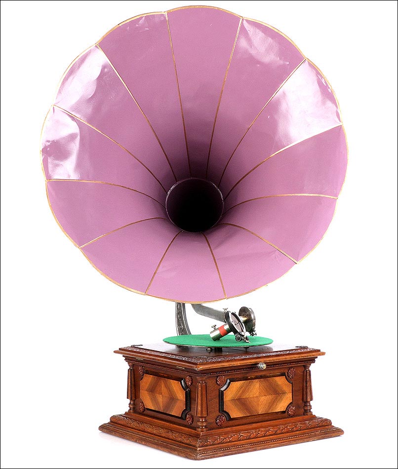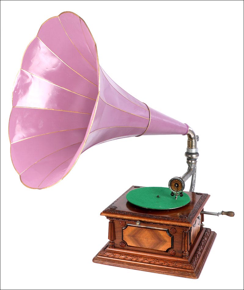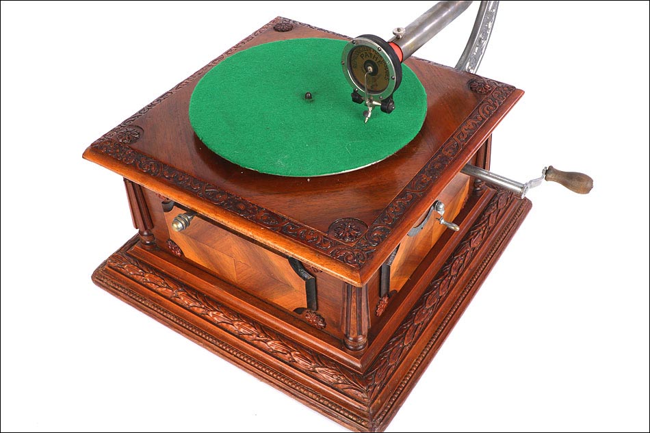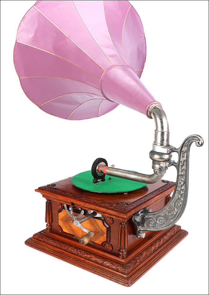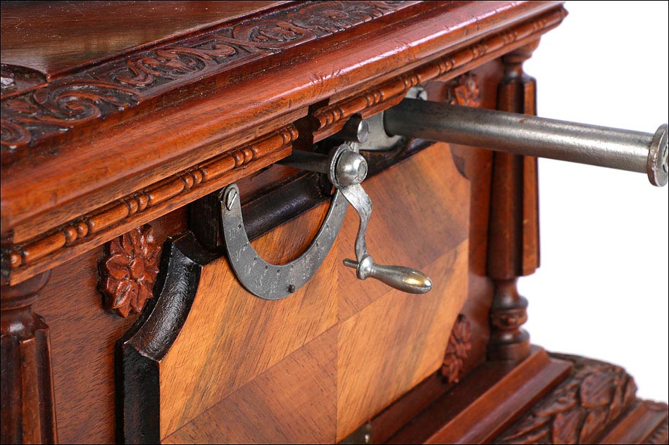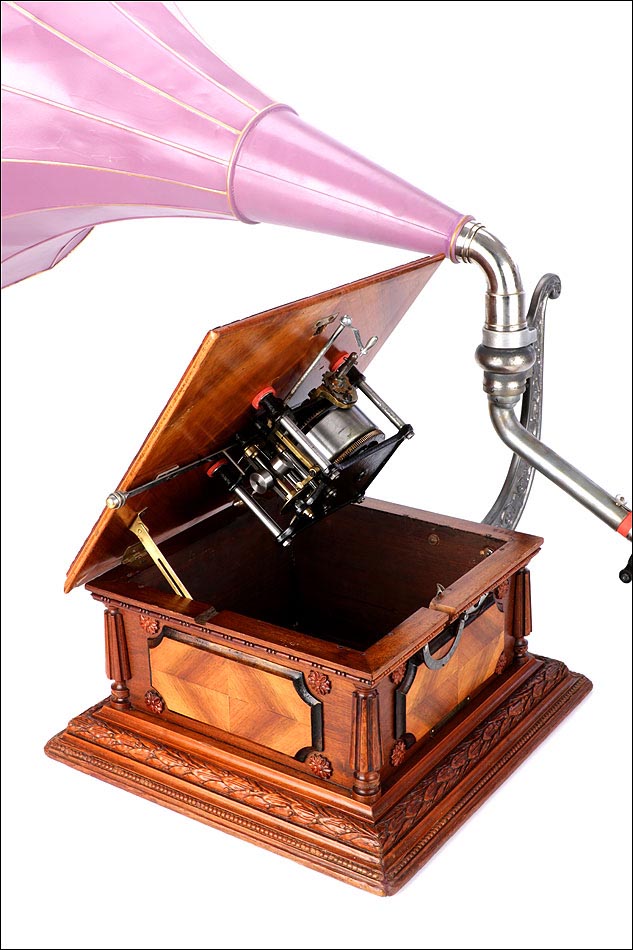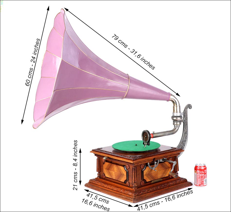 La caja es una magnífica pieza de madera maciza que combina especies de distintos tonos. Está fabricada en madera de caoba, con detalles en relieve en nogal claro en los laterales. La base de molduras está decorada con cenefas vegetales grabadas a mano; en la tabla superior hay otra cenefa, esta vez de motivos abstractos decorativos. La madera está barnizada a muñequilla, un acabado que enfatiza su precioso color y la veta de las especies. El codo de metal plateado que soporta el brazo con la trompa y el reproductor lleva grabada una delicada cenefa. El metal está muy bien conservado. La trompa, por su parte, es de metal esmaltado y ha sido restaurada para recuperar su esplendor original.