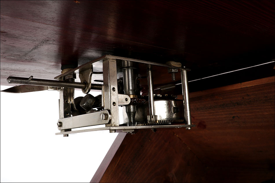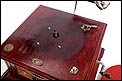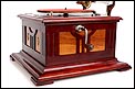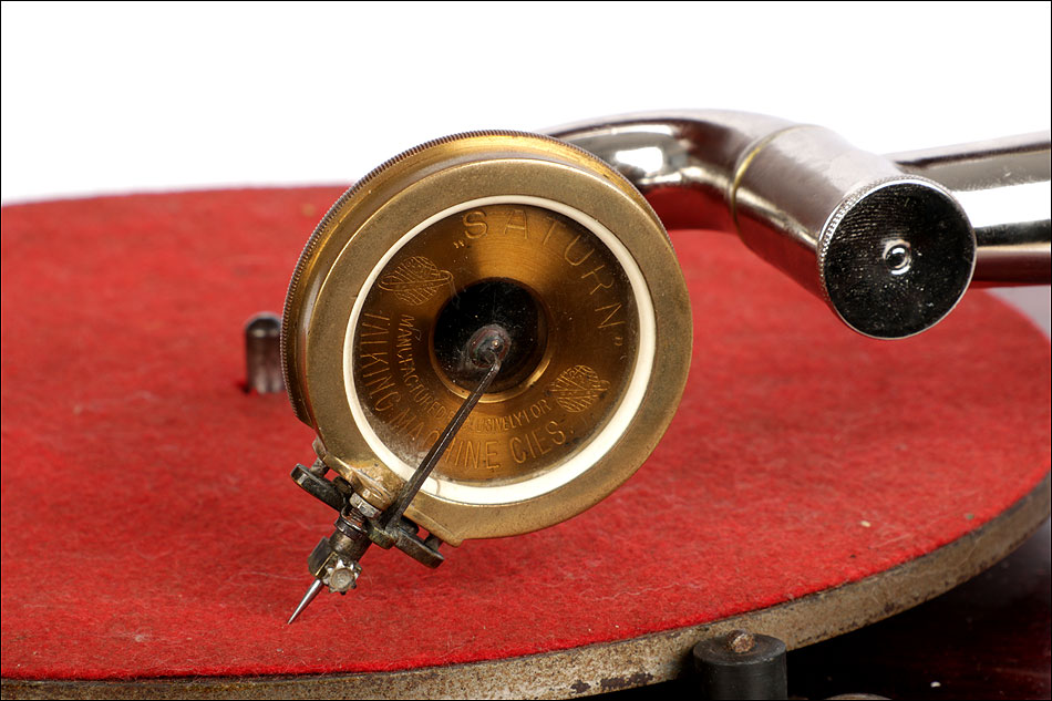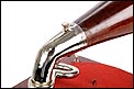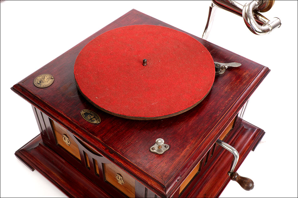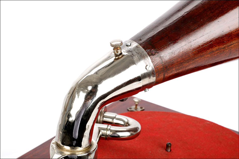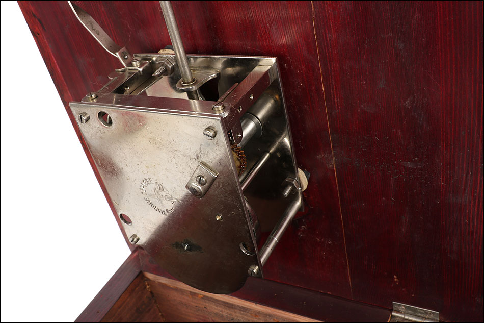 El motor que se esconde en la caja es suizo y de alta calidad; ha sido limpiado y revisado para garantizar un excelente funcionamiento. La magnífica trompeta de forma cónica está unida al reproductor mediante un brazo de metal plateado en perfecto estado de conservación. De este mismo material es el codo que sujeta ambos elementos a la caja. El reproductor es un modelo Saturn en excelentes condiciones. Por su parte, la elegante trompeta está fabricada en madera maciza y lleva un bello barnizado a muñequilla que le aporta un hermoso brillo, cálido y satinado.