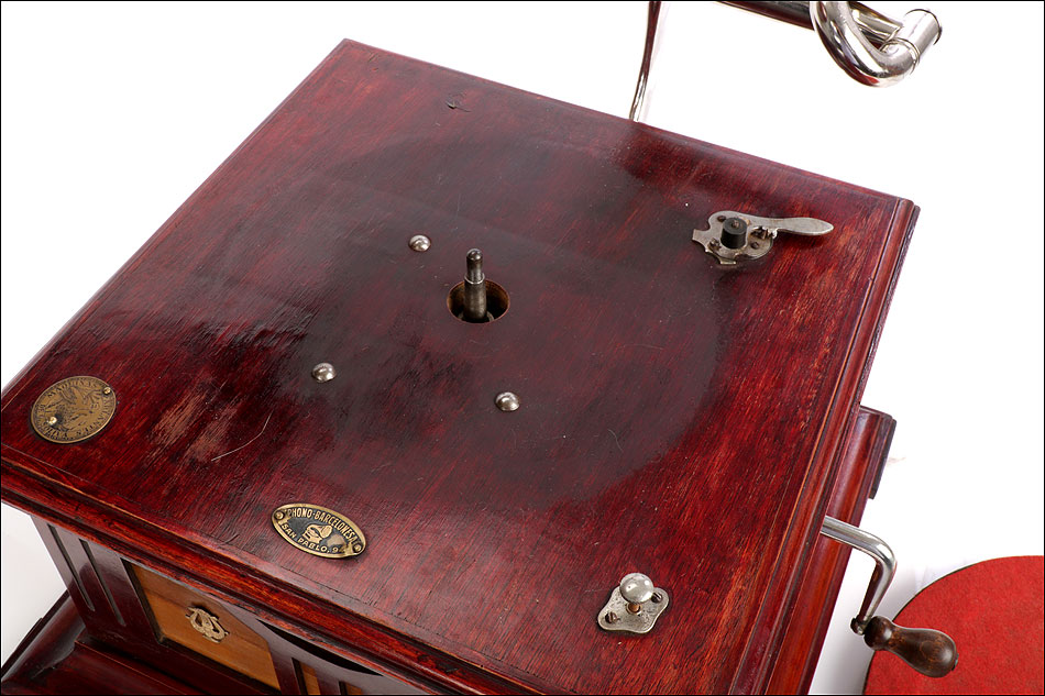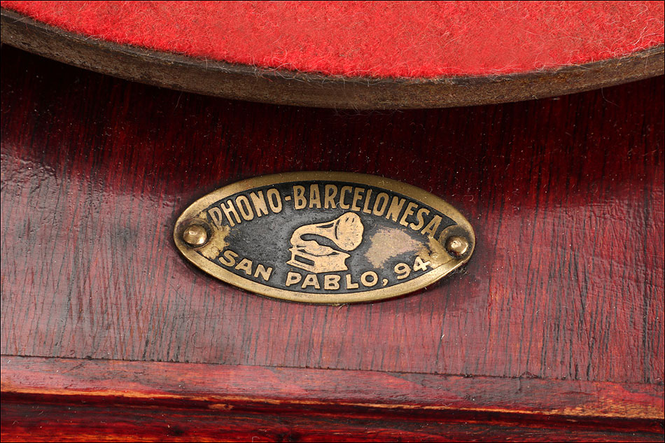 Raro gramófono de trompeta antiguo fabricado en Barcelona en 1920, en excelente estado de conservación y funcionando muy bien. Este aparato fue fabricado por Phono-Barcelonesa, una empresa fabricante de gramófonos con sede en la calle San Pablo, 94 de Barcelona. La firma comercializaba gramófonos de otras marcas e incluso llegó a fabricar sus propios modelos. Uno de sus gramófonos más peculiares fue el conocido como “de dos pisos”, cuya caja tenía en la parte inferior un amplio cajón para agujas y discos. El gramófono que vemos en las imágenes es un diseño muy raro y especial que conserva todas sus piezas y componentes originales: la única pieza que se ha sustituido es el elemento de metal que une la trompeta al codo.
