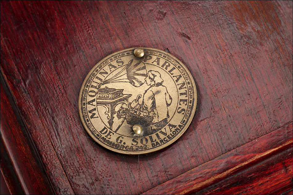 La caja muestra un hermoso diseño de estilo art déco, con paneles de madera clara en los laterales y estructura con acabado en caoba oscura. La base es moldurada y los laterales llevan celosías geométricas que dejan ver los paneles más claros, creando un conjunto armonioso y elegante. La cara frontal está decorada con dos delicados apliques de latón con forma de lira. En la parte superior lleva dos placas de metal originales del gramófono: en una podemos ver el nombre y la dirección de la fábrica, mientras que la otra corresponde al distribuidor (MÁQUINAS PARLANTES DE G. SOLIVA).