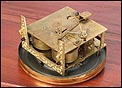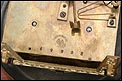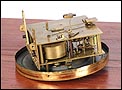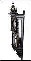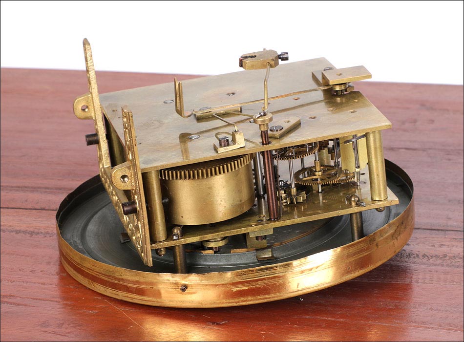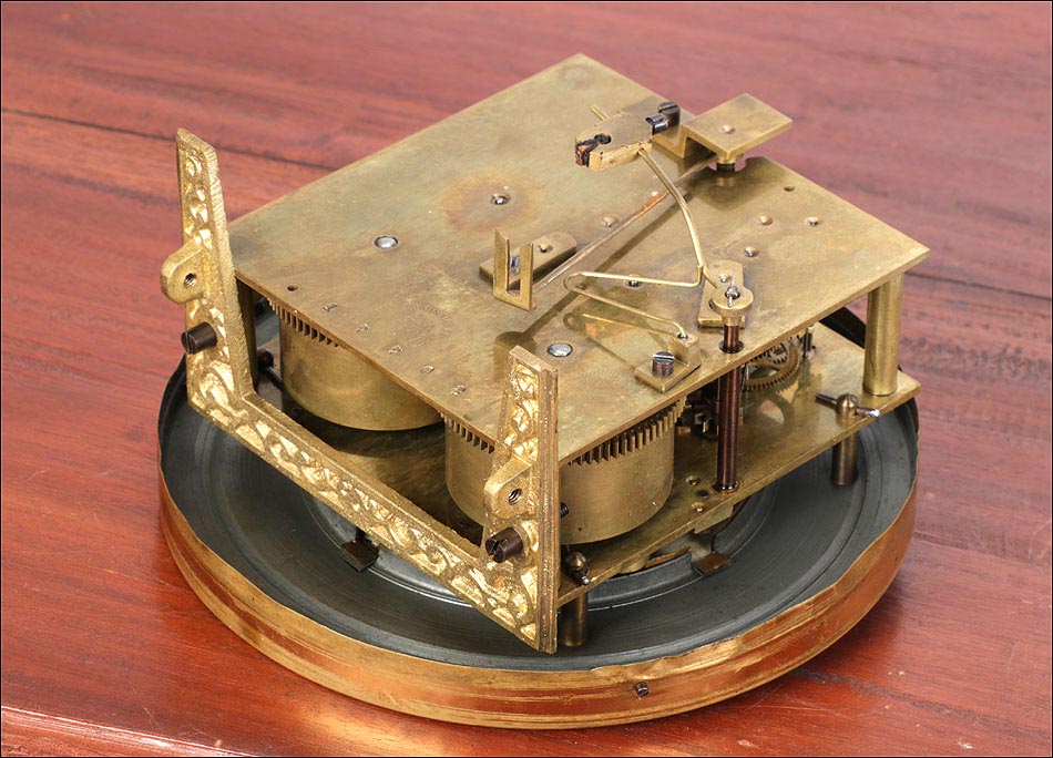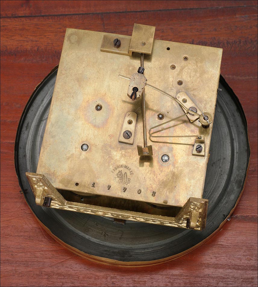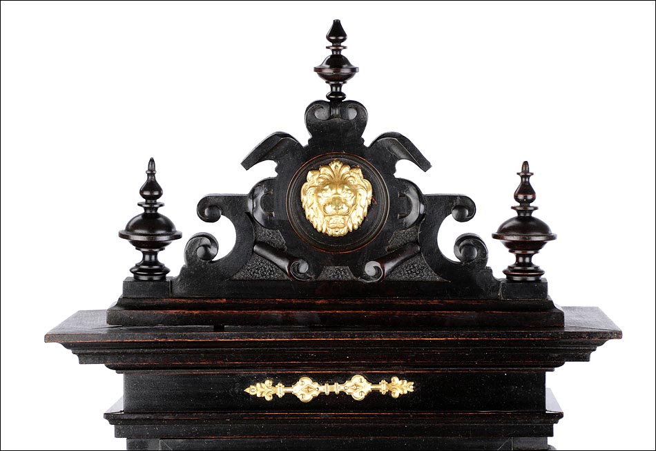 La caja de madera está decorada con volutas simétricas talladas a mano, molduras y piezas torneadas. Los apliques de bronce dorado también están dispuestos de forma simétrica. En la parte superior hay una bella cabeza de león coronando el conjunto. El acabado ebonizado de la madera aparece ligeramente desgastado en las aristas y molduras, creando un efecto muy atractivo y original. La maquinaria del reloj lleva grabado un sello en el que aparece una ardilla, flanqueada por las iniciales H y B.