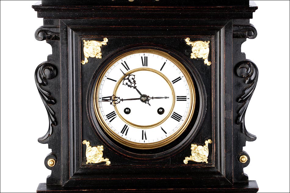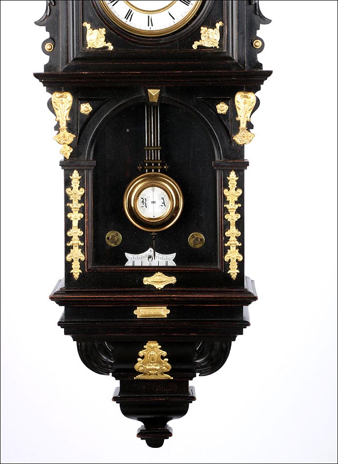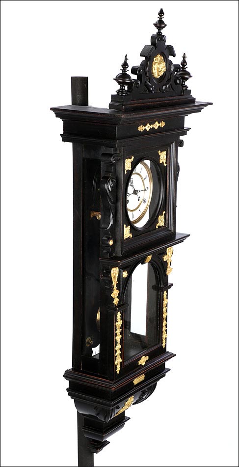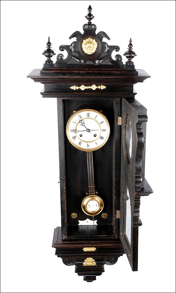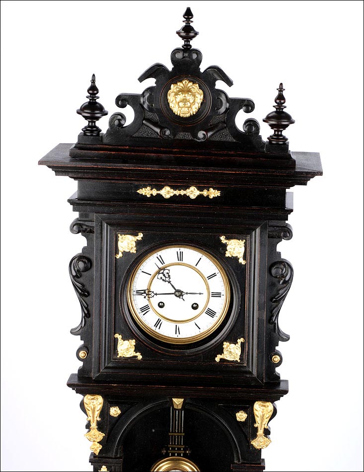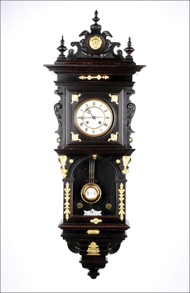 Antiguo Reloj de Pared en Madera Ebonizada y Apliques Dorados. Alemania, Circa 1900 |