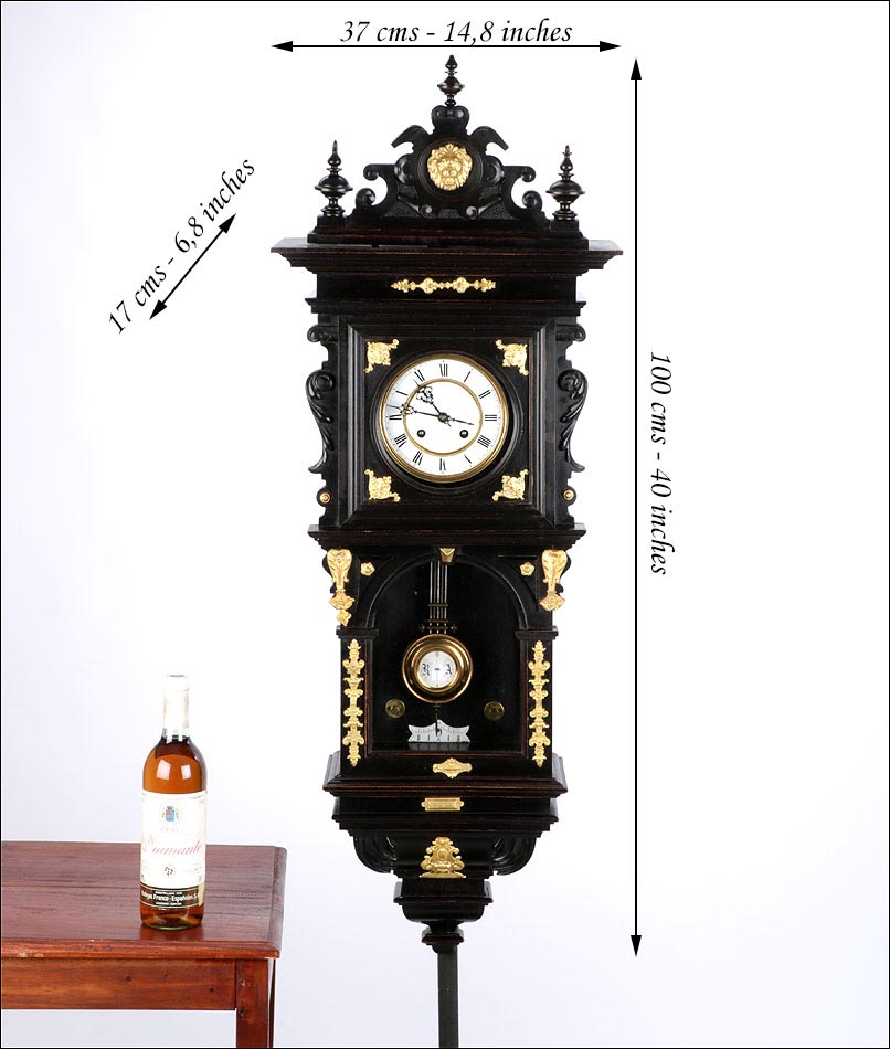 Este antiguo reloj de pared en madera ebonizada está destinado a brillar en una casa aristocrática y señorial.