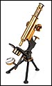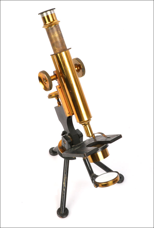 El microscopio lleva base de hierro fundido esmaltada en color negro, formada por tres finas patas y un soporte circular. Sobre la base, otra pieza de hierro esmaltado soporta la pletina para muestras y el espejo bifacial (plano/cóncavo), original de época y en excelente estado. La torre de latón lleva un objetivo y un ocular en muy buenas condiciones, y conserva la cremallera en perfecto estado de funcionamiento. Los tornillos de ajuste y las piezas móviles son también de latón; el metal está protegido por la laca transparente original de época, muy bien conservada, que aporta a la superficie dorada una preciosa pátina. En la base circular que se apoya sobre las patas podemos ver grabado el nombre del fabricante, su dirección y el número de serie del microscopio: 4428.