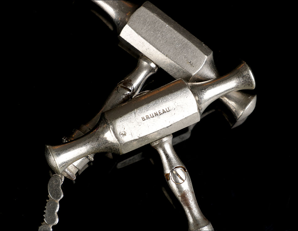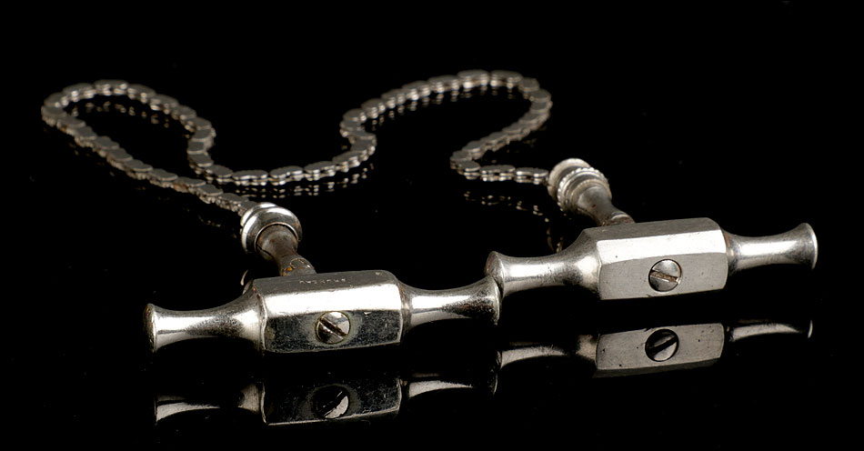 Esta antigua sierra de cadena para amputaciones Bruneau es una pieza de colección, destinada a brillar en un museo de la medicina o en la vitrina de un experto en antigüedades médicas.