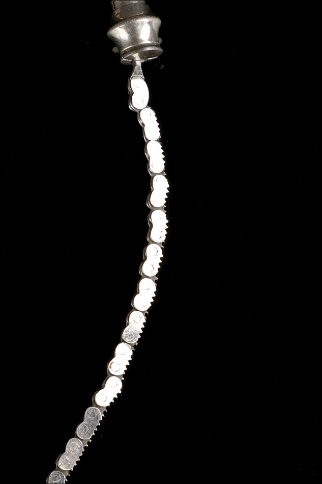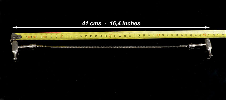 Fascinante sierra de cadena antigua para amputaciones, fabricada en acero y en magnífico estado de conservación. Se trata de una herramienta quirúrgica fabricada circa 1850, con más de siglo y medio de antigüedad y en muy buenas condiciones. La sierra está compuesta por dos empuñaduras colocadas en los extremos de una sierra de cadena flexible. Las empuñaduras son gemelas y tienen forma de martillo, diseñadas para mejorar el agarre y poder ejercer movimientos de vaivén con los que hacer funcionar la sierra. Esta está formada por una serie de eslabones dentados que conforman una tira flexible, dura y resistente. En total, la sierra tiene una longitud de 41 cm. Se empleaba para serrar los huesos en operaciones de amputación. Una de las empuñaduras lleva el nombre de la marca BRUNEAU claramente grabado en el metal. El acero está en excelente estado y solo muestra algunas ligeras trazas de óxido en una de las empuñaduras, apenas perceptibles.