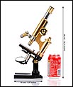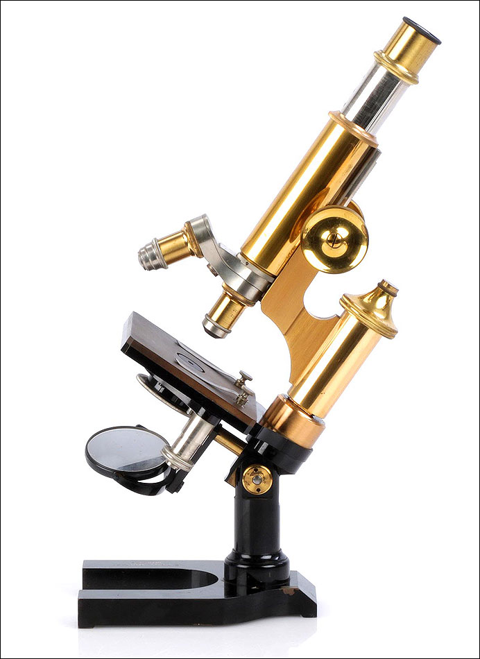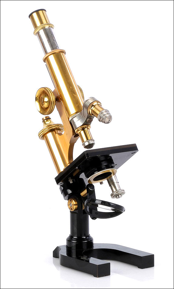 Impresionante microscopio antiguo Enrst Leitz Wetzlar fabricado en Alemania en 1908, completo y con su estuche original de época. Se trata de un artículo de la máxima calidad, garantizado por la prestigiosa marca alemana de material óptico. El microscopio destaca por su belleza y equilibrio formal, pero también por su excelente estado de conservación y funcionamiento. El estuche es de madera de caoba rubia maciza y lleva grabado el número de serie 105422, coincidente con el del microscopio. Está en buen estado y conserva la cerradura y la llave originales, que funcionan. El microscopio tiene base de hierro esmaltado en negro con forma de herradura, sobre la que se alza el aparato. El mecanismo está formado por piezas y componentes de latón y metal plateado, todos ellos en excelentes condiciones. El latón conserva el barniz transparente original de época.