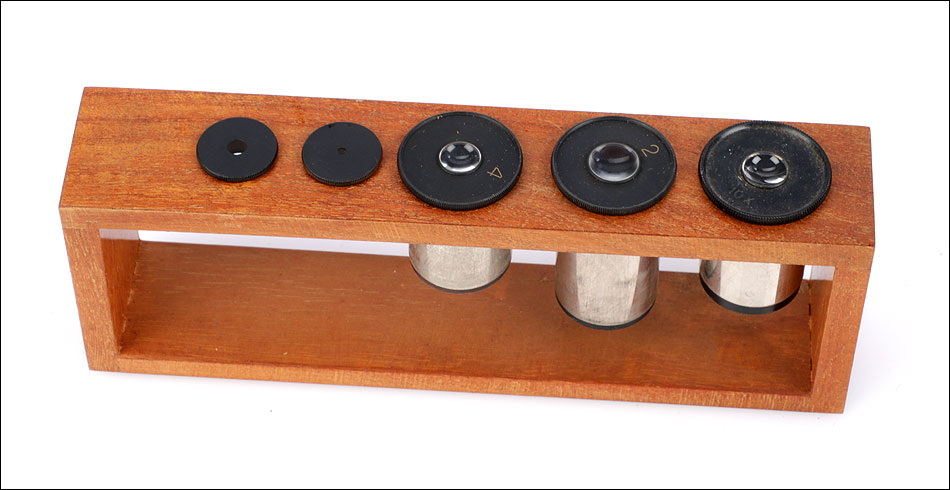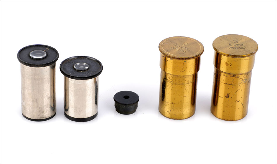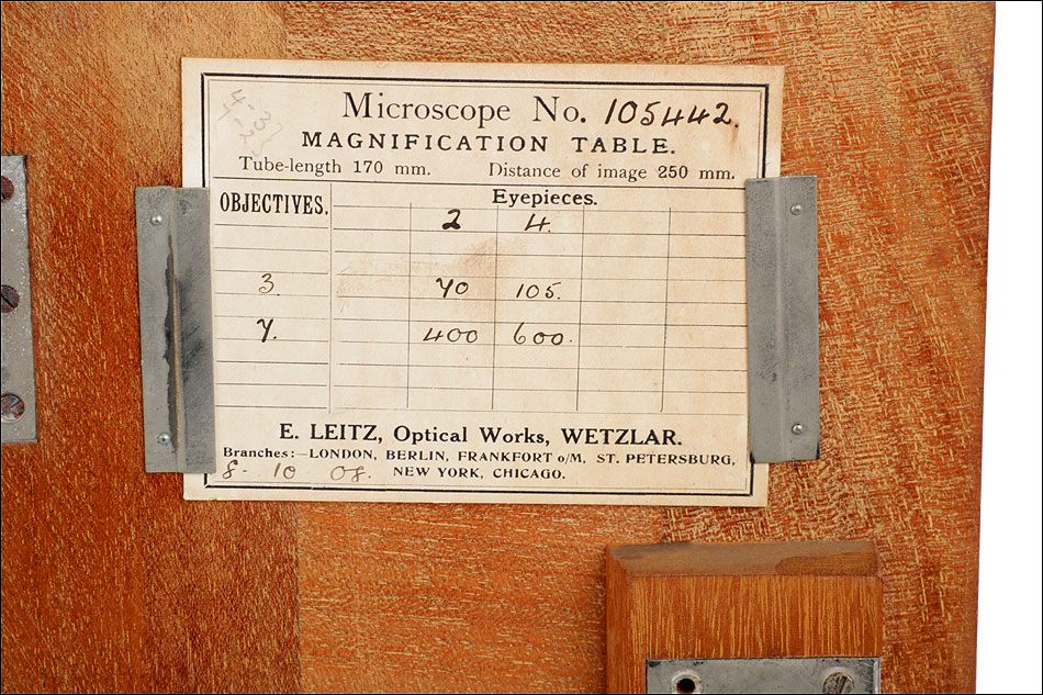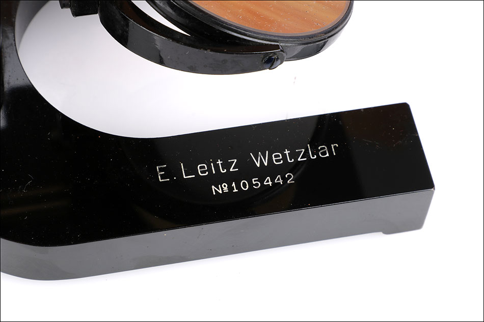 El funcionamiento de los distintos componentes es excelente: se mueven de forma fluida y precisa, haciendo del manejo del microscopio todo un placer. La óptica está en buen estado: el microscopio lleva revólver de dos lentes, con dos objetivos Leitz Nº 3 y Nº 7 y sus fundas de latón. También cuenta con dos oculares de x2 y x4 y un ocular extra de x10. En la base del microscopio podemos ver la inscripción E. LEITZ WETZLAR Nº 105422, grabada en letras blancas sobre la laca negra. Las fundas de los objetivos llevan también el nombre del fabricante en las tapas. En el interior de la puerta del estuche hay una etiqueta escrita a mano con el mismo número de serie, la fecha de fabricación y la documentación de los accesorios del microscopio.