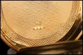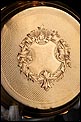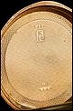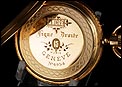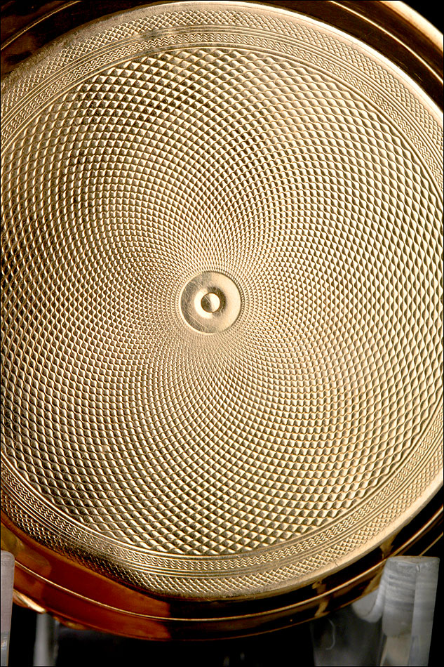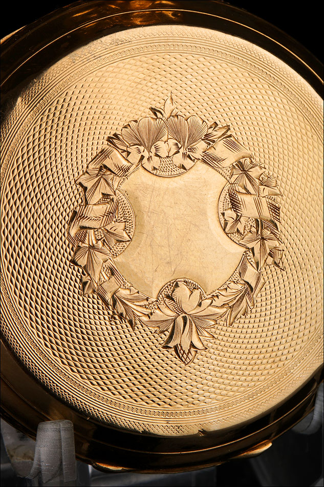 Bajo la tapa delantera descansa la bella esfera del reloj, protegida por el cristal original en buenas condiciones. Lleva fondo de plata profusamente decorado con grabados y relieves, y con apliques de oro entre los que destaca el motivo central: dos aves bajo un jarrón con frutas. Los números son romanos y de color negro, mientras que las agujas también son negras y de diseño sencillo y recto. Por la cara posterior, la tapa trasera de oro lleva grabados en su interior los mismos sellos que la delantera; bajo ella descansa la tapa guardapolvo, bellamente decorada con inscripciones grabadas a mano en distintos tipos de letra relacionadas con el mecanismo del reloj.