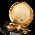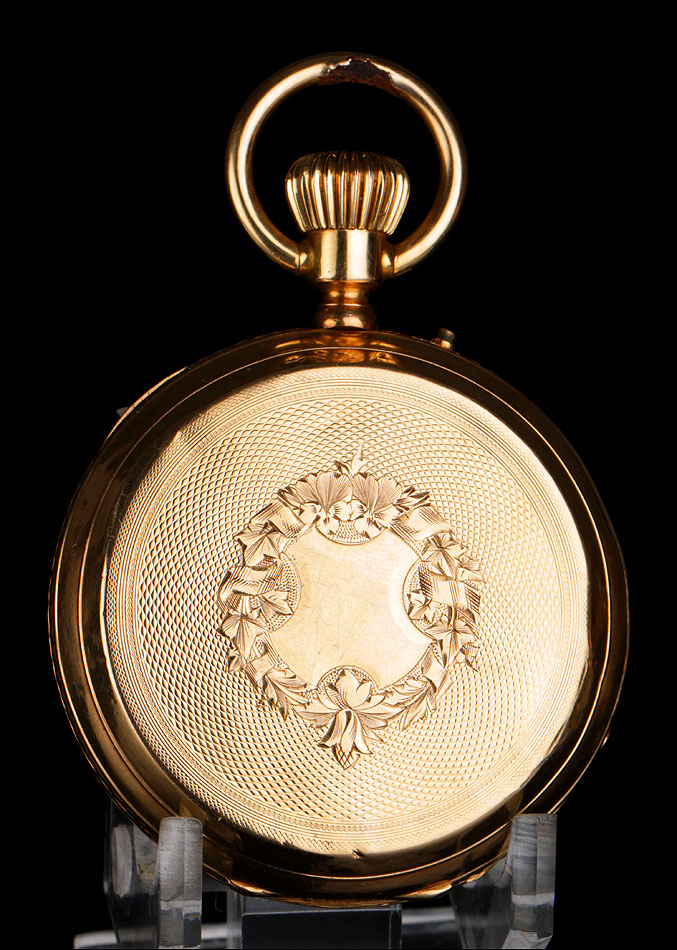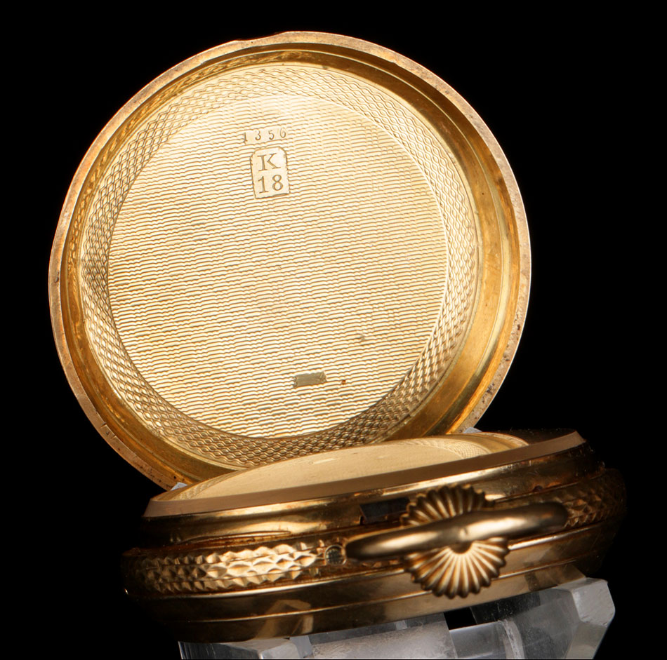 Antiguo reloj de bolsillo en oro macizo de 18K, fabricado en Suiza a finales del siglo XIX (circa 1890) y en muy buen estado de conservación. El reloj muestra un diseño clásico y elegante, con caja grabada en guilloché de grano de arena y escudo frontal sin grabar. El mecanismo suizo ha sido limpiado y revisado para garantizar su buen rendimiento, por lo que actualmente el reloj funciona muy bien. El escudo de la tapa delantera está rodeado por una guirnalda de hojas grabada a mano, realizada con detalle y precisión y de gran belleza. Si la abrimos, en su interior podemos ver el sello 18K (los quilates del oro) y el número de serie de la caja en la parte superior: 1356. En la base de la tapa podemos ver la cifra 34.