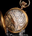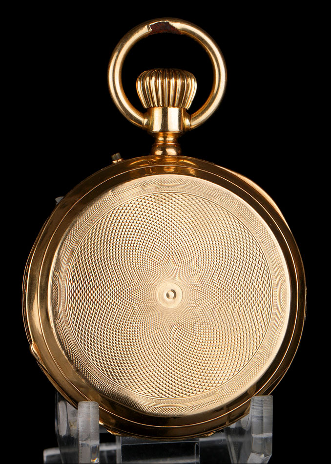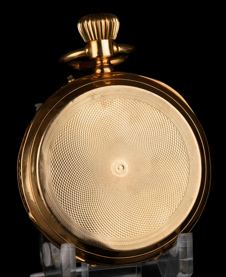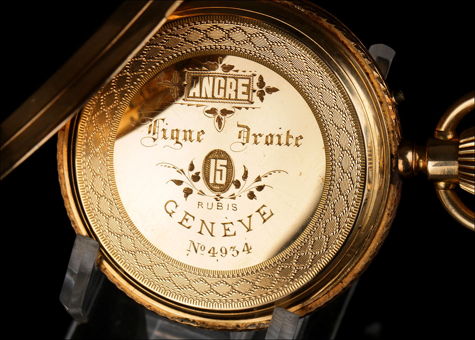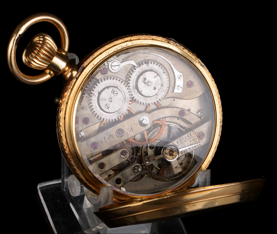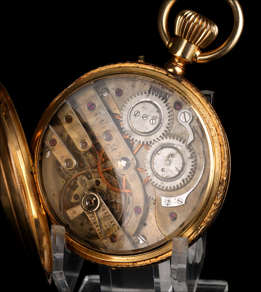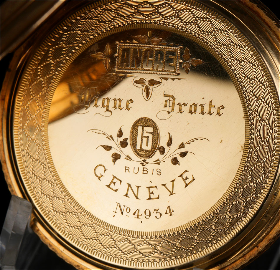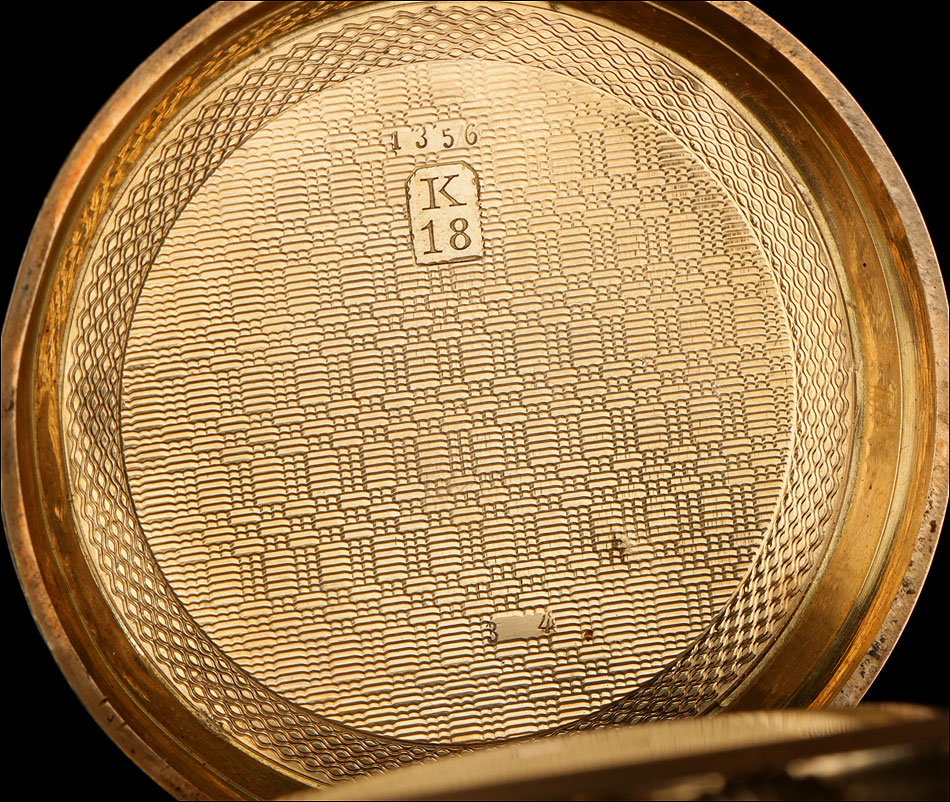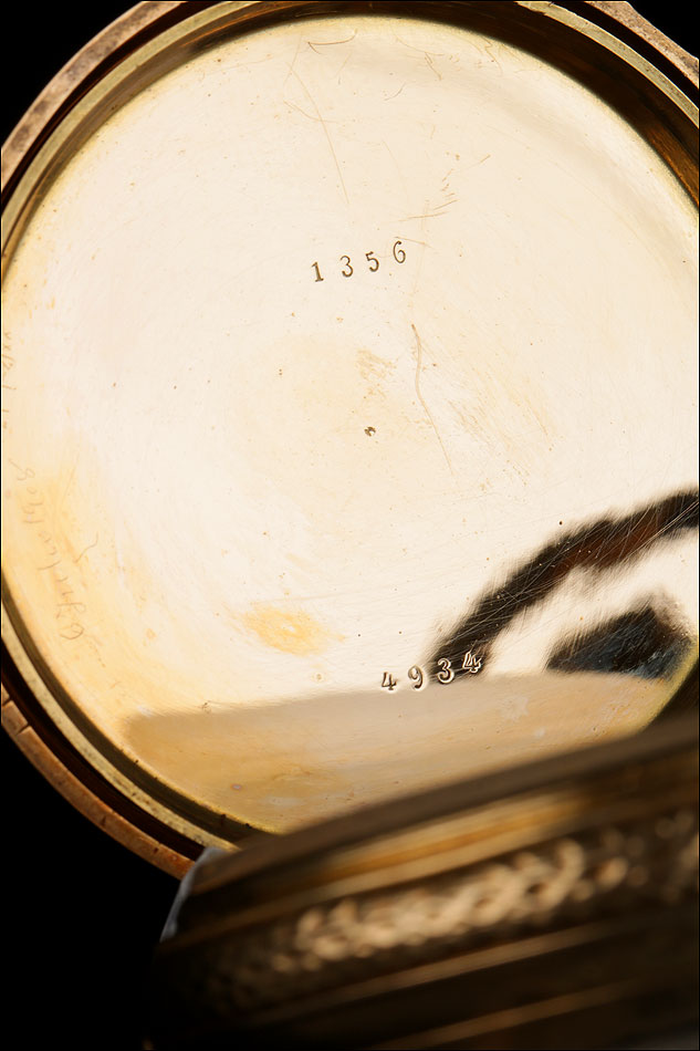 Entre estas inscripciones encontramos el número 4934, que completa la cifra 34 grabada en la cara interna de la tapa delantera. Se trata del número de serie del mecanismo del reloj. Si abrimos la tapa guardapolvo, en su interior veremos de nuevo la cifra 4934 bajo las iniciales AE; también aparece el número de la caja antes citado, 1356. Esta tapa protege el mecanismo, cubierto a su vez por una tercera tapa de cristal. El mecanismo lleva el número 4934 grabado de nuevo en una de sus piezas de metal.