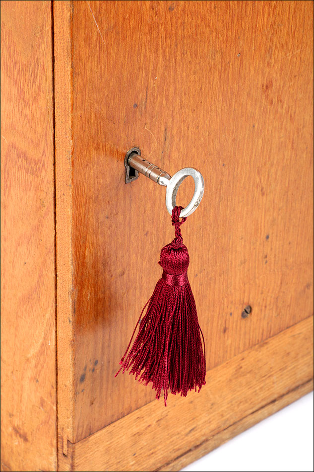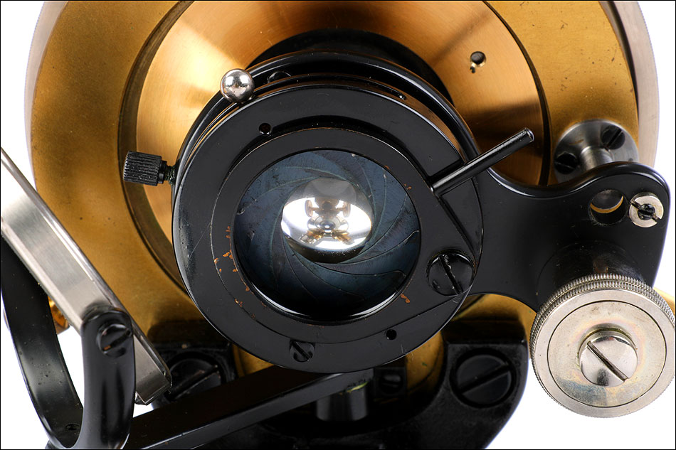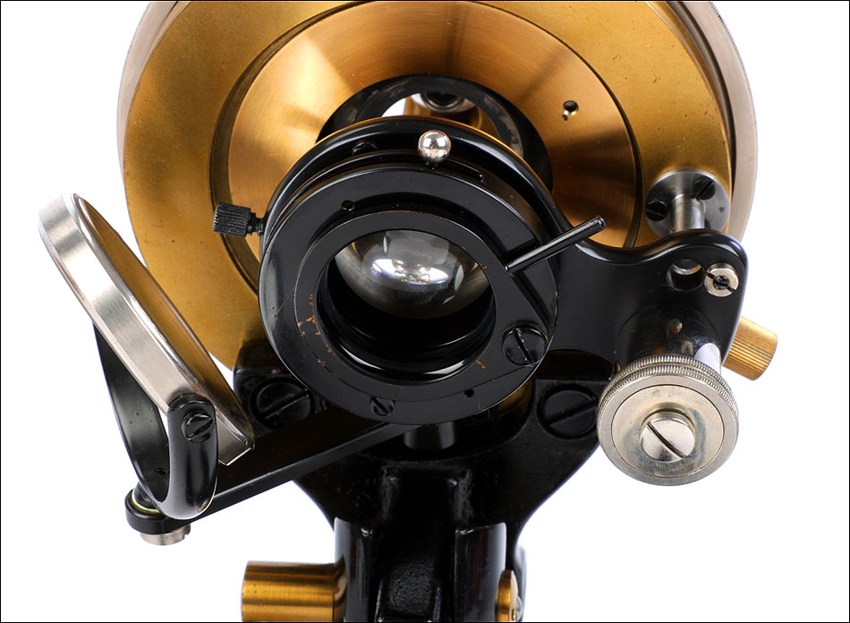 El microscopio lleva base de herradura de hierro fundido, esmaltada en negro brillante. El esmalte está magníficamente conservado y se muestra liso y brillante, creando un precioso contraste con las piezas de metal dorado y plateado. Los componentes móviles de latón están protegidos por el barniz original transparente, que además de aportar al metal una hermosa pátina ha servido para protegerlo de los estragos del paso del tiempo. En la base podemos ver la firma del fabricante, W. REICHERT - WIEN, y el número de serie Nº 70013. Este número aparece también grabado en el estuche de madera y en la hoja manuscrita con información sobre el aparato. El estuche de caoba maciza y color dorado está muy bien conservado; la cerradura y la llave son las originales y funcionan.