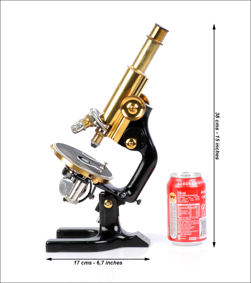 Impresionante y antiguo microscopio Reichert fabricado en Alemania en 1927, completo y en su estuche original. Se trata del mismo modelo que empleó Santiago Ramón y Cajal en sus investigaciones: por su precisión y calidad, los microscopios Reichert eran los preferidos por el científico y Premio Nobel español. El aparato que vemos en las imágenes muestra un estado de conservación realmente bueno, conservando toda su belleza y funcionalidad. Lleva revólver de tres lentes y espejo de doble cara, ambos en perfecto estado; ambos permiten utilizar el microscopio para visualizar muestras, exactamente igual que hace alrededor de 90 años.