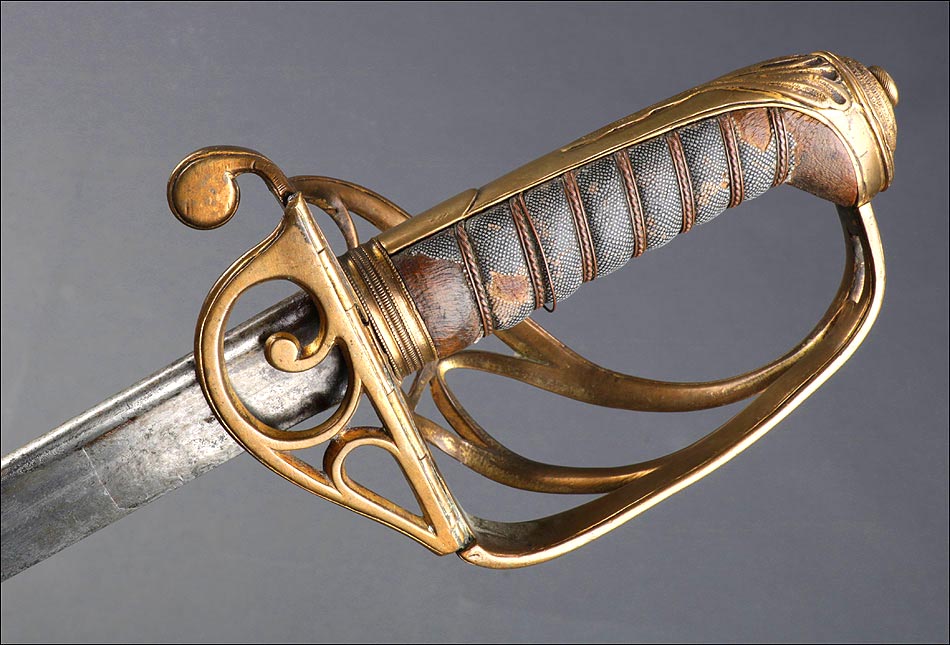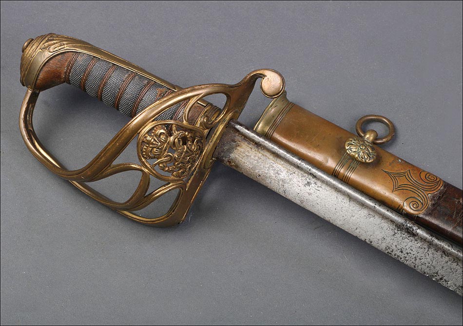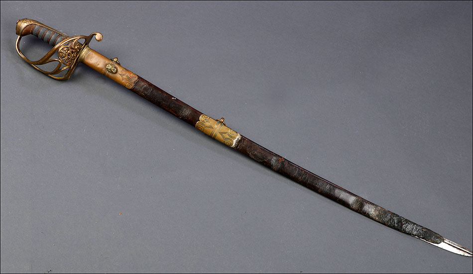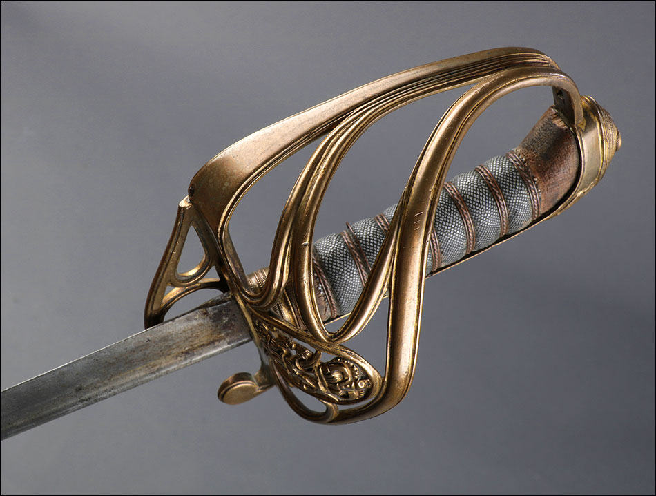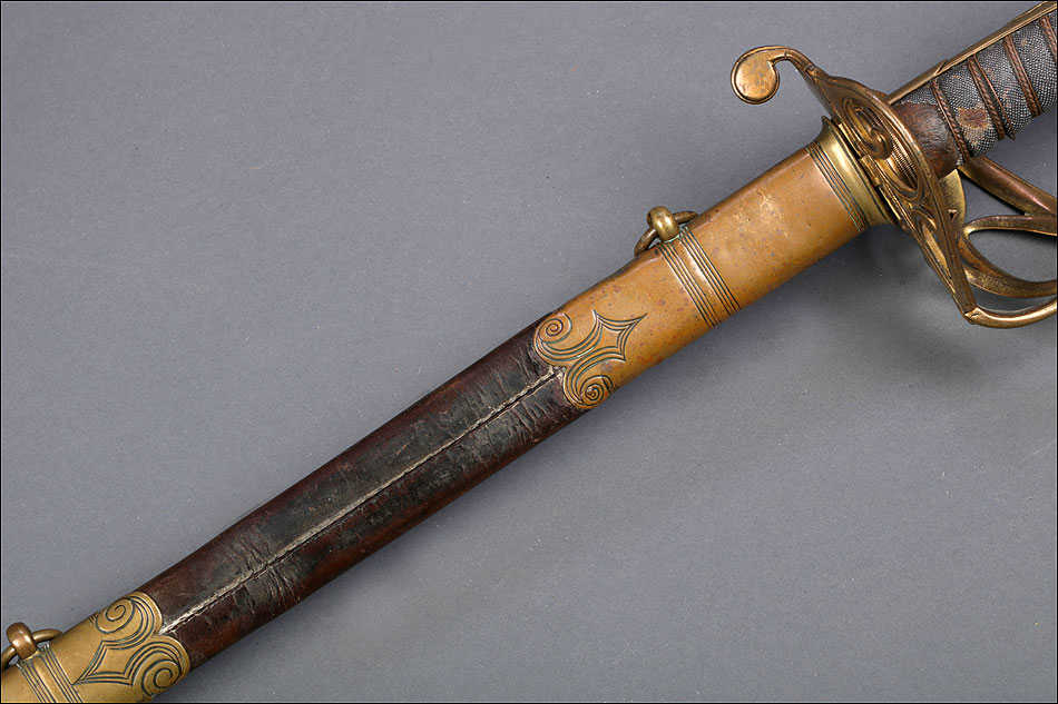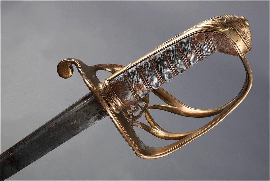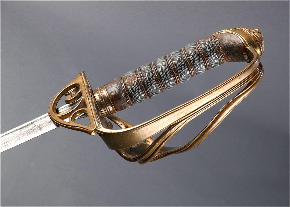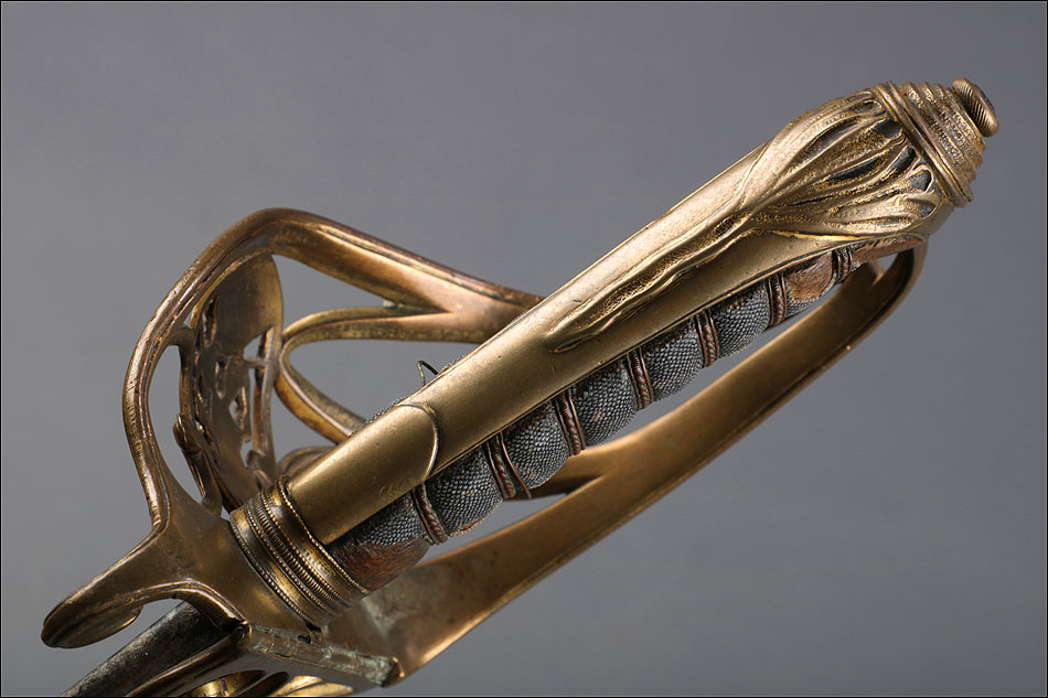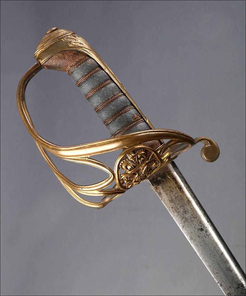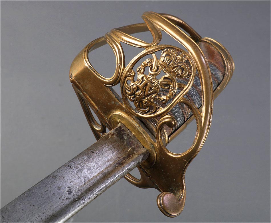 Preciosa y antigua espada británica de oficial de infantería, fabricada circa 1825 y en buen estado. La espada es el modelo 1822 lleva en la empuñadura el escudo del rey Jorge IV, monarca inglés que gobernó de 1820 a 1830. El escudo parece grabado en relieve en el guardamano. La espada se presenta con su vaina, también en buenas condiciones si bien le falta la puntera. La empuñadura es de gran belleza: está fabricada en metal dorado y muestra un atractivo y sinuoso diseño, con varios gavilanes curvados. Una de las partes de la cruz es plegable. El puño conserva la piel original y el torzal que la sujeta. La hoja de acero se encuentra también en buen estado y muestra la atractiva pátina creada por el paso del tiempo. La vaina de cuero negro lleva boquilla y pieza central de latón grabado a mano, decorados con sencillos y delicados detalles geométricos. La pieza central aún conserva la anilla donde se ataba el correaje para el transporte de la espada.