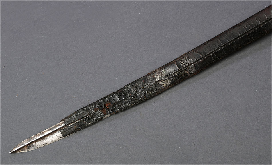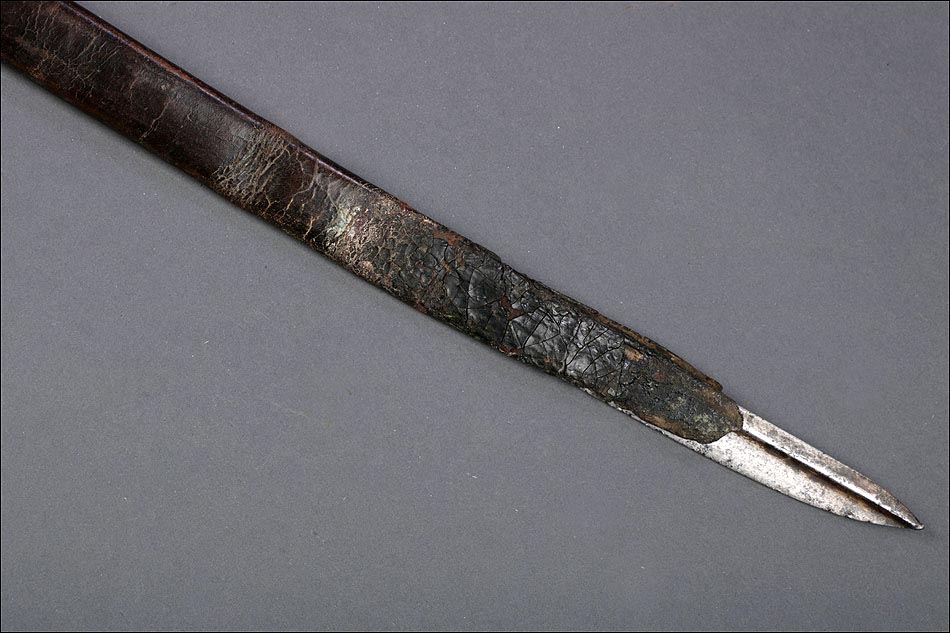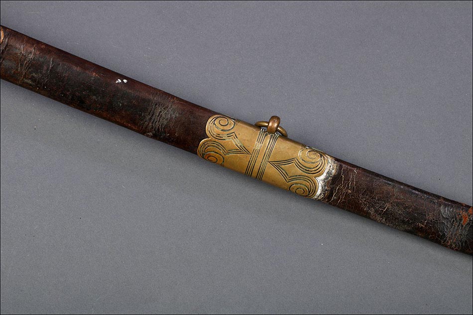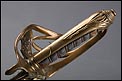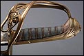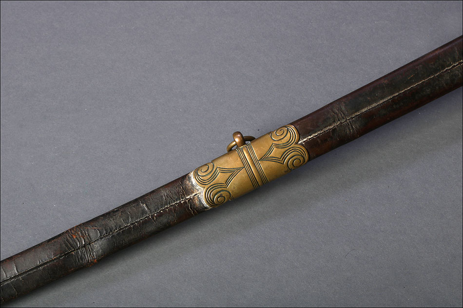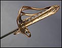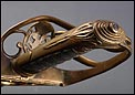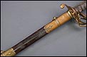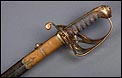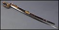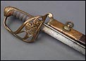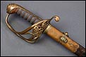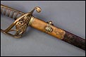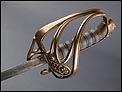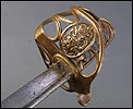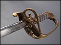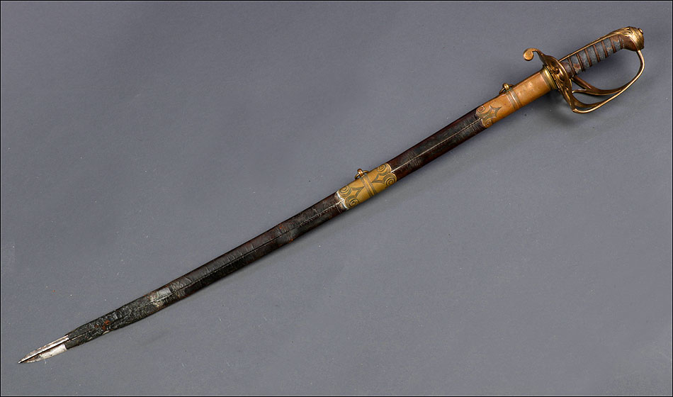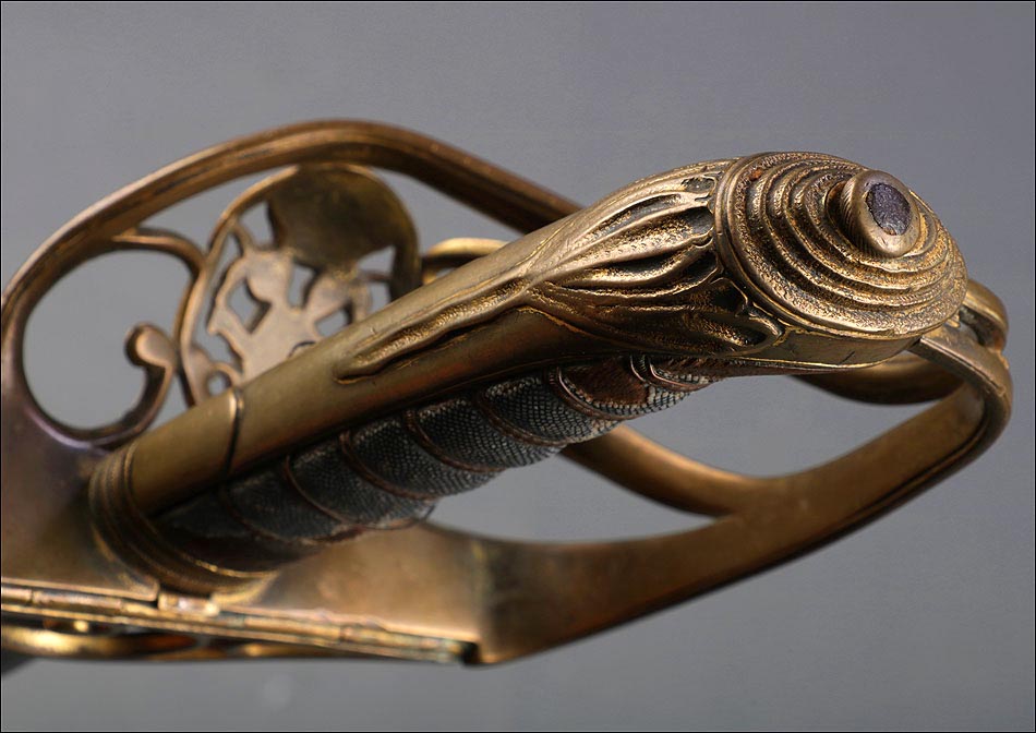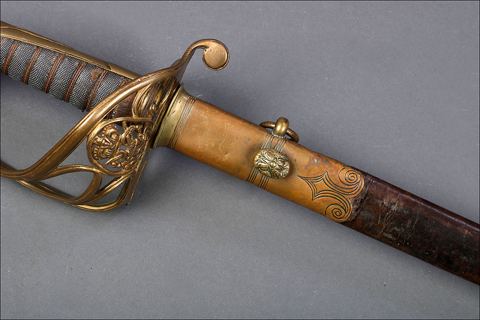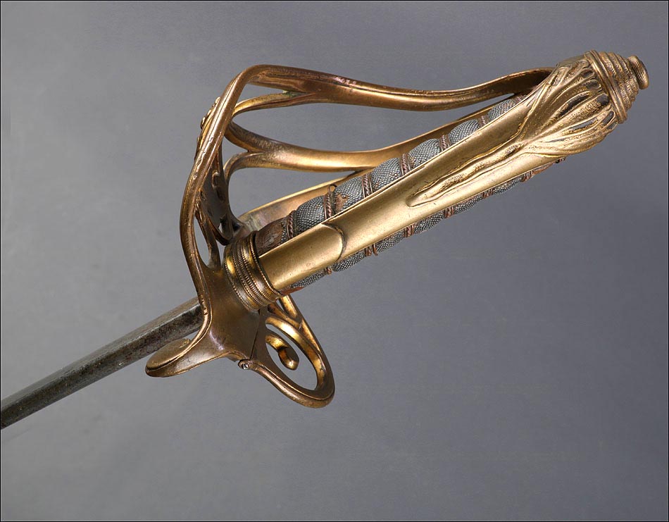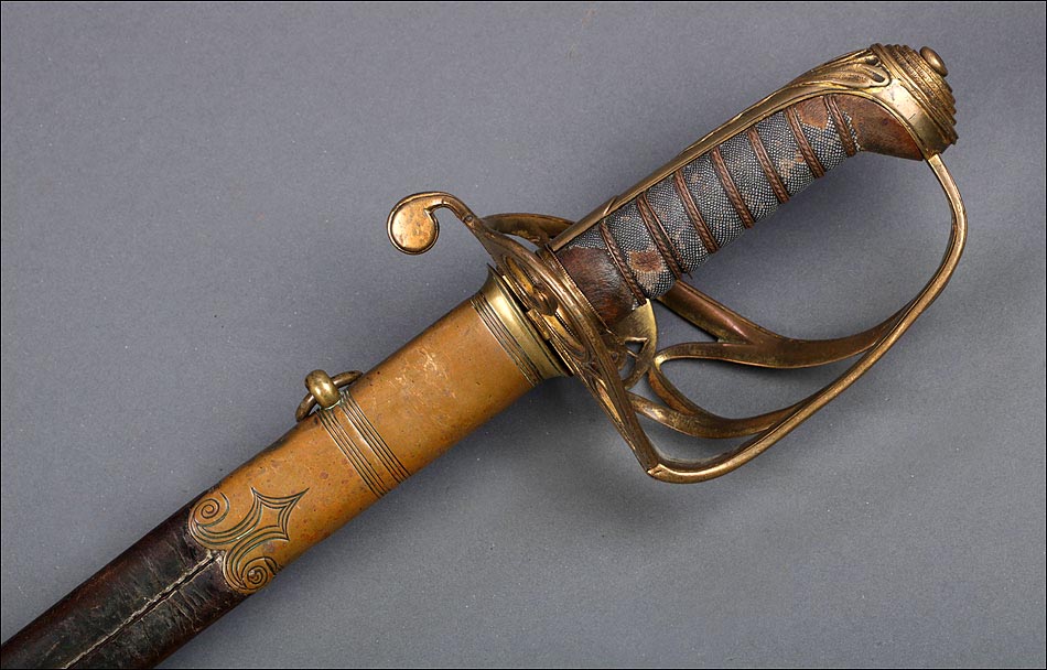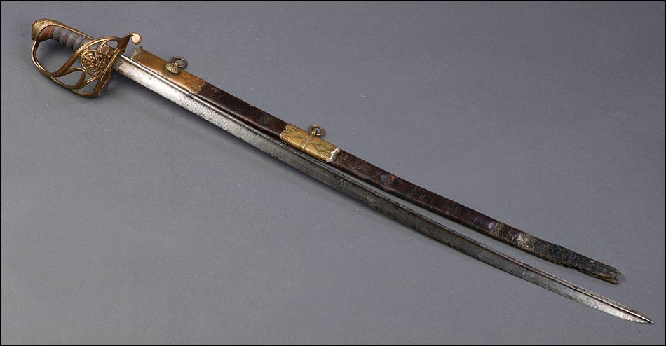 Preciosa y antigua espada británica de oficial de infantería, fabricada circa 1825 y en buen estado. La espada es el modelo 1822 lleva en la empuñadura el escudo del rey Jorge IV, monarca inglés que gobernó de 1820 a 1830. El escudo parece grabado en relieve en el guardamano. La espada se presenta con su vaina, también en buenas condiciones si bien le falta la puntera. La empuñadura es de gran belleza: está fabricada en metal dorado y muestra un atractivo y sinuoso diseño, con varios gavilanes curvados. Una de las partes de la cruz es plegable. El puño conserva la piel original y el torzal que la sujeta. La hoja de acero se encuentra también en buen estado y muestra la atractiva pátina creada por el paso del tiempo. La vaina de cuero negro lleva boquilla y pieza central de latón grabado a mano, decorados con sencillos y delicados detalles geométricos. La pieza central aún conserva la anilla donde se ataba el correaje para el transporte de la espada.