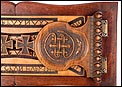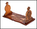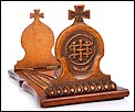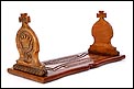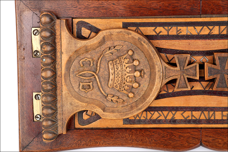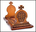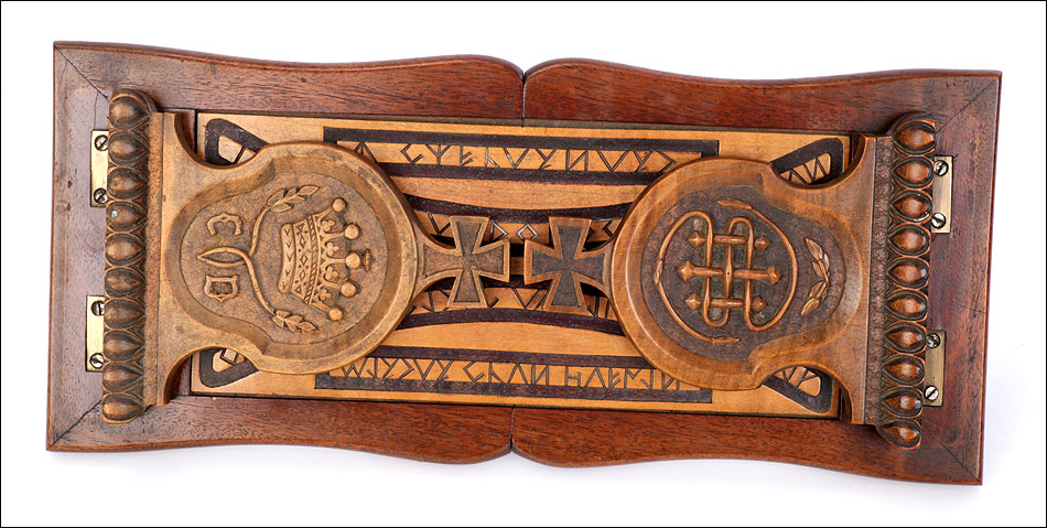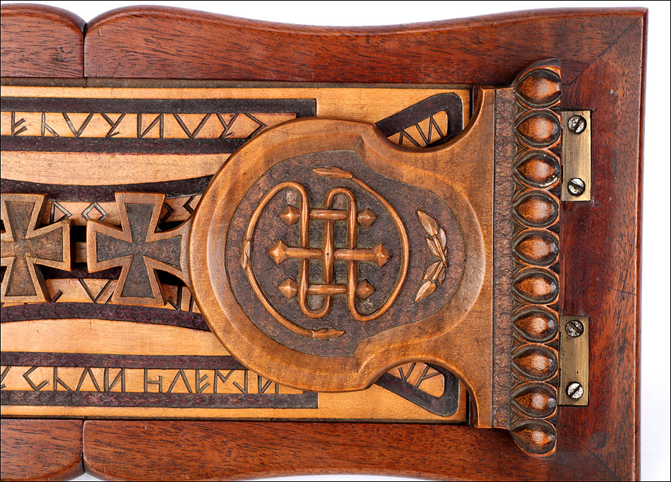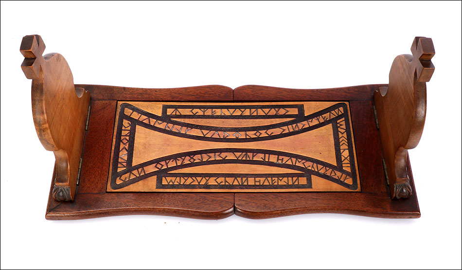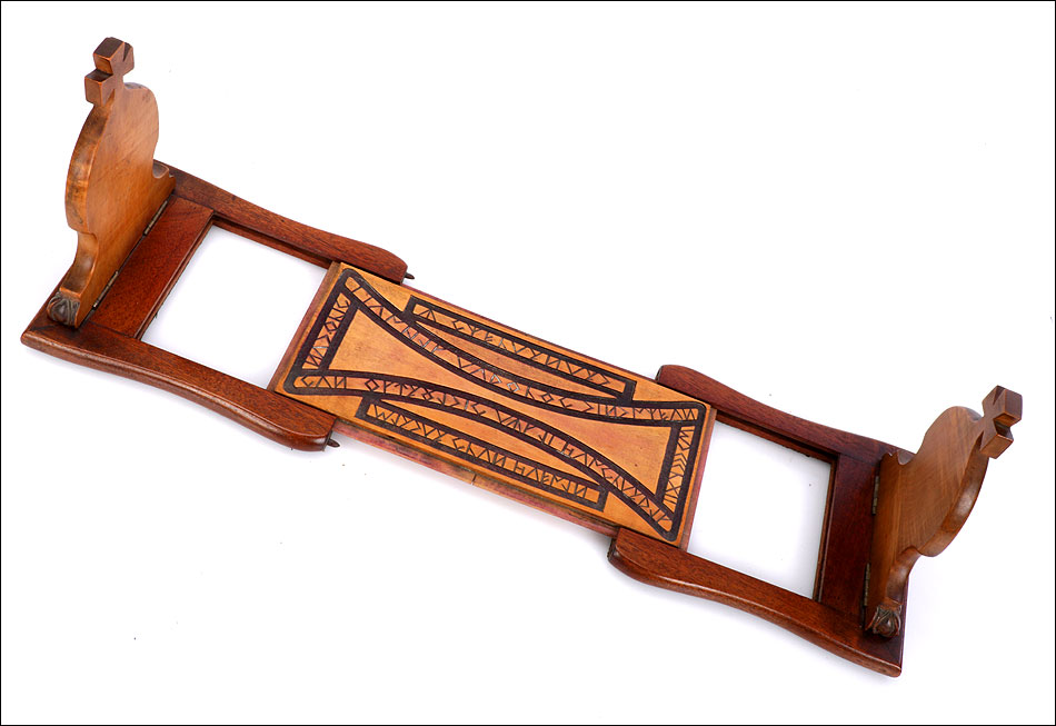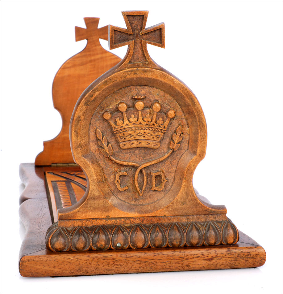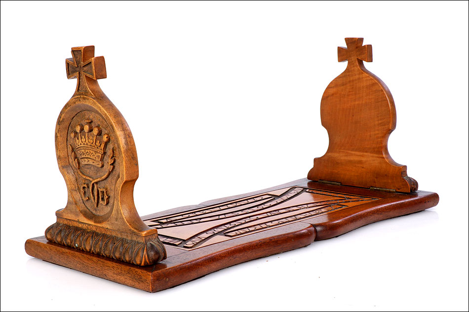 Elegante y antiguo sujeta libros irlandés extensible tallado en madera maciza, fabricado a mediados del siglo XX y en magnífico estado de conservación. Este atractivo artículo, tan decorativo como funcional, puede aumentar su longitud desde 38 a 56 cm para dar cabida a colecciones de libros más o menos extensas. Está manufacturado con dos tipos de madera maciza, una más clara y otra oscura. El sujeta libros muestra un diseño de inspiración medieval, decorado con motivos tallados a mano que reproducen simbología celta. Los dos laterales están coronados por cruces; uno de ellos lleva una corona ducal tallada acompañada de las iniciales C.B. En la base, la pieza rectangular central de madera clara que conecta ambos laterales lleva una serie de inscripciones en gaélico, también talladas a mano y de elegante simplicidad. El sujeta libros está protegido con un barnizado a muñequilla muy atractivo, perfectamente restaurado y que aumenta la belleza de la combinación de maderas.