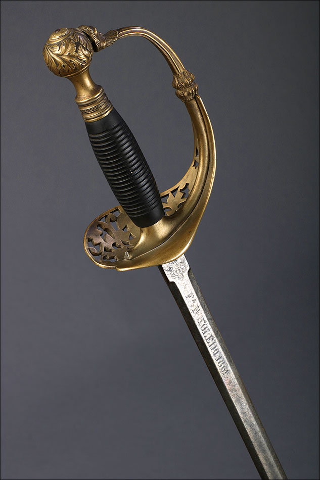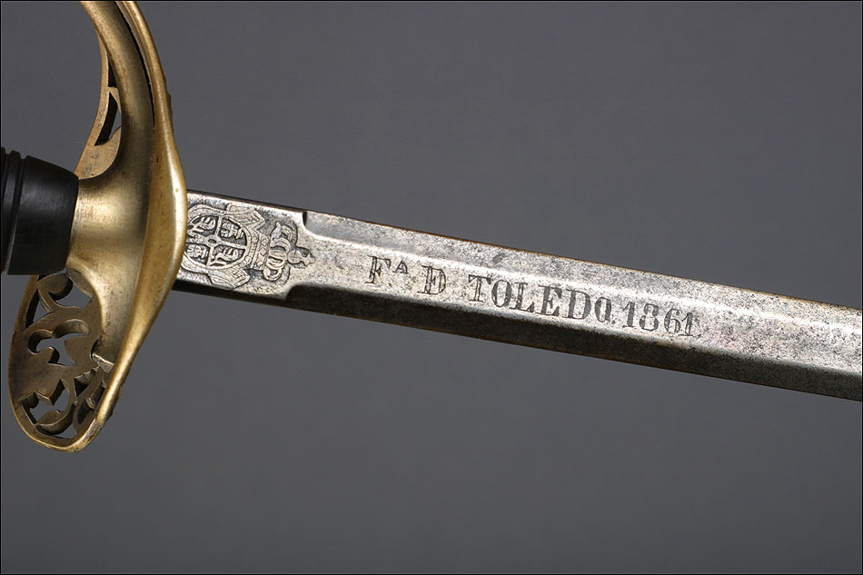 Magnífica espada de ceñir antigua para oficial de ingenieros modelo 1860, fabricada en Toledo (España) en 1861. Se trata de un arma ligera, empleada normalmente como complemento del uniforme de gala. Este modelo lleva empuñadura de latón: se trata de un detalle bastante raro, ya que lo más probable es que en el modelo oficial la guarda fuera de alpaca. En la empuñadura falta el galluelo, pero a pesar de ello su diseño sigue siendo muy atractivo y equilibrado: visualmente apenas se echa en falta. La cazoleta lleva grabado el escudo del cuerpo de ingenieros, una torre coronada. En la hoja podemos ver grabado el escudo de Toledo y la inscripción FA. DE TOLEDO, que indica el lugar donde fue forjada la espada. Esta pieza va acompañada de una vaina de acero que no es la suya original, pero que encaja bien con la hoja y le sirve como complemento decorativo y protector.