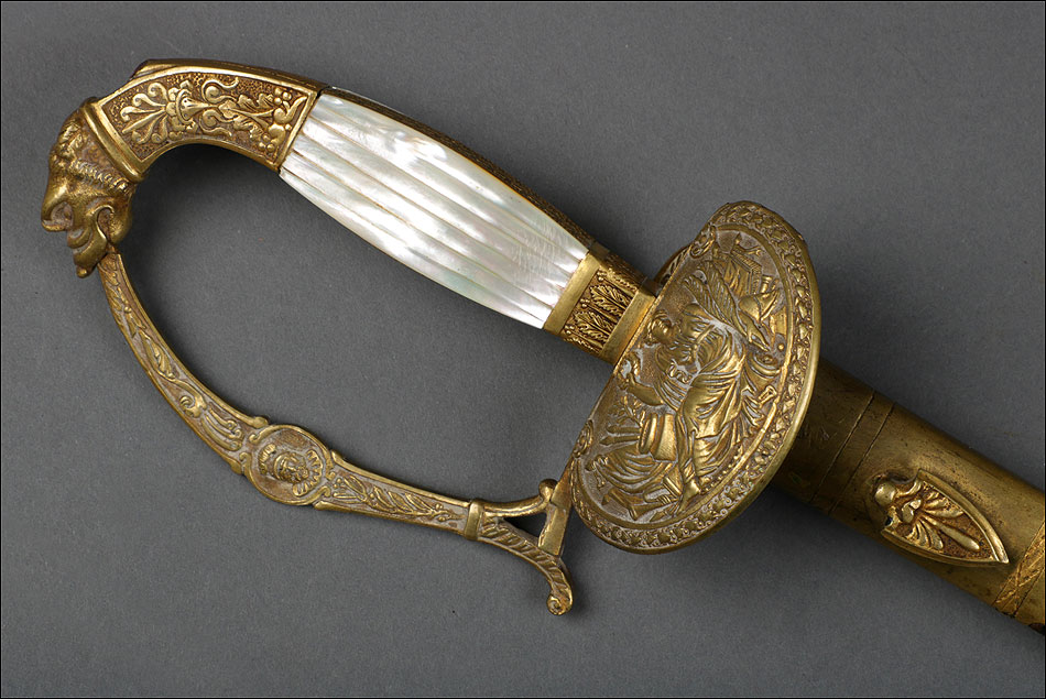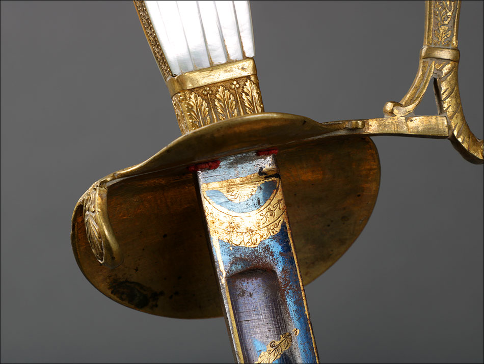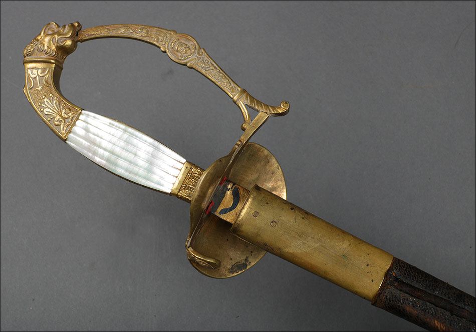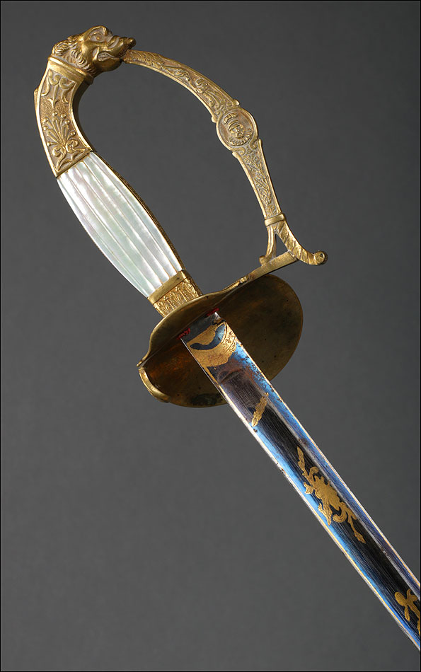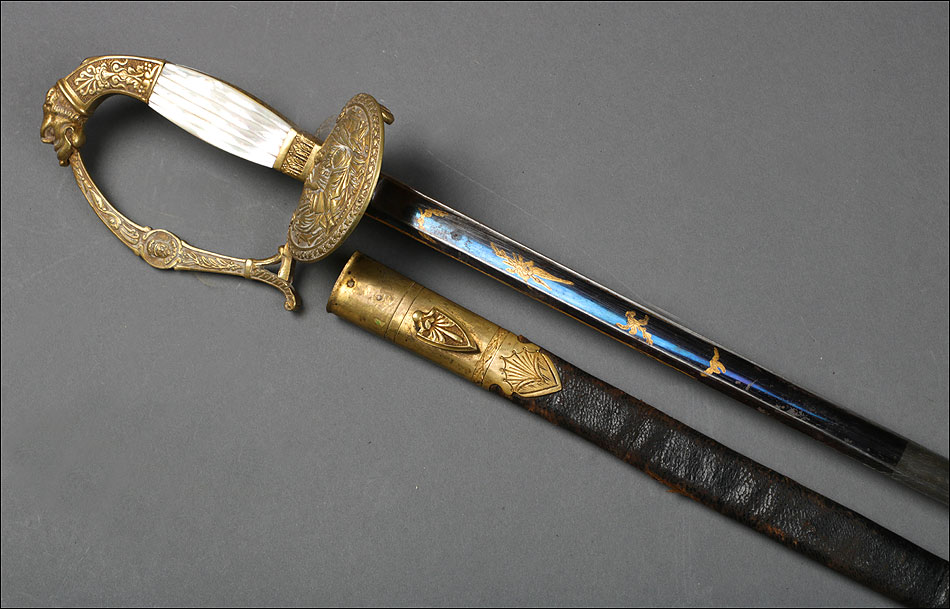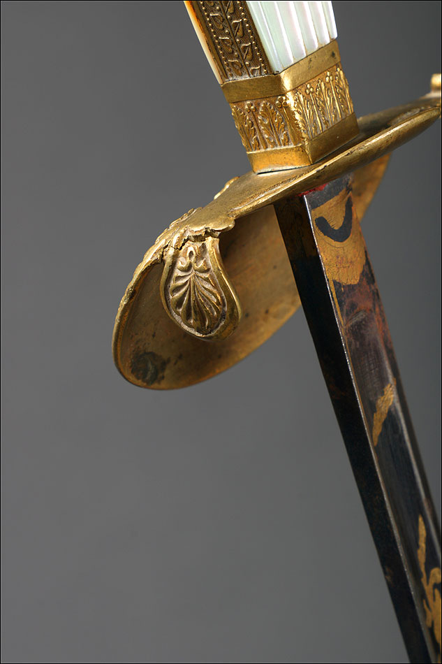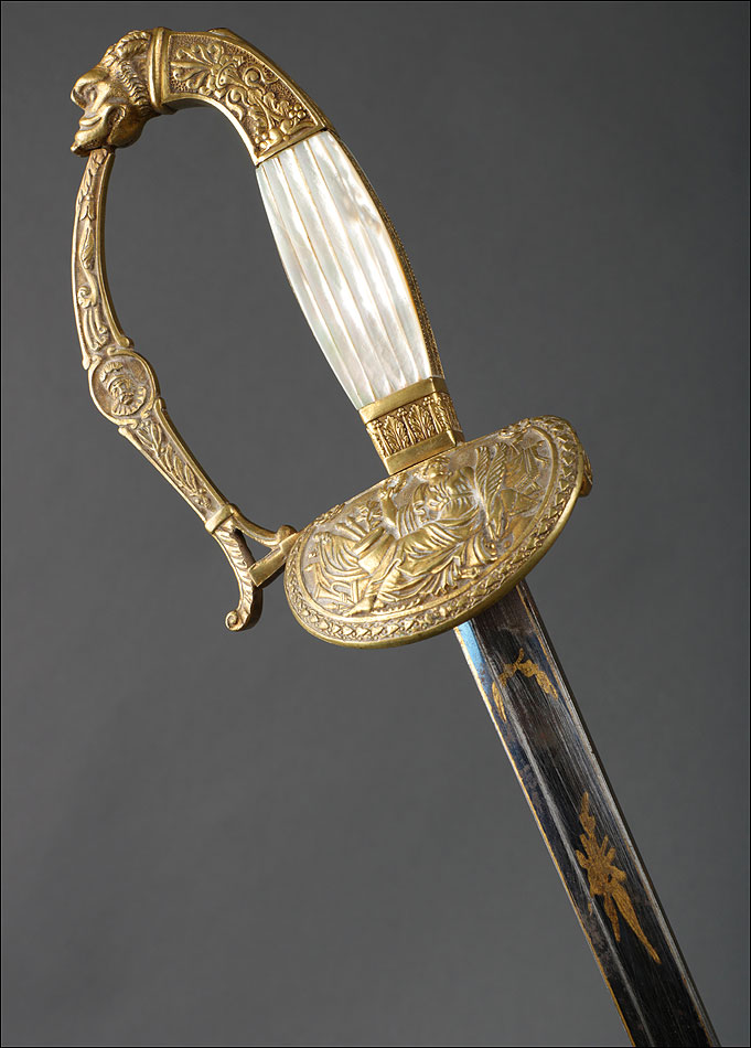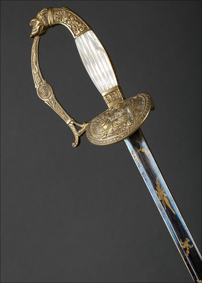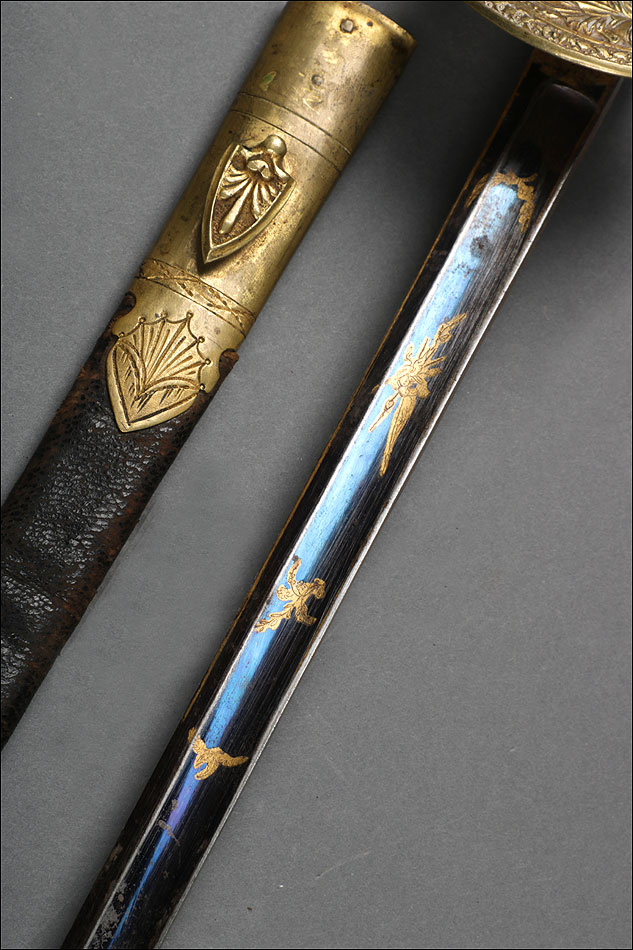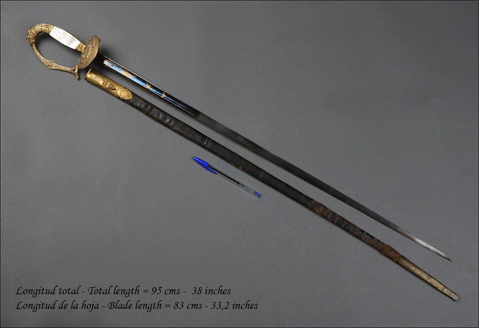 Magnífica y antigua espada de oficial superior en pavón y oro, fabricada en Francia circa 1830 y en excelente estado de conservación. Esta hermosa espada data de la época durante la cual Luis Felipe I, también conocido como “el rey ciudadano”, reinó en Francia. La espada llama la atención por su imponente riqueza decorativa, combinando materiales como el latón, el metal pavonado y la madreperla o nácar. La hoja de acero lleva un bellísimo acabado pavonado, decorado con grabados dorados y en excelente estado de conservación. El color azul del pavón contrasta con el oro y aumenta la riqueza cromática de la espada. La empuñadura de latón lleva un guardamano que se une al puño mediante un pomo con forma de cabeza de perro. El puño está decorado con cachas de nácar natural. El guardamano lleva grabados una serie de motivos decorativos: en el centro hay un medallón con el rostro de un hombre. En la cazoleta podemos ver un precioso relieve que representa a una alegoría de la victoria. El galluelo que sale del extremo de la cruz está ligeramente doblado, pero se mantiene en su lugar. La vaina que acompaña a la espada es de cuero y lleva boquilla de latón con decoración grabada.