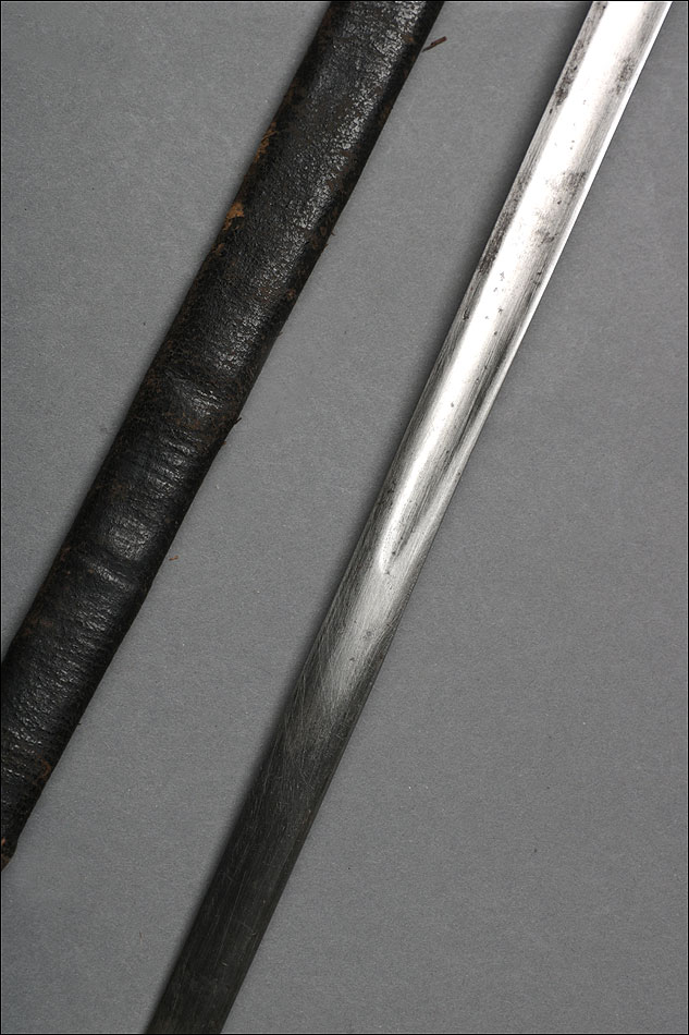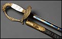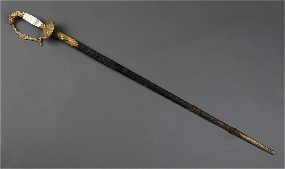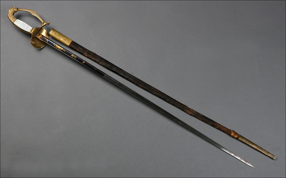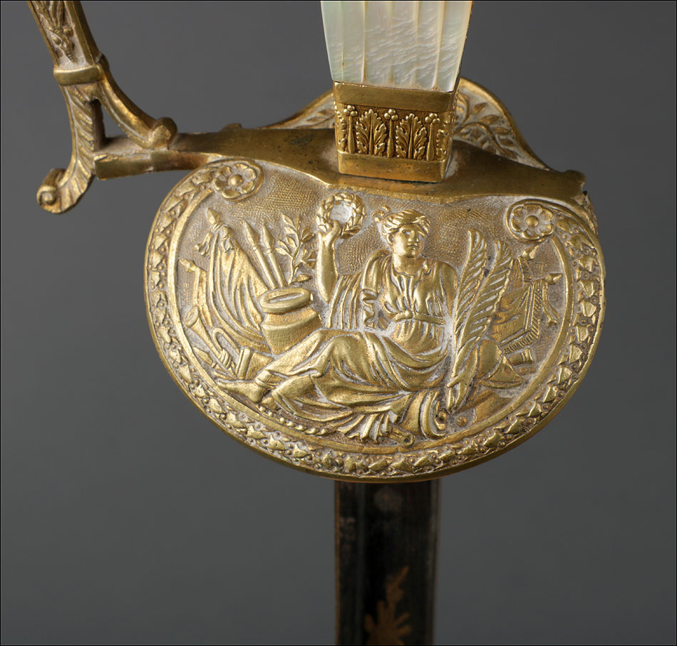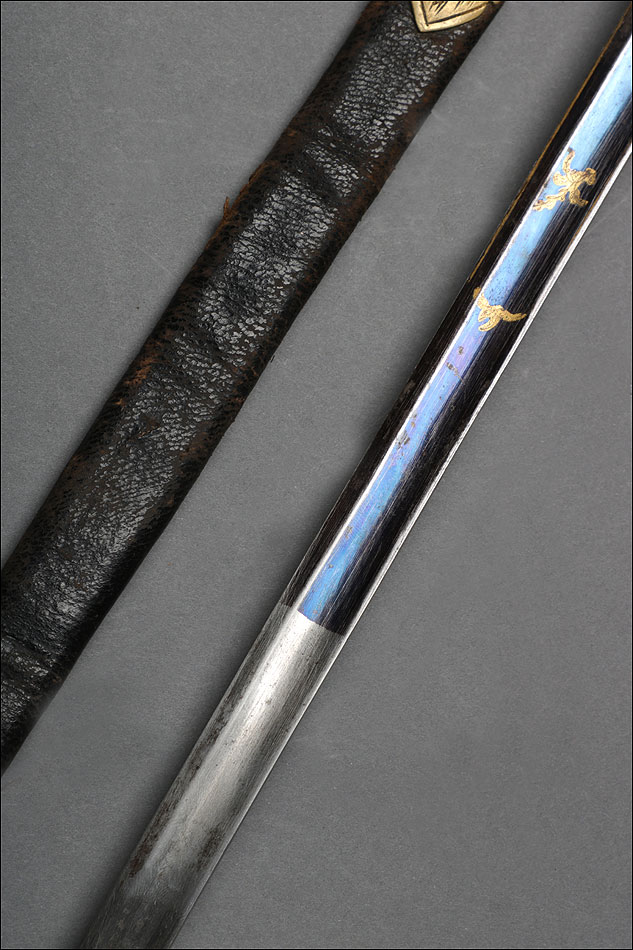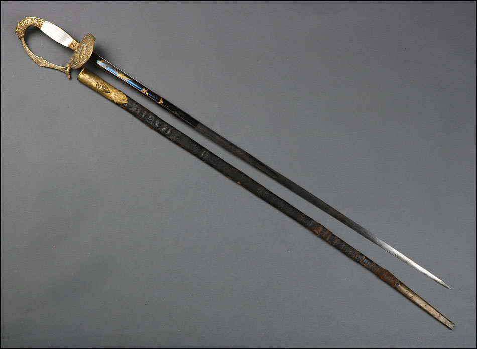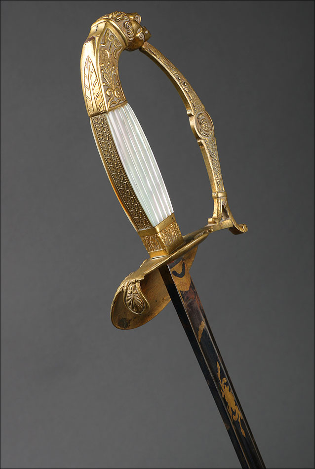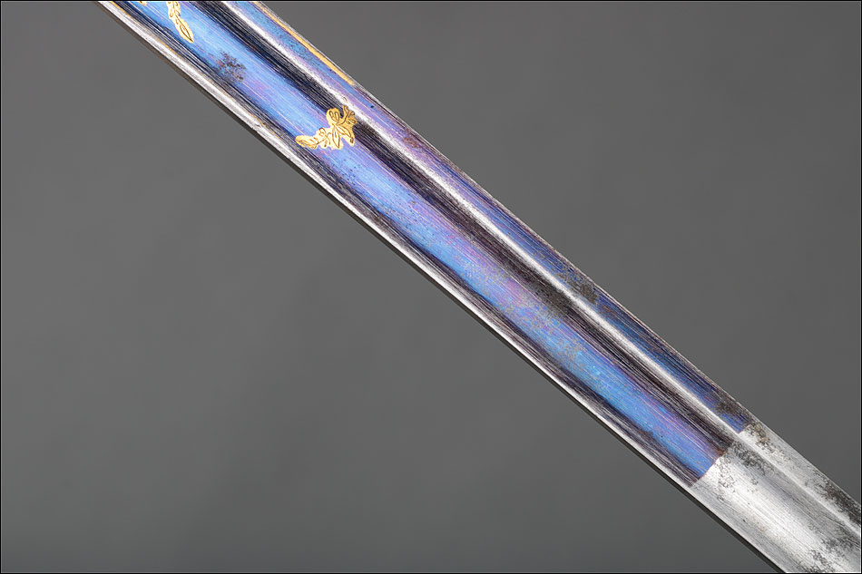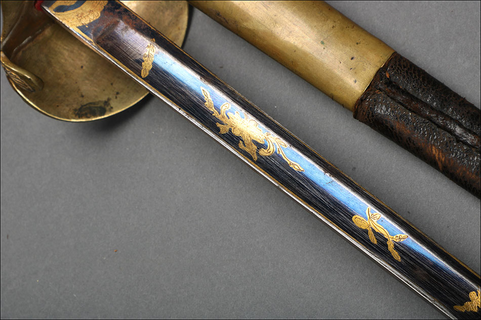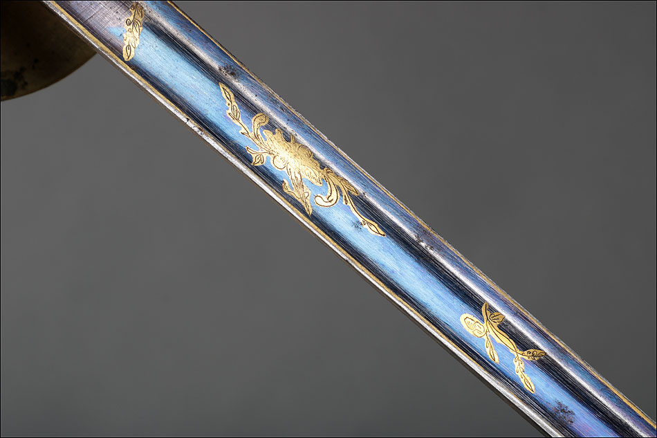 Magnífica y antigua espada de oficial superior en pavón y oro, fabricada en Francia circa 1830 y en excelente estado de conservación. Esta hermosa espada data de la época durante la cual Luis Felipe I, también conocido como “el rey ciudadano”, reinó en Francia. La espada llama la atención por su imponente riqueza decorativa, combinando materiales como el latón, el metal pavonado y la madreperla o nácar. La hoja de acero lleva un bellísimo acabado pavonado, decorado con grabados dorados y en excelente estado de conservación. El color azul del pavón contrasta con el oro y aumenta la riqueza cromática de la espada. La empuñadura de latón lleva un guardamano que se une al puño mediante un pomo con forma de cabeza de perro. El puño está decorado con cachas de nácar natural. El guardamano lleva grabados una serie de motivos decorativos: en el centro hay un medallón con el rostro de un hombre. En la cazoleta podemos ver un precioso relieve que representa a una alegoría de la victoria. El galluelo que sale del extremo de la cruz está ligeramente doblado, pero se mantiene en su lugar. La vaina que acompaña a la espada es de cuero y lleva boquilla de latón con decoración grabada.