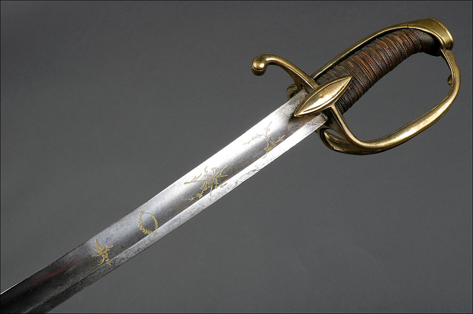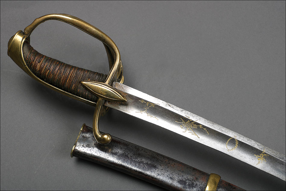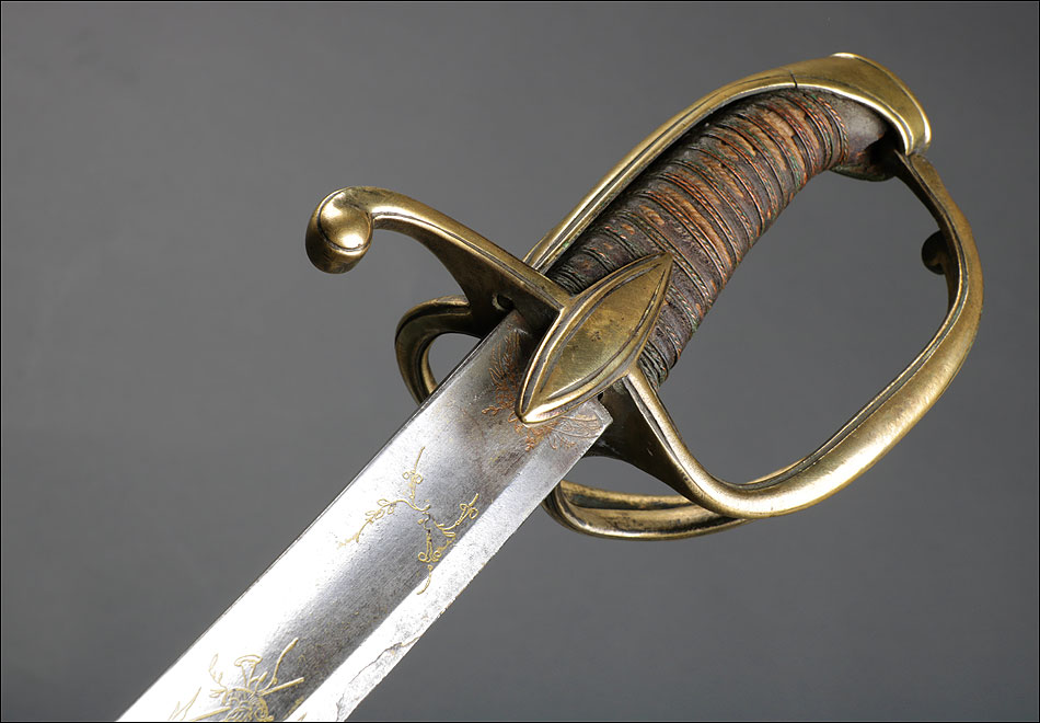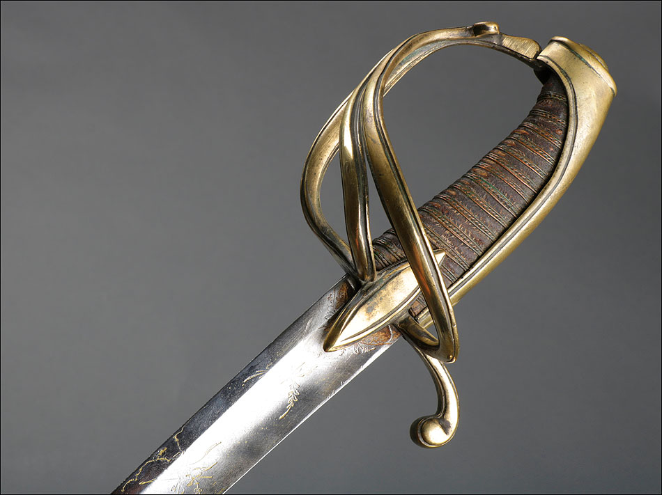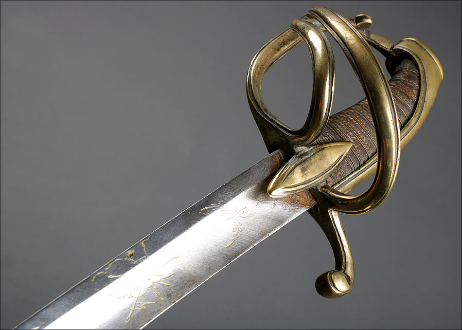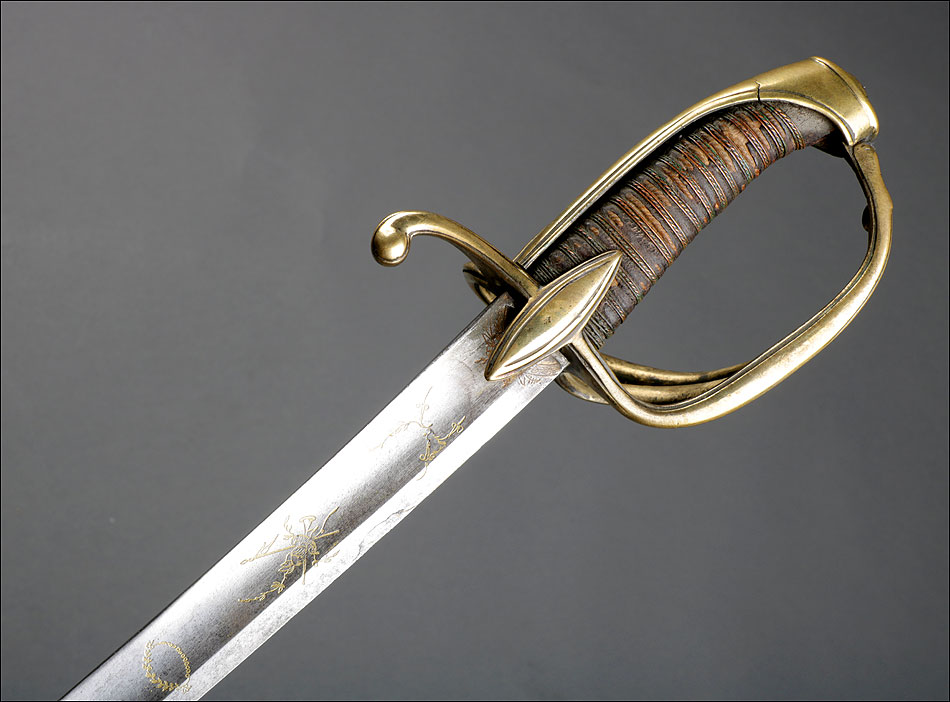 Hermosa y antigua espada-sable napoleónica de oficial de caballería ligera modelo An XI, fabricada en Francia circa 1810 y en magníficas condiciones. Esta pieza destaca por su sobriedad y su elegancia: la preciosa empuñadura de latón contrasta con el acero plateado de la hoja, decorada a su vez con delicados relieves dorados. El metal de la hoja está en muy buenas condiciones, sin rastros de óxido o desgaste. Los detalles dorados representan distintos símbolos: coronas de laurel, ramos de flores, bodegones de instrumentos musicales y armas… Son motivos realizados al detalle que aportan a la espada un atractivo muy especial. La empuñadura es de latón y lleva una guarda que se ramifica en tres gavilanes, que se unen a la cruz mediante una pieza de latón en forma de mandorla. Está rematada por un galluelo. El puño es de madera y conserva el torzal. La vaina es también de acero y lleva boquilla, batiente y dos anillas en metal dorado.