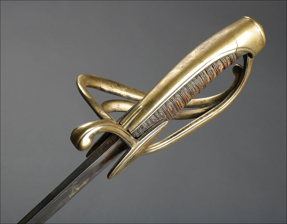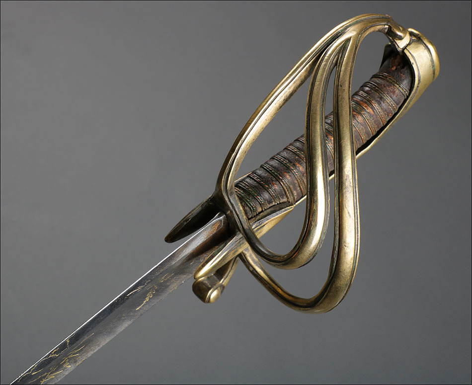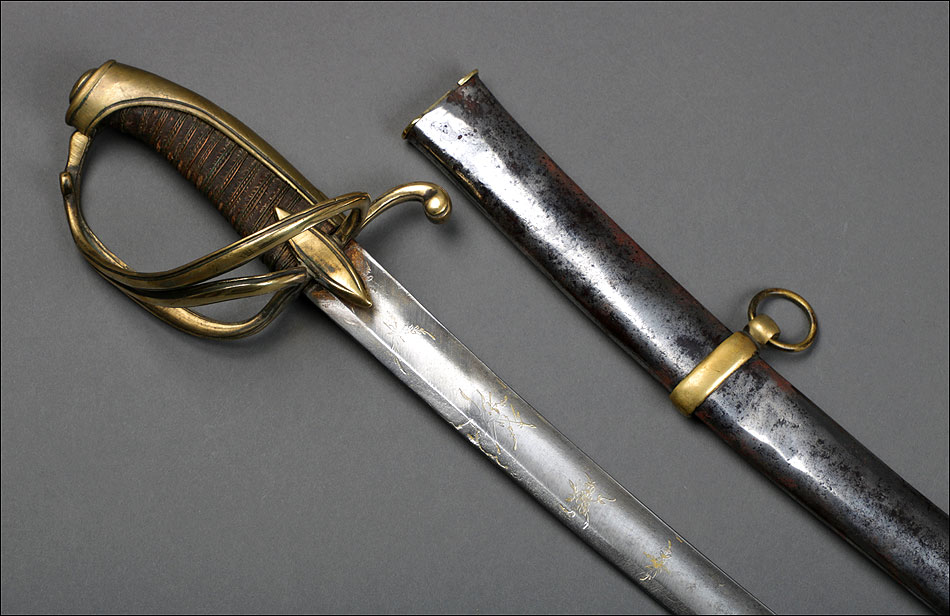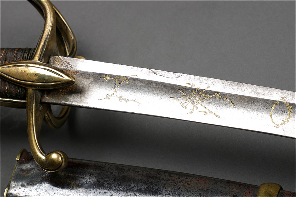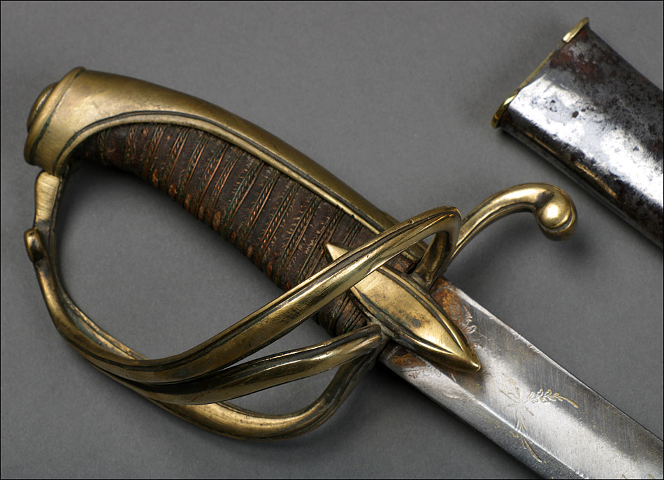 Hermosa y antigua espada-sable napoleónica de oficial de caballería ligera modelo An XI, fabricada en Francia circa 1810 y en magníficas condiciones. Esta pieza destaca por su sobriedad y su elegancia: la preciosa empuñadura de latón contrasta con el acero plateado de la hoja, decorada a su vez con delicados relieves dorados. El metal de la hoja está en muy buenas condiciones, sin rastros de óxido o desgaste. Los detalles dorados representan distintos símbolos: coronas de laurel, ramos de flores, bodegones de instrumentos musicales y armas… Son motivos realizados al detalle que aportan a la espada un atractivo muy especial. La empuñadura es de latón y lleva una guarda que se ramifica en tres gavilanes, que se unen a la cruz mediante una pieza de latón en forma de mandorla. Está rematada por un galluelo. El puño es de madera y conserva el torzal. La vaina es también de acero y lleva boquilla, batiente y dos anillas en metal dorado.
