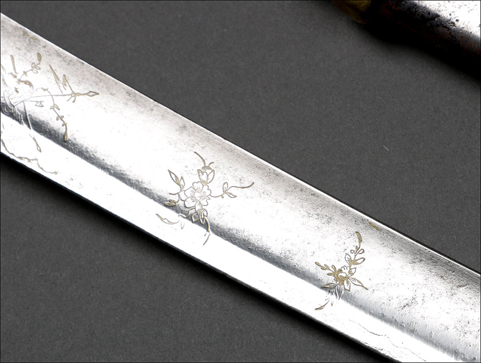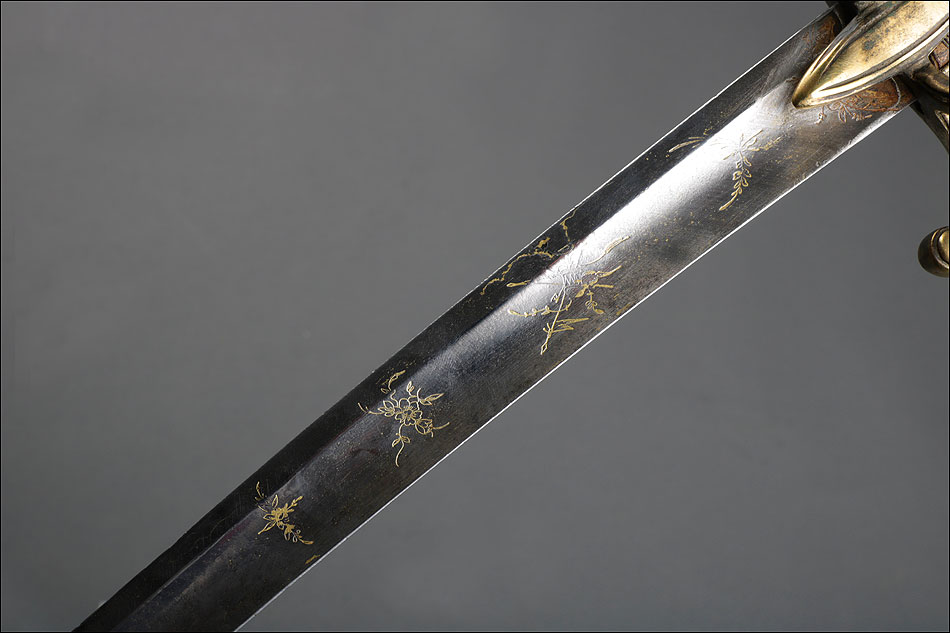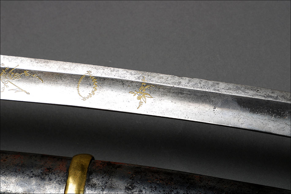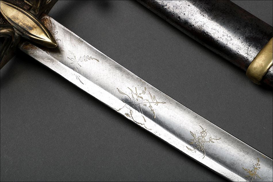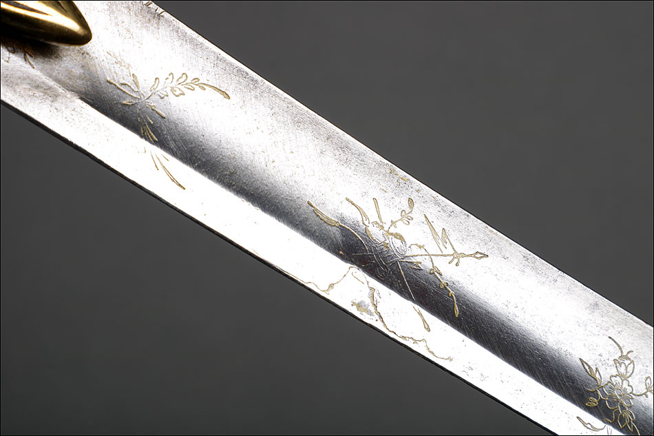 El contraste entre los dos tonos de metal y la preciosa hoja decorada con relieves hacen de esta antigua espada-sable napoleónica una pieza muy especial, digna de un museo de historia y artes bélicas.