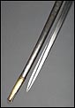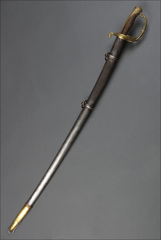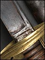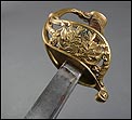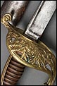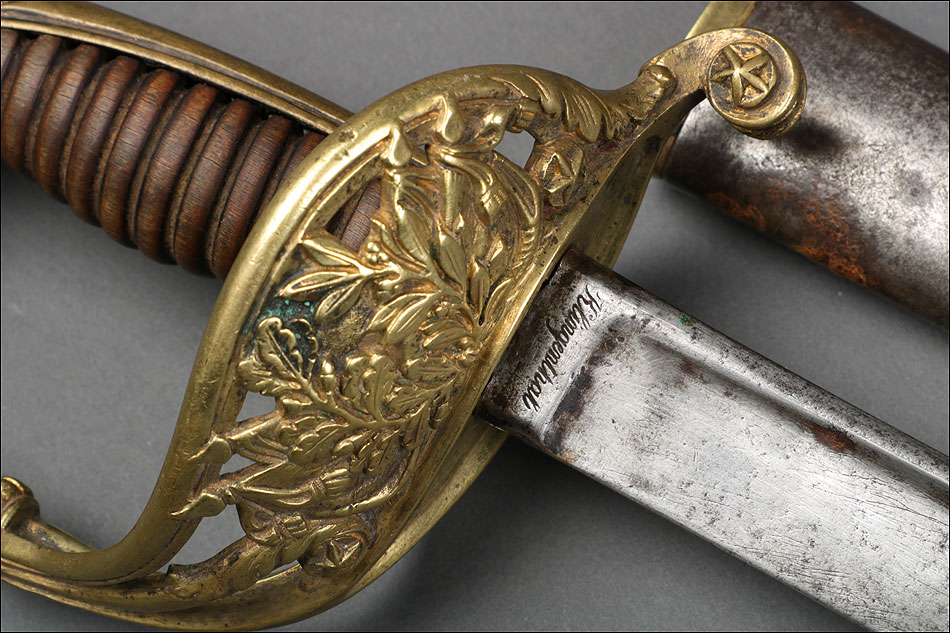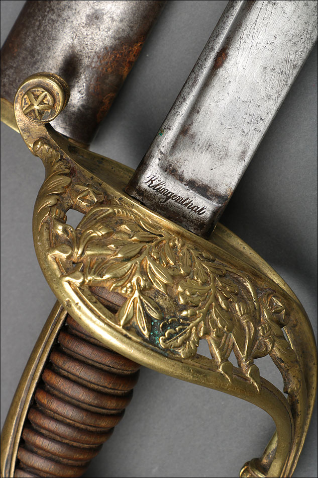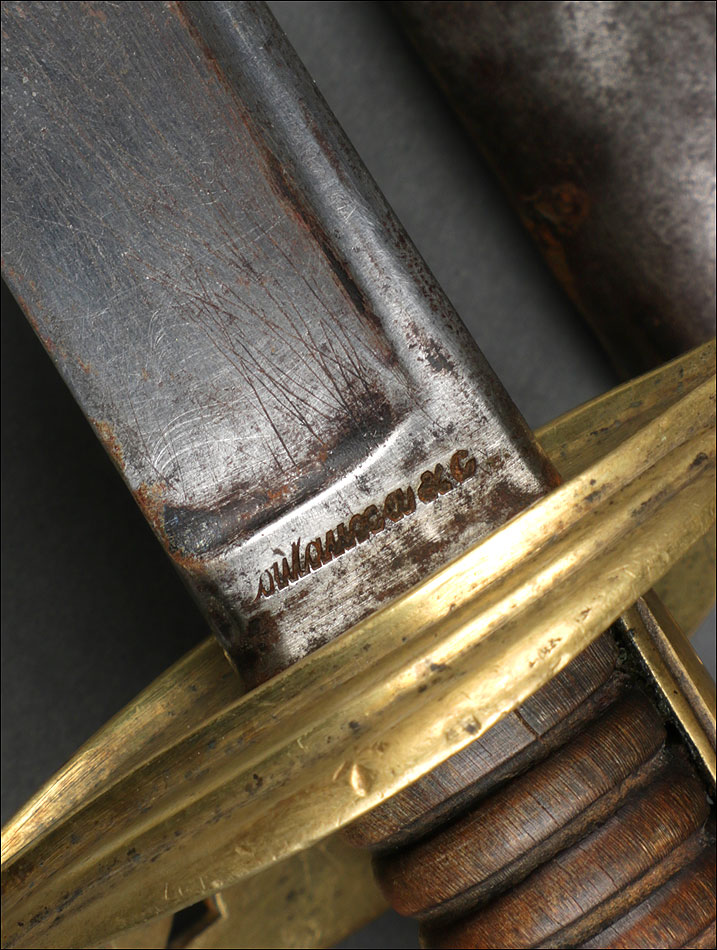Además de estos detalles, la espada que vemos en las imágenes lleva una inscripción grabada a mano en letra cursiva en el punto donde la hoja se encuentra con la empuñadura. En ella podemos leer la palabra Kligenthal, referente al lugar donde se fabricó. Solo las espadas forjadas para la compañía de cazadores de Vincennes de 1838 proceden de esta fábrica, lo que confirma la pertenencia del arma al primer batallón. La hoja de la espada es de acero liso y está en buen estado, al igual que la vaina. Esta lleva boquilla y batiente de latón: ambas piezas hacen un bello contraste con el acero. La empuñadura es de latón y está profusamente decorada con motivos grabados; en la cazoleta hay un grupo de motivos vegetales relacionados con la caza que se reproducen en el resto de la pieza. El puño es de madera maciza y está en muy buenas condiciones.