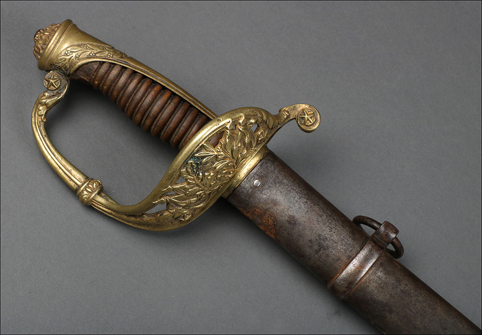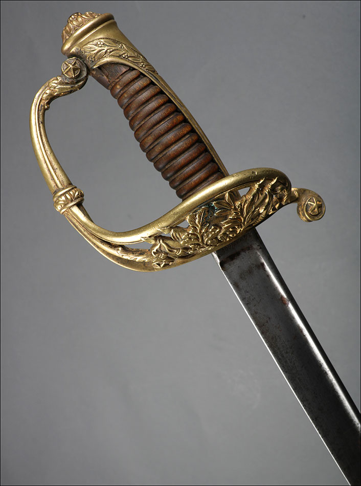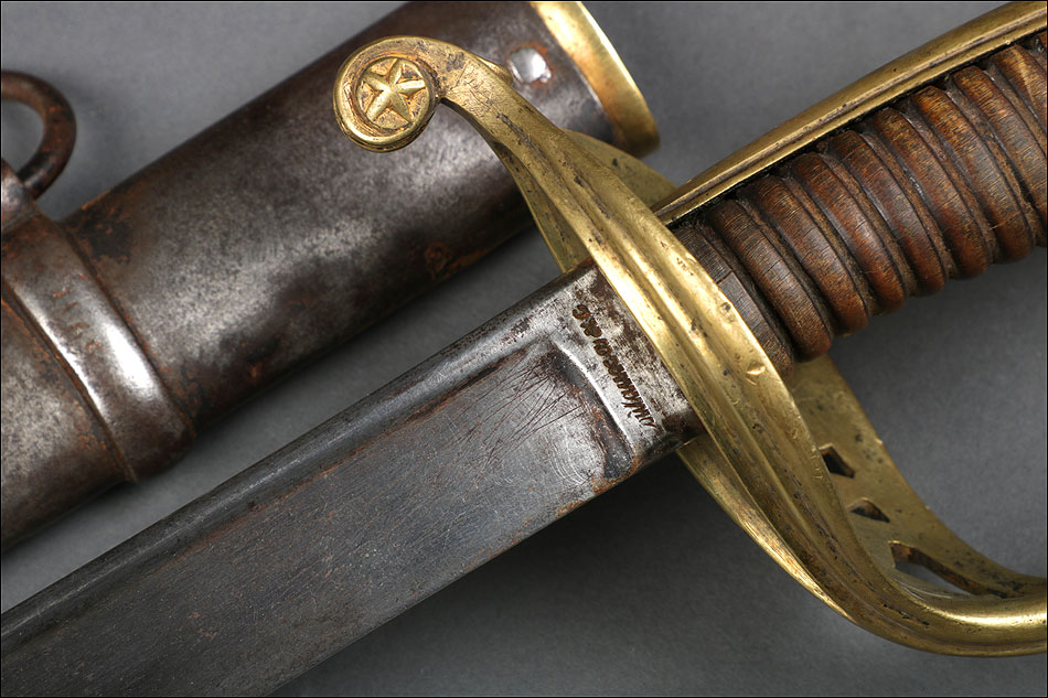 Muy rara espada-sable de oficial de Cazadores de Vincennes modelo 1838, procedente de Francia y forjada en el año 1838. Se trata de una pieza muy especial, ya es una de las que se forjaron específicamente para la compañía de 200 cazadores que se creó de forma experimental en 1838. Aunque a partir de 1840 se fabricaron más espadas para otros batallones de cazadores que se crearon posteriormente, el nombre “cazadores de Vincennes” se refiere siempre a la primera compañía. Los modelos son similares pero se diferencian en dos pequeños detalles que podemos ver en esta espada-sable: la estrella grabada en el extremo del guardamano que conecta con el pomo y la que aparece en el galluelo. En modelos posteriores, las estrellas se convierten en espirales o caracolas.