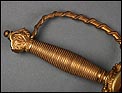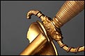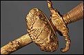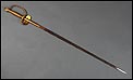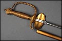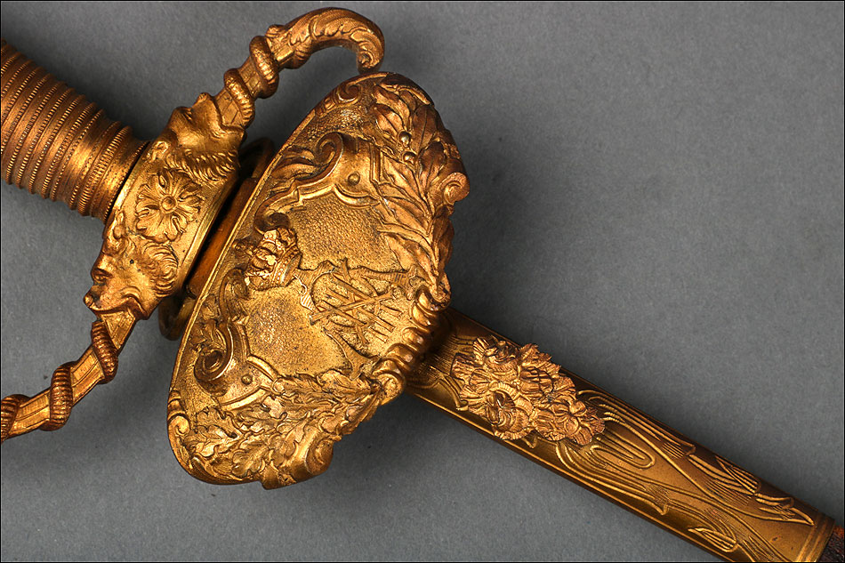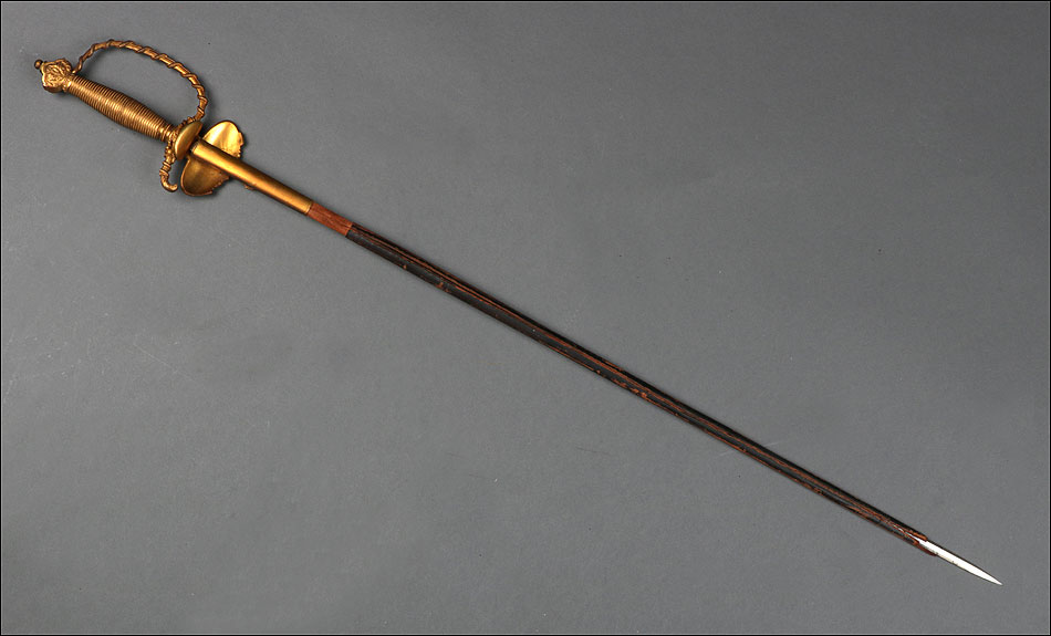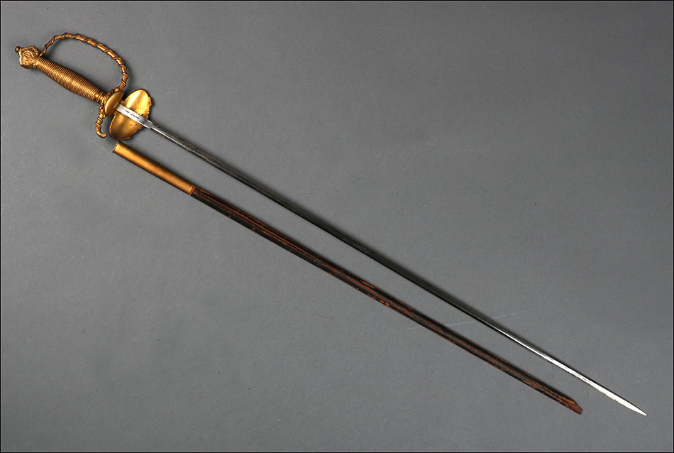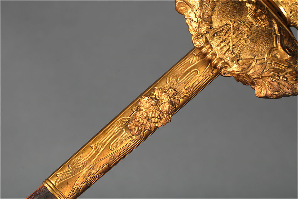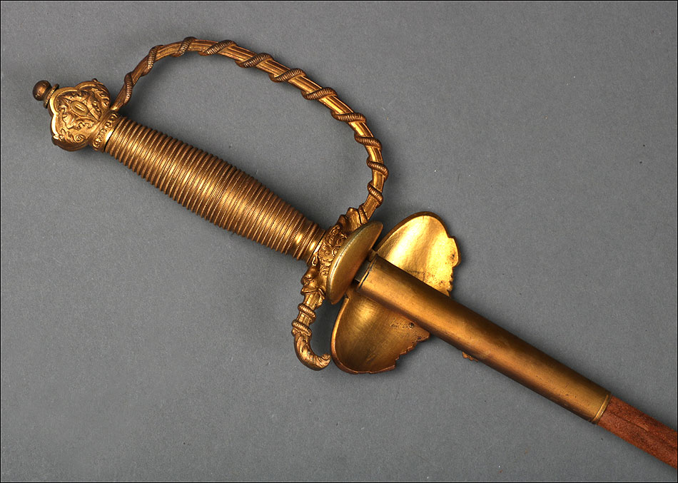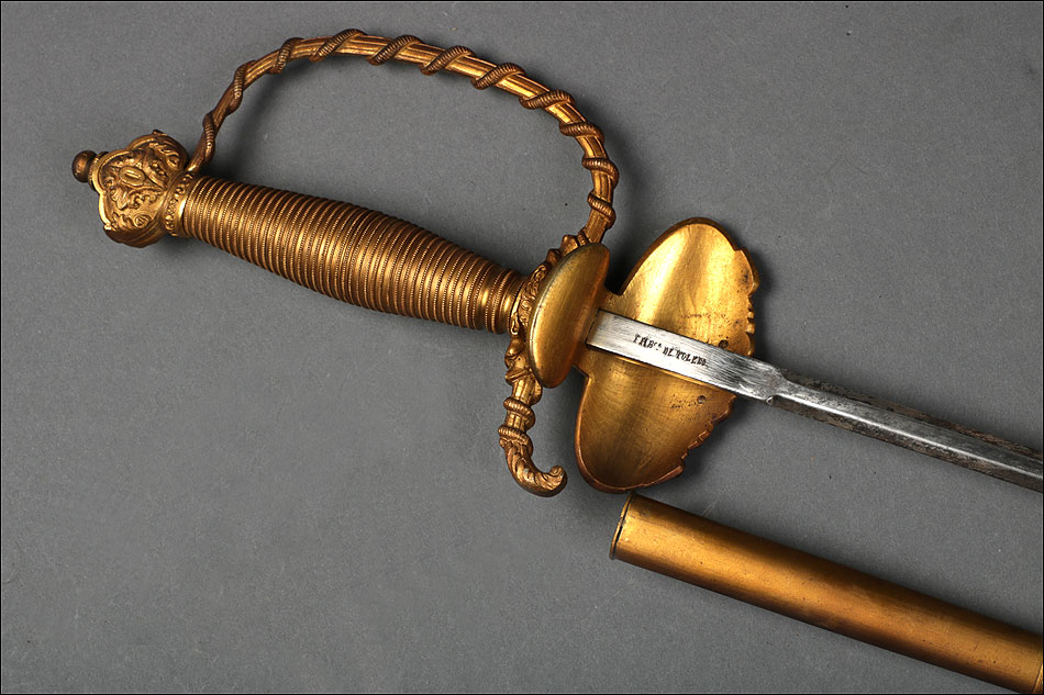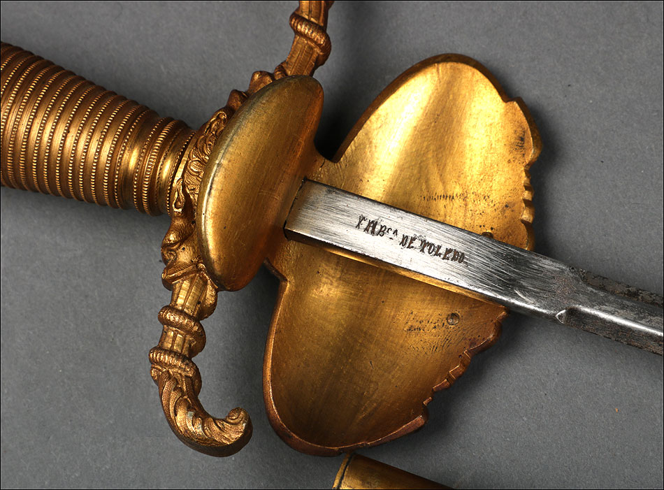 Rara espada de ceñir de gentilhombre de cámara del rey Alfonso XIII, fabricada en España circa 1900. La espada muestra una gran belleza decorativa, sobre todo en su empuñadura de latón. Conserva su vaina original y la hoja en muy buen estado, firmada por la Real Fábrica de Toledo. Las espadas de ceñir son armas ceremoniales utilizadas como complemento para los uniformes formales o de gala. En este caso se trata de una espada de gentilhombre, figura que designaba a los cortesanos de origen noble que acompañaban y servían al rey en sus aposentos y viajes. La empuñadura de la espada está fabricada íntegramente en latón, incluso el puño (que suele ser de madera). En la cruz hay una cabeza de león de cuya boca sale el guardamano, que termina en un pomo con la letra O grabada. Bajo la cruz hay una placa decorativa de forma ovalada grabada con un monograma del rey: una A con forma de montaña con el número romano XIII en su interior y una corona encima. La vaina de cuero negro lleva brocal de latón con un relieve en forma de ramo de flores, muy decorativo. El batiente se ha perdido.