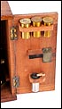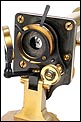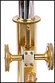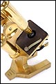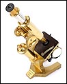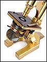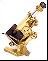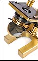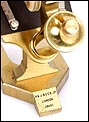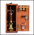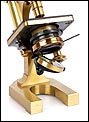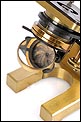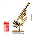 El latón está en muy buenas condiciones y conserva el lacado transparente original, que le aporta una atractiva pátina y lo ha mantenido en buen estado hasta nuestros días. El microscopio va acompañado de un ocular y tres lentes de distintos aumentos. Las lentes se guardan en sus estuches de latón, con el nombre del fabricante grabado en las tapas. Todo el conjunto se guarda en una magnífica caja de madera de caoba maciza, de color claro dorado y con bellas uniones en cola de milano realizadas a mano. La caja está en buen estado y conserva el juego de cerradura y llave en funcionamiento.