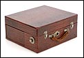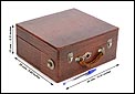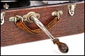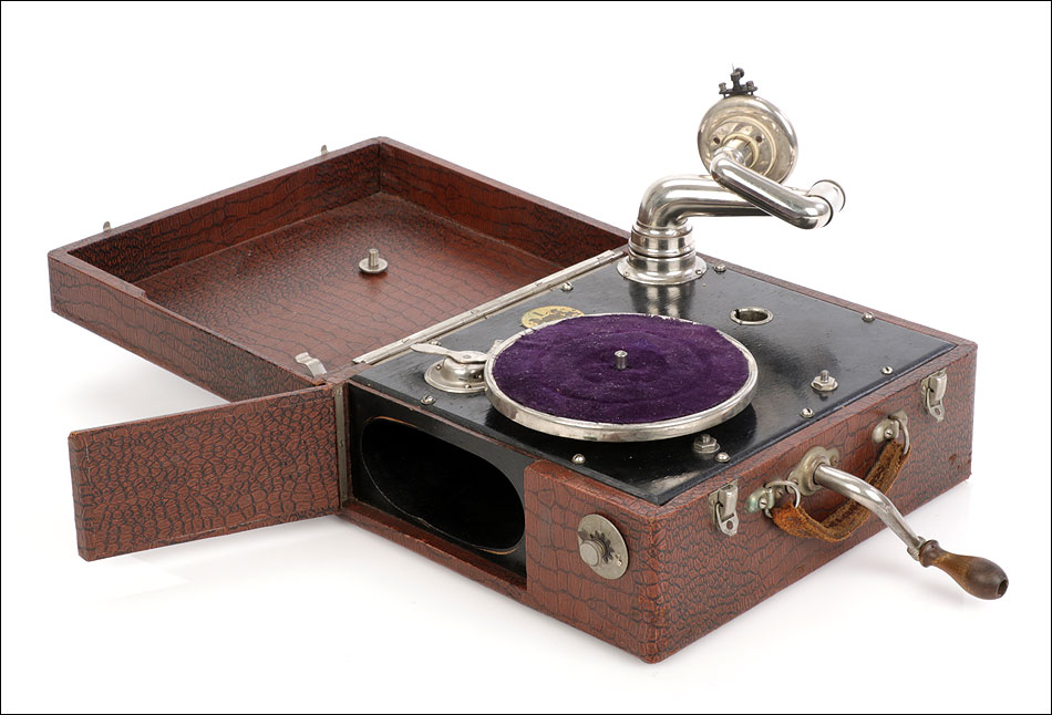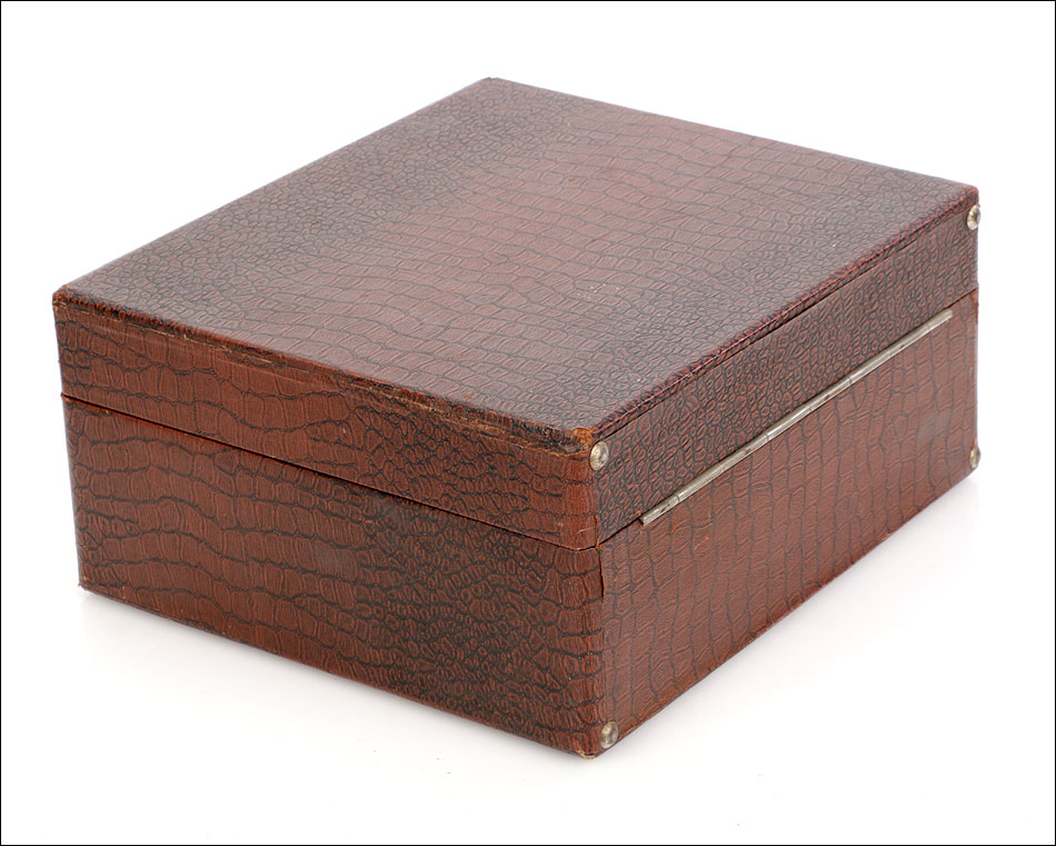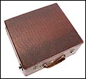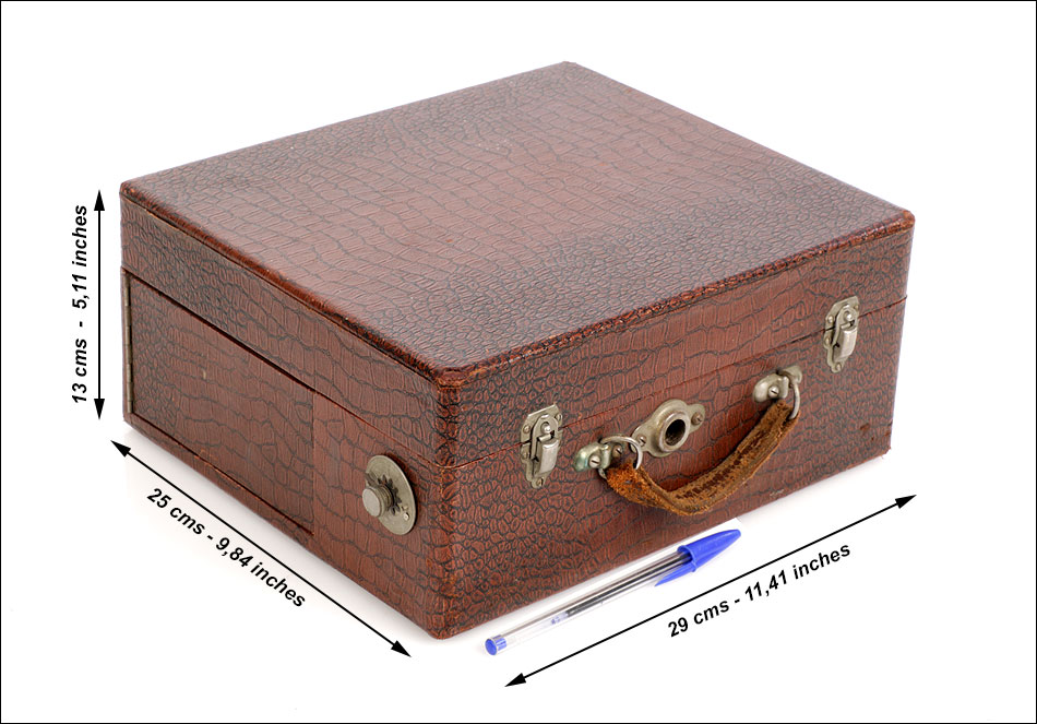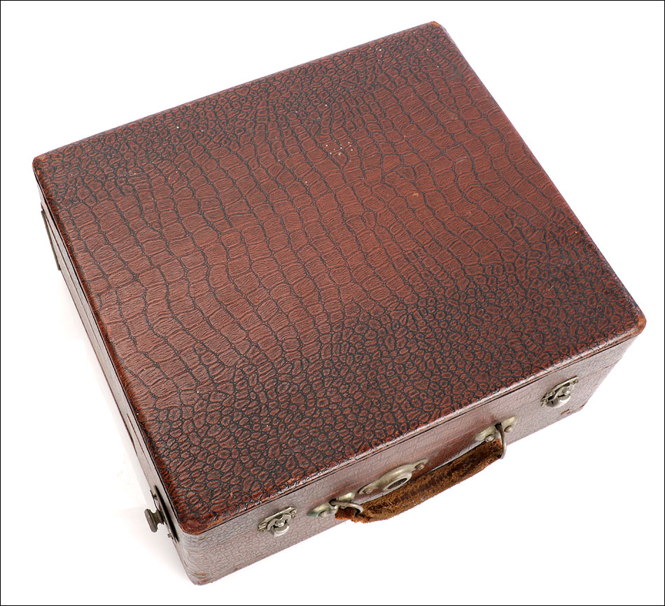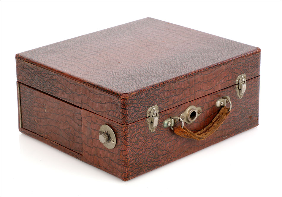 La maleta es de madera maciza y sólida, de forma cuadrada. Está revestida por el interior y el exterior de falsa piel de cocodrilo en color marrón. Este revestimiento aporta un atractivo muy especial al gramófono: su llamativo aspecto contrasta fuertemente con el sobrio diseño cuadrangular del artículo. El revestimiento se encuentra en magnífico estado, sin signos de desgaste o roturas. La maleta lleva un asa de piel auténtica original de época, algo desgastada pero que todavía cumple perfectamente su función. Los herrajes y cierres son de metal plateado y se encuentran en buenas condiciones.
