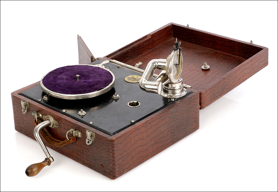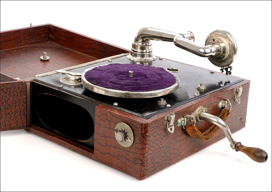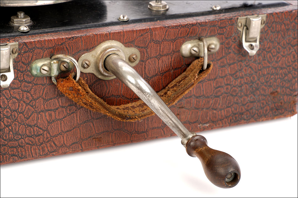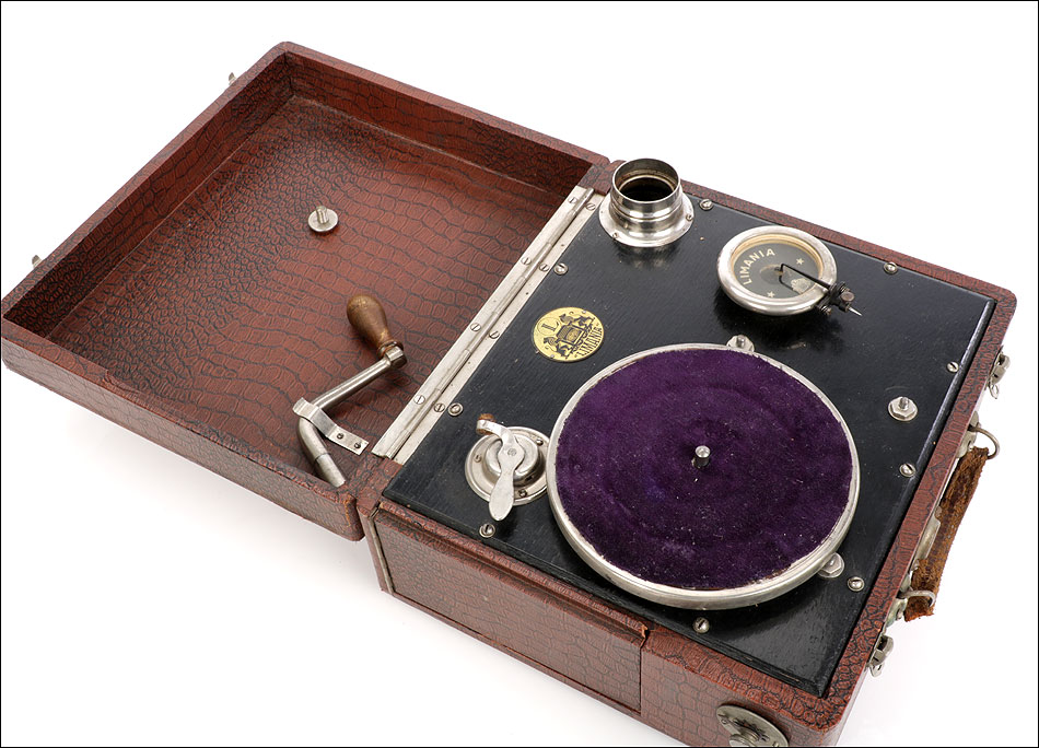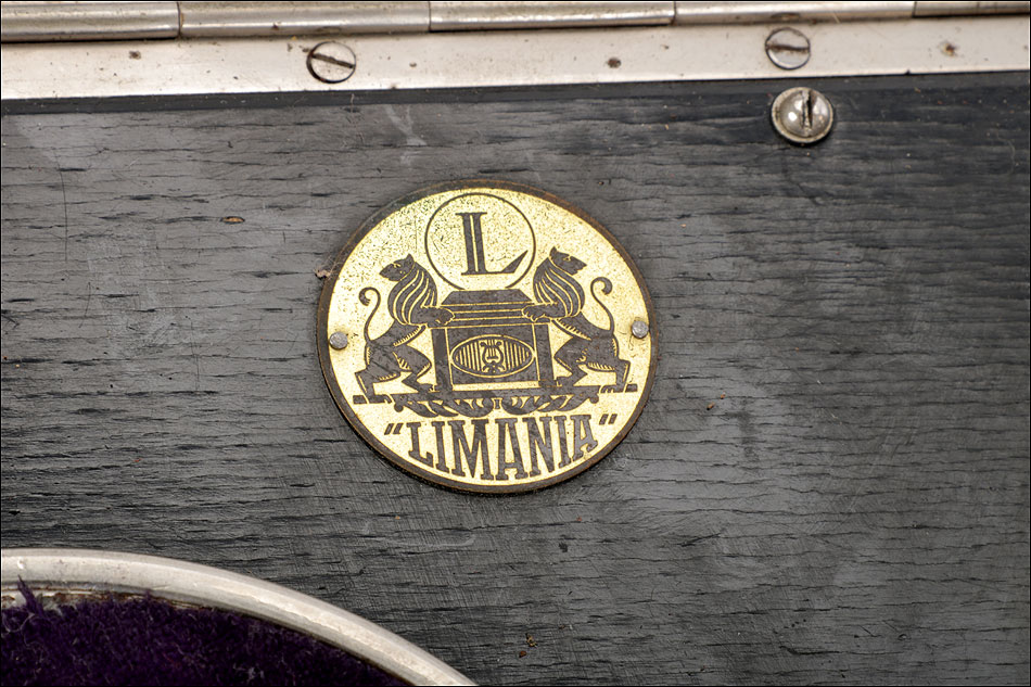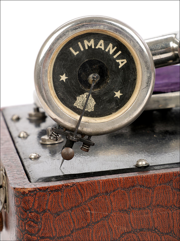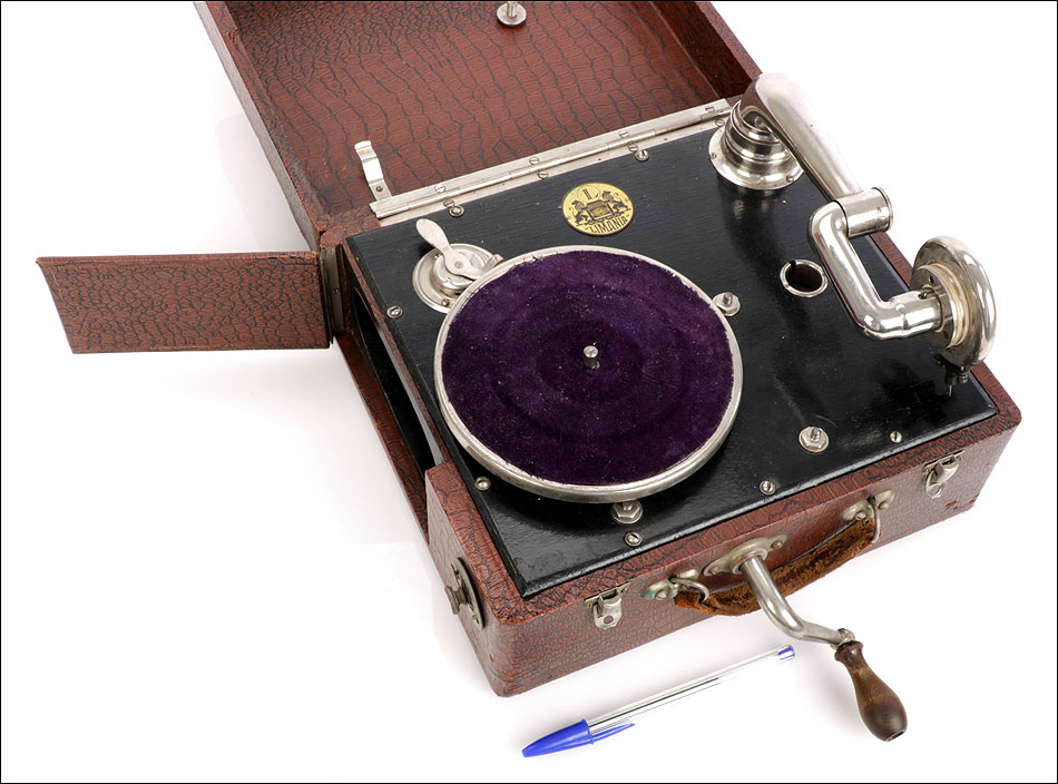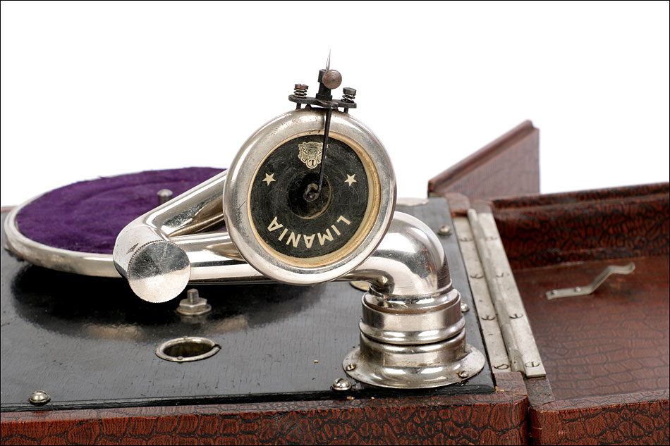 Si abrimos el gramófono, en el interior encontramos una caja lacada en color negro sobre la que descansa el plato. Bajo ella se encuentra el motor del aparato, oculto a la vista. Bajo el plato, en un lateral de la maleta hay una pequeña puerta que descubre el hueco del altavoz. El brazo y la manivela se conectan en sus respectivos lugares para poder poner en marcha el gramófono: ambos son de metal plateado y están muy bien conservados. El brazo va conectado al reproductor original, con el nombre de la marca en letras blancas. Junto al plato podemos ver una placa de época con el logotipo de la marca LIMANIA, en buenas condiciones y con un atractivo diseño.