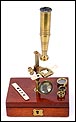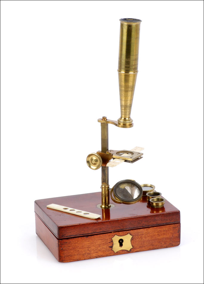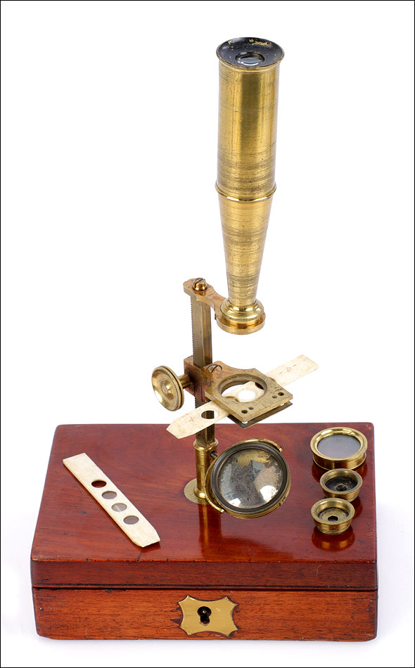Fascinante microscopio compuesto antiguo tipo Cary fabricado en Inglaterra circa 1850, muy bien conservado y totalmente original. Este instrumento es un modelo muy atractivo, de diseño sencillo y eficaz y con una estética decimonónica llena de encanto e interés. El nombre del microscopio se debe a la empresa Cary, fundada por William Cary (1759-1825) y continuada posteriormente por sus hijos y por los aprendices Gould y Porter. El negocio se mantuvo en activo durante más de 100 años. Al parecer este modelo fue diseñado por Charles Cary. El microscopio está en estado de funcionamiento y permite observar aún las muestras y los preparados. Para utilizarlo hay que sacar el aparato del estuche y montarlo sobre la rosca de la tapa. La rosca lleva grabada la inscripción WILLIAM HILL CARRIE, probablemente el nombre de un anterior propietario del microscopio. En el estuche encontramos dos preparados de época con base de hueso (presentan desperfectos) y una live box. El estuche es de madera de caoba maciza y se encuentra en muy buen estado; su interior está compartimentado para guardar tanto el microscopio desmontado, como los accesorios.