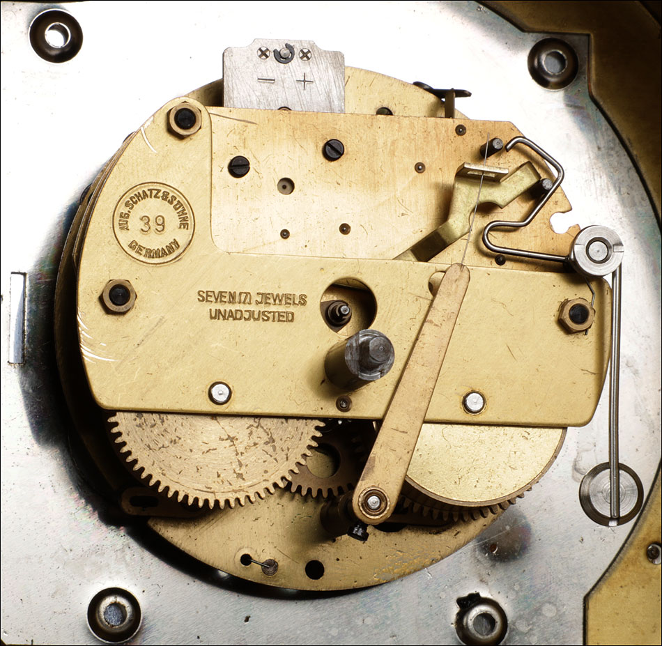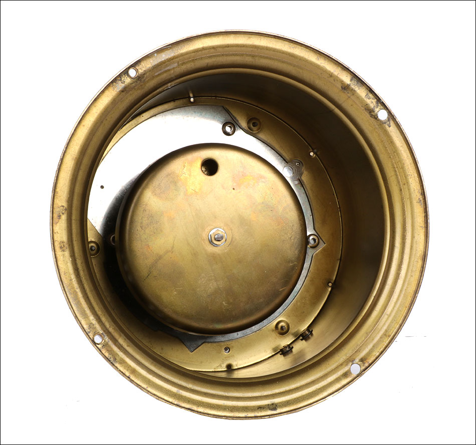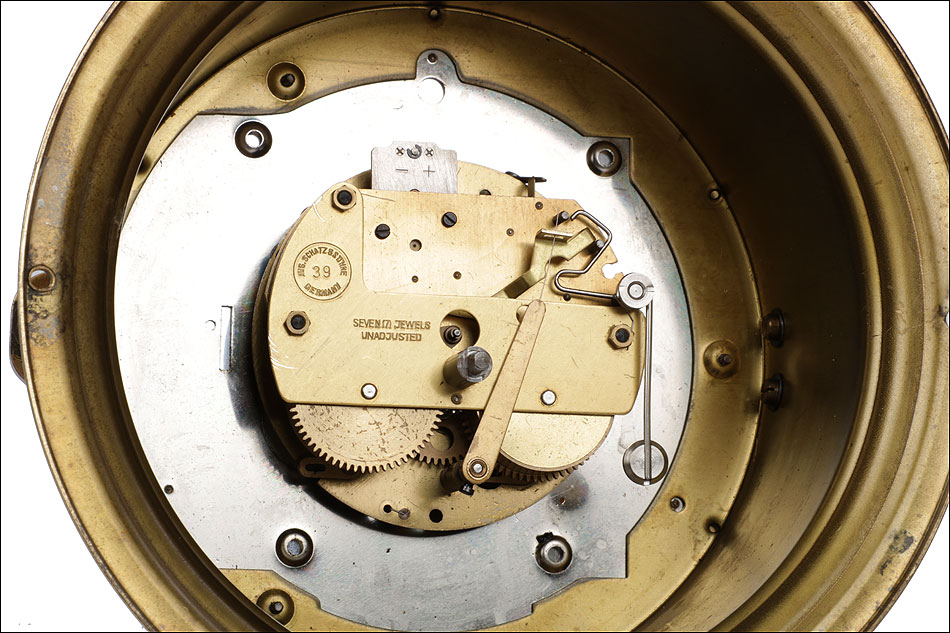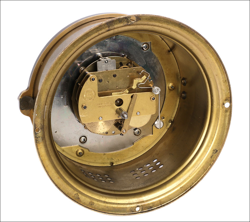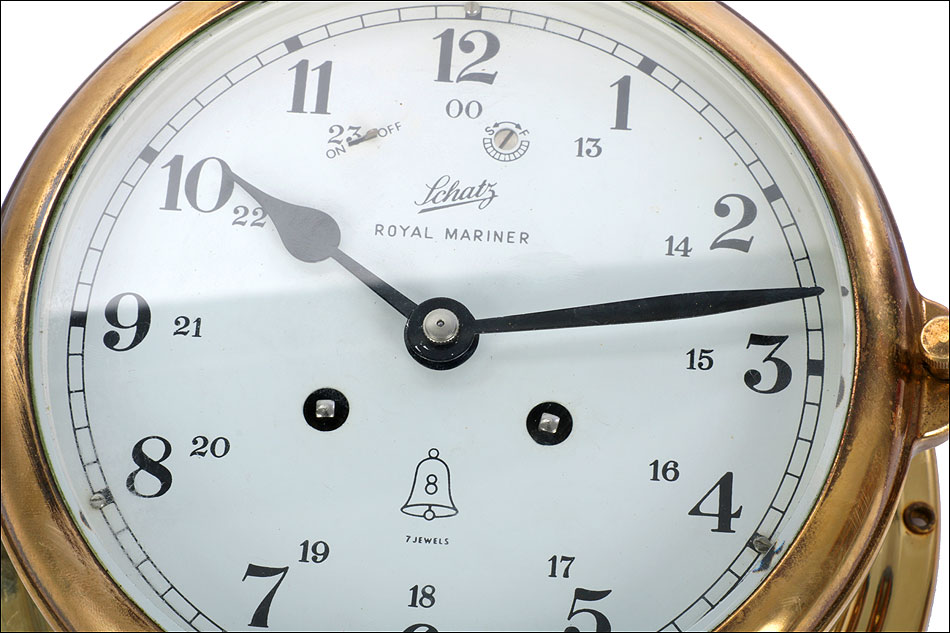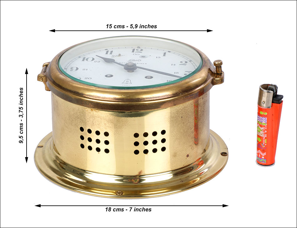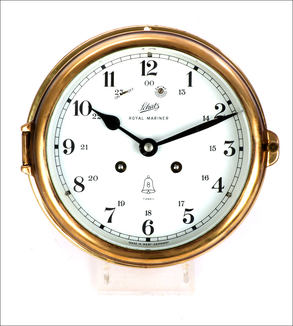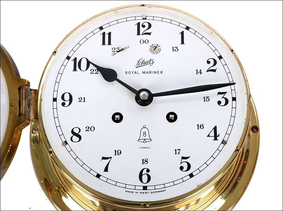 Magnífico reloj de barco Royal Mariner con sonería de cambio de guardia, manufacturado en Alemania en los años 70 del siglo XX. Este precioso reloj se conserva en excelente estado; su mecanismo ha sido revisado al detalle por un profesional de la relojería para garantizar su perfecto funcionamiento. Incluye sonería que marca el cambio de guardia en el puente de mando del barco. La carcasa lleva una base con cuatro perforaciones, diseñadas para atornillar el reloj a la pared, un panel de madera, un mueble o cualquier soporte expositivo. Está totalmente fabricada en latón. La esfera blanca con números arábigos negros lleva agujas rectas del mismo color. En ella vemos impreso el nombre del modelo, ROYAL MARINER, y el de la empresa fabricante, SCHATZ. Si damos la vuelta al reloj, en el mecanismo podemos ver grabado de nuevo el nombre y la dirección de la compañía.