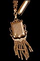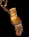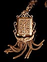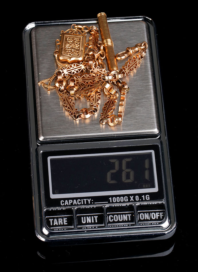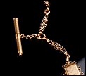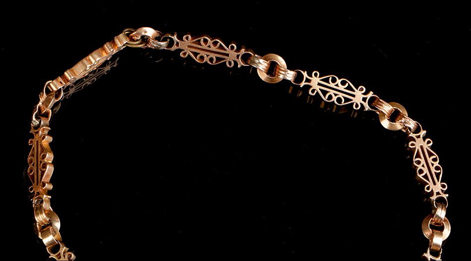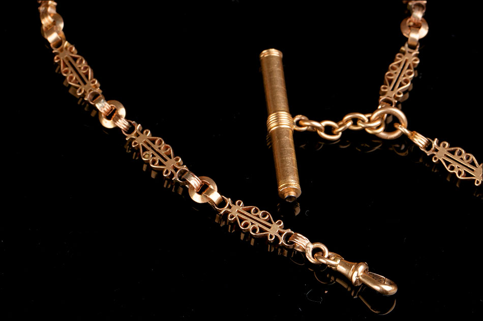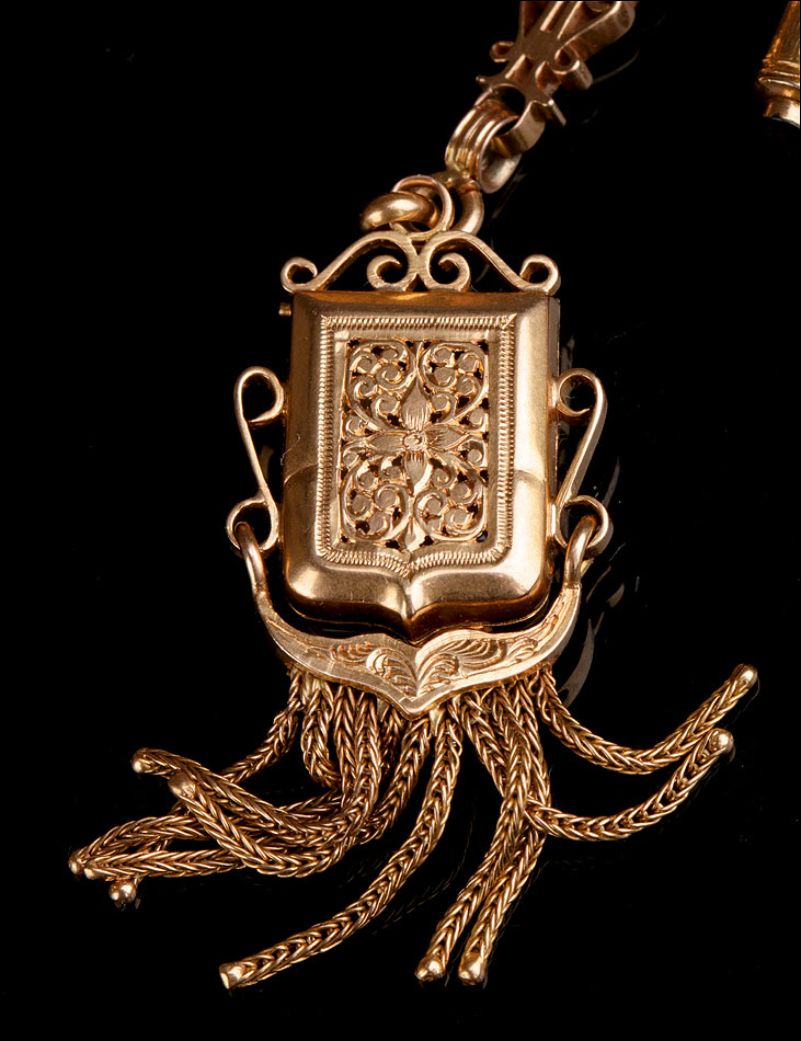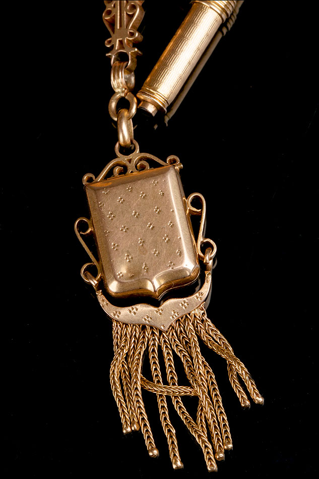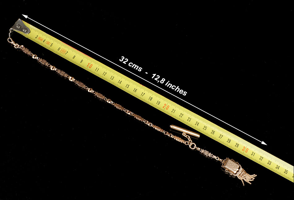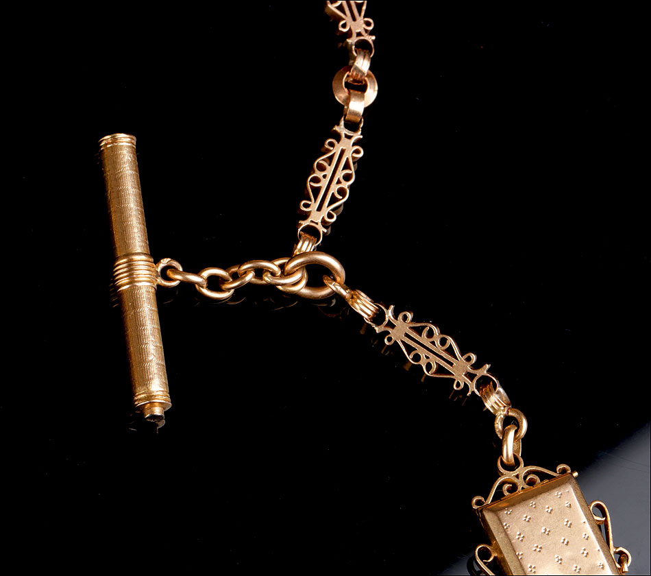 Preciosa y antigua cadena para reloj de bolsillo fabricada en oro macizo de 14K. La cadena está fechada circa 1850 y ha llegado a nosotros en excelente estado de conservación. Se trata de una pieza de orfebrería de alta calidad, con un diseño muy decorativo y elaborado que la dota de nobleza y elegancia. Aunque no lleva contrastes, la cadena ha sido testada por un profesional que ha verificado la calidad del oro con el que fue fabricada. Está formada por una serie de eslabones alargados confeccionados con finas molduras simétricos, unidos entre sí por gruesas anillas. Enganchada a una de las anillas hay una una llave de oro que sirve para dar cuerda al reloj de bolsillo. En el extremo de la cadena podemos ver un pequeño relicario con forma de escudo, muy elaborado y decorado con flecos de oro. Estos elementos estaban destinados a guardar algo relacionado con la mujer amada: un mechón de cabello, un pequeño retrato…