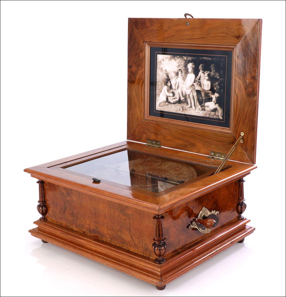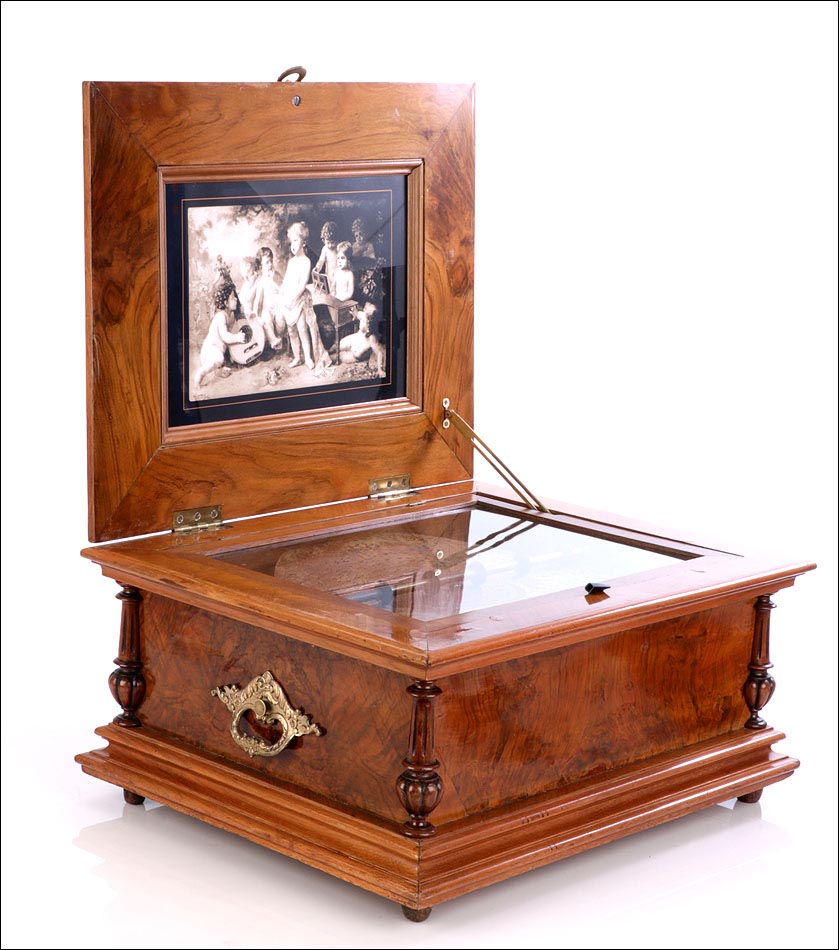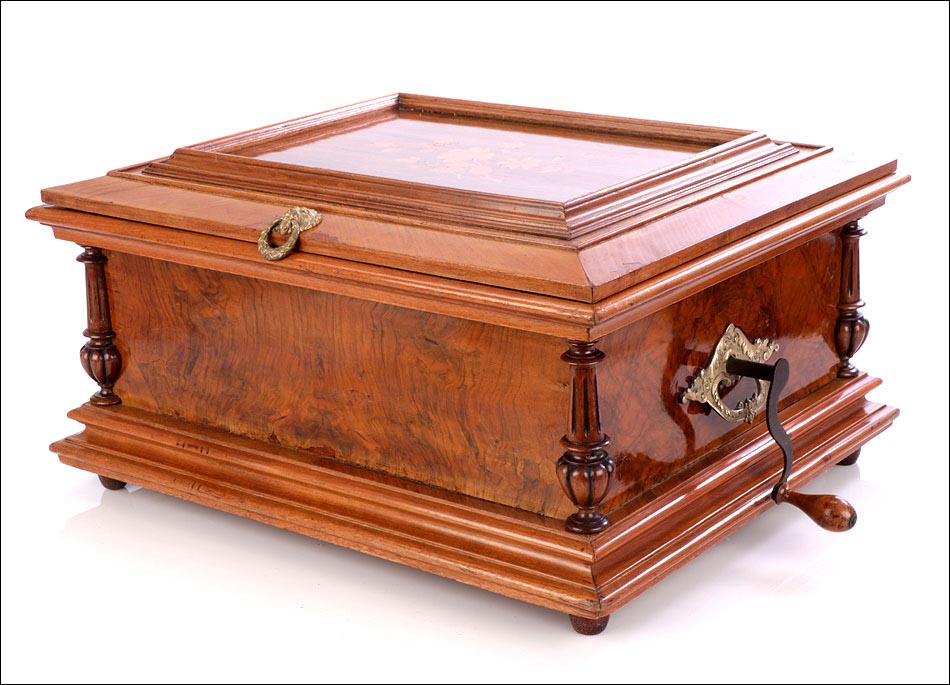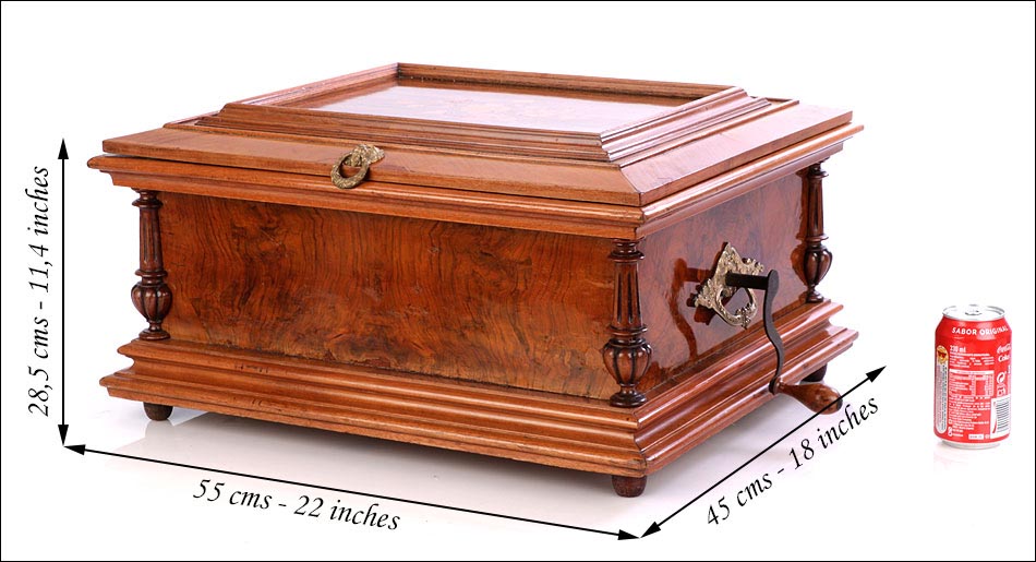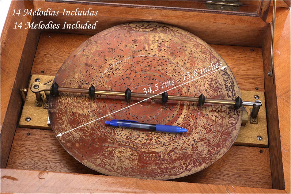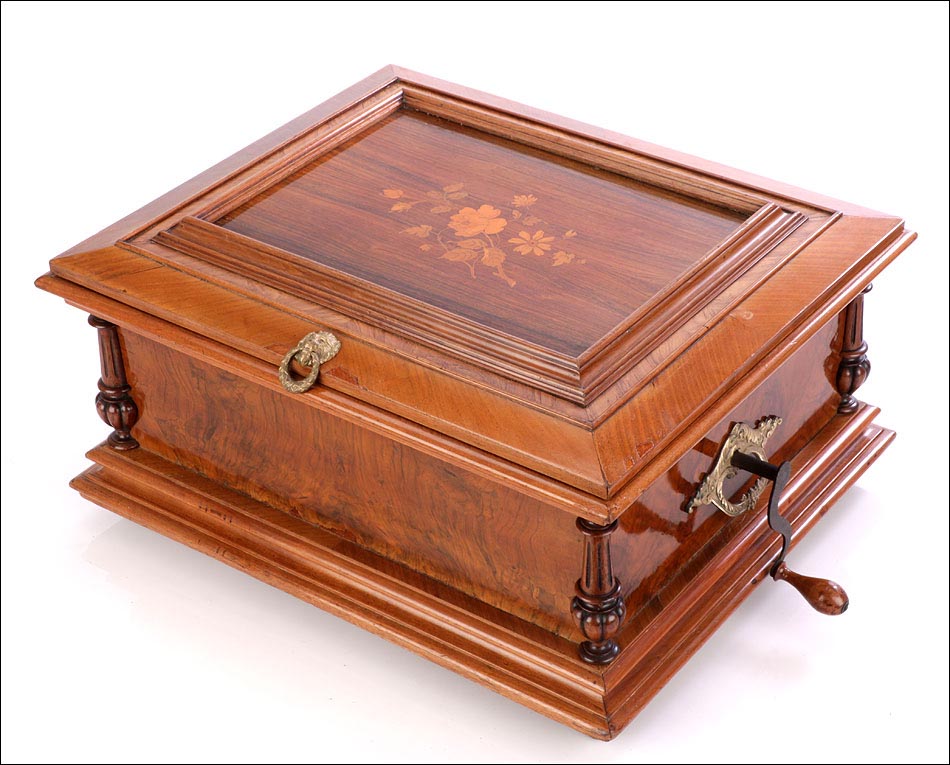 Antigua caja de música de gran tamaño con doble peine, fabricada en Suiza en 1890 y en excelente estado de funcionamiento. La caja se presenta con 14 discos de 34,5 cm originales de época; el mecanismo lleva sistema de doble peine que genera un sonido sublime, limpio y claro. El cuerpo de madera maciza y chapada conserva el barniz original en excelentes condiciones, sin restauración alguna. Está fabricado en madera de nogal y muestra una magnífica decoración en frisage (la veta de la madera hace un diseño de rombo) y lleva incrustaciones de marquetería. La decoración incluye columnas torneadas y molduras fresadas a mano.