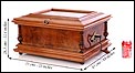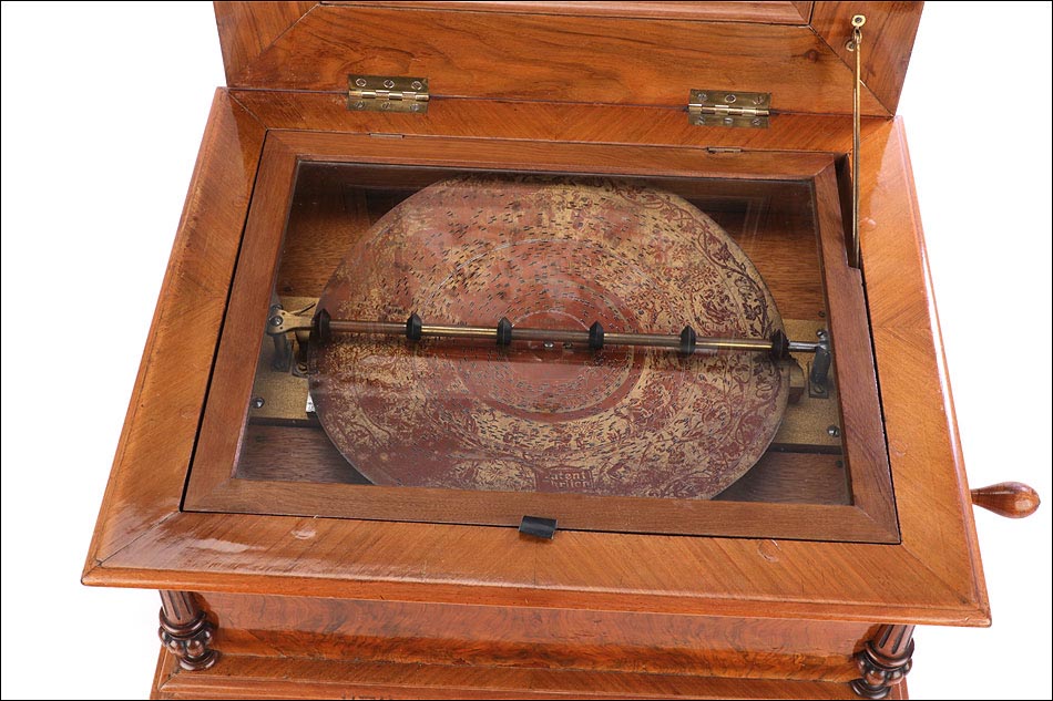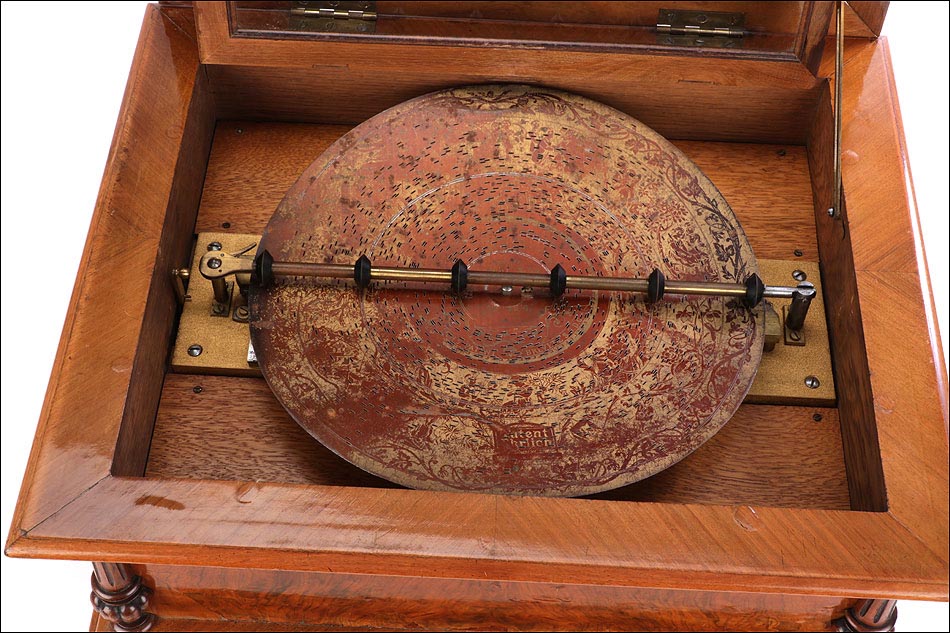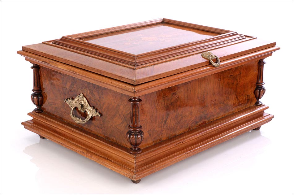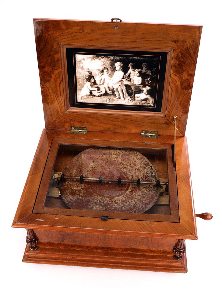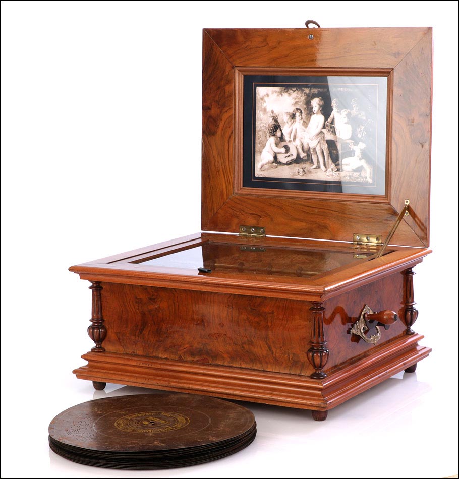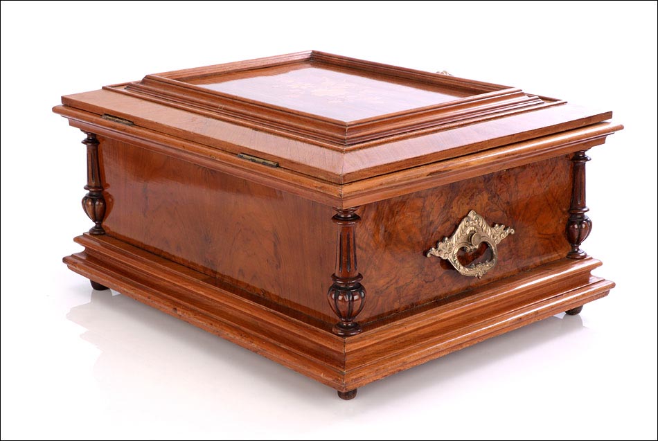 Antigua caja de música de gran tamaño con doble peine, fabricada en Suiza en 1890 y en excelente estado de funcionamiento. La caja se presenta con 14 discos de 34,5 cm originales de época; el mecanismo lleva sistema de doble peine que genera un sonido sublime, limpio y claro. El cuerpo de madera maciza y chapada conserva el barniz original en excelentes condiciones, sin restauración alguna. Está fabricado en madera de nogal y muestra una magnífica decoración en frisage (la veta de la madera hace un diseño de rombo) y lleva incrustaciones de marquetería. La decoración incluye columnas torneadas y molduras fresadas a mano.