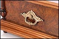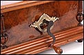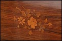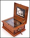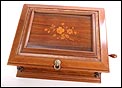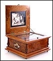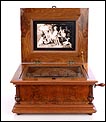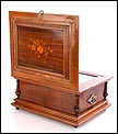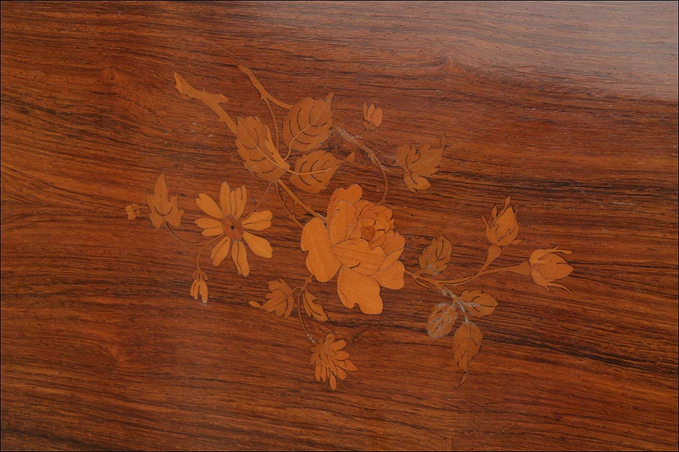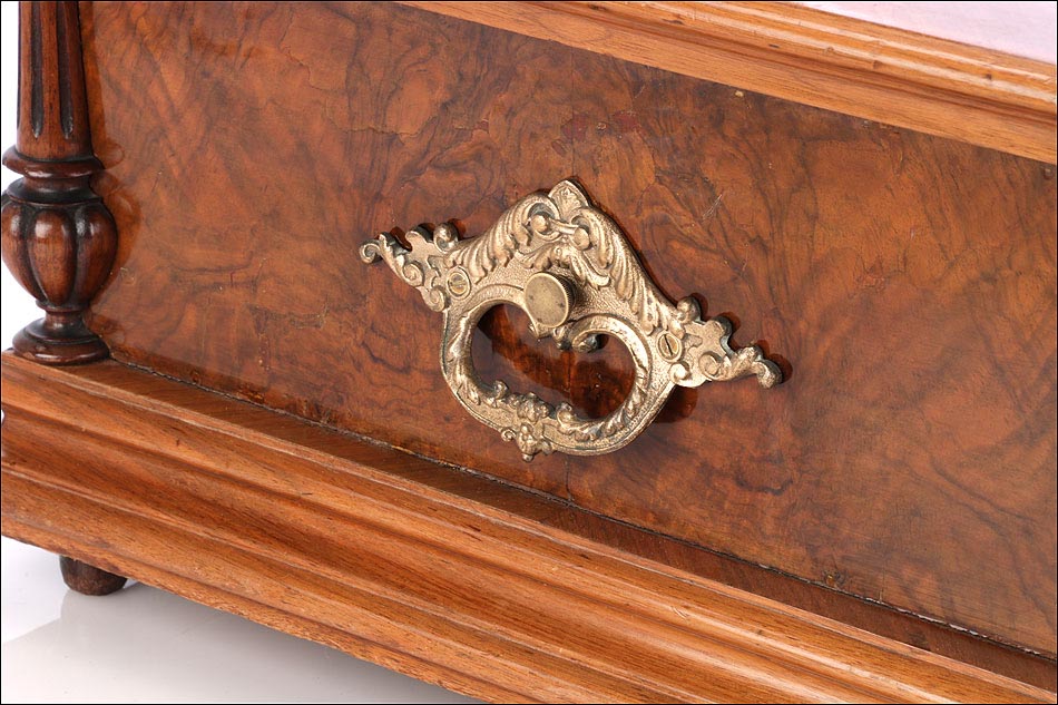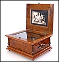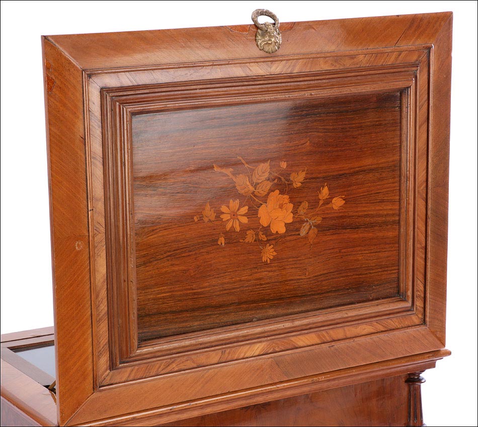 La tapa de la caja lleva un delicado motivo floral de marquetería, con un ramillete en madera de limoncillo sobre un fondo de nogal. La marquetería está en magníficas condiciones y conserva todo su encanto origina. Los laterales de la caja están revestidos de chapa de raíz de nogal, al igual que el interior de la tapa. Todas las superficies de madera, incluyendo el interior, muestran el precioso acabado a muñequilla original que aumenta la belleza de la madera noble. En el interior de la tapa, las chapas de nogal enmarcan una encantadora fotografía antigua en la que un grupo de niños forman una alegoría de la música en un fondo bucólico. La fotografía está en magníficas condiciones y lleva un elegante marco negro con filo dorado.